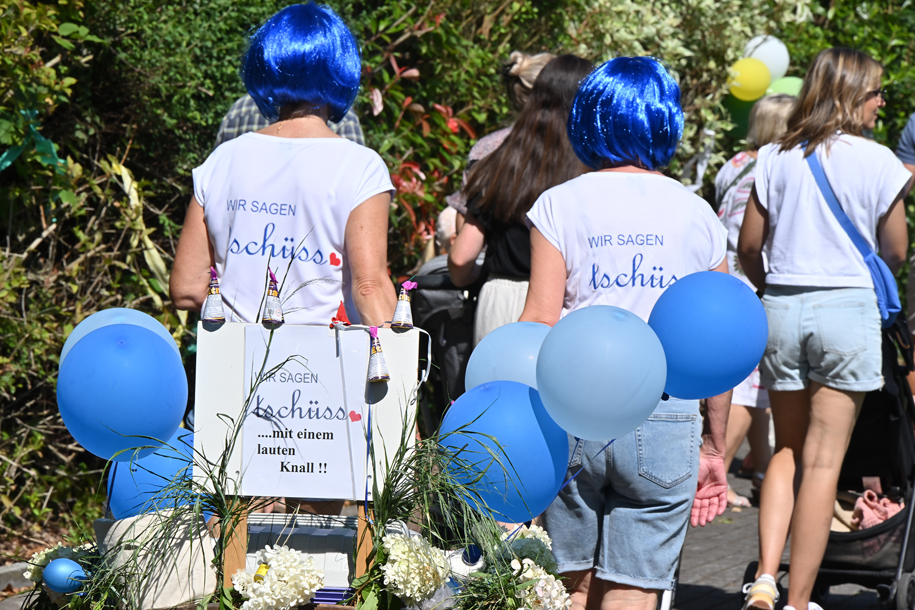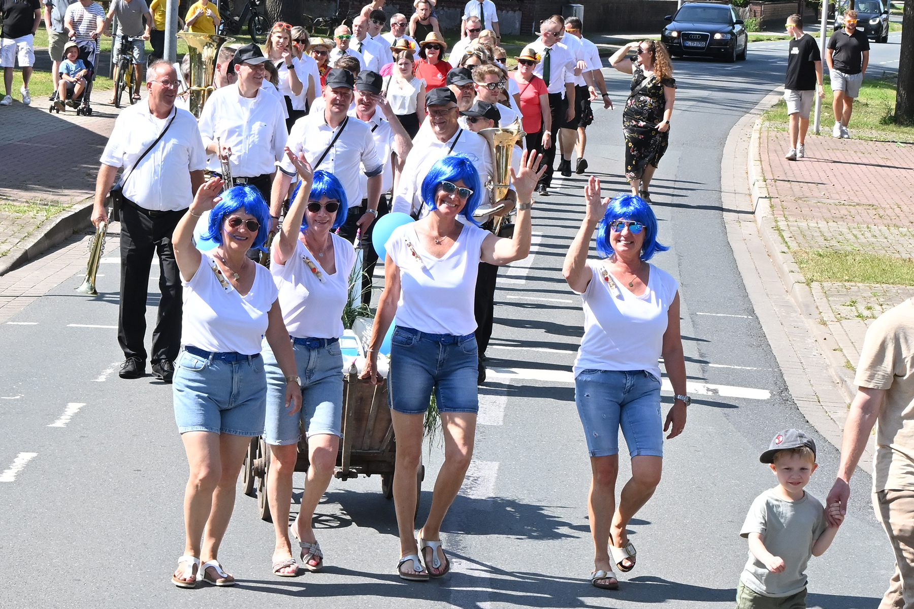 Um 13 Uhr setzte sich der bunte Festumzug in Bewegung und musste zum ersten König nicht weit ziehen, denn die erste Scheibe wurde direkt am Treffpunkt aufgehängt. Lichtpunktkönig Matz Thieleking erhielt als Erster in diesem Jahr seine Scheibe. Zuvor hatte bereits die Musikkapelle Diekholzen am Treffpunkt für die musikalische Einstimmung gesorgt. Zum letzten Mal dabei waren vier Damen mit blauen Perücken, die den Bagagewagen zogen. Seit mehr als 30 Jahren sorgten sie für die Verpflegung im Umzug. Zunächst nur für die Damenabteilung, inzwischen sind sie jedoch längst eine Institution in diesem Umzug und versorgen alle Teilnehmer. Mit einem "und tschüss" auf ihren Shirts verabschiedeten sie sich. Nun wird ihre Aufgabe auf andere Personen übertragen.