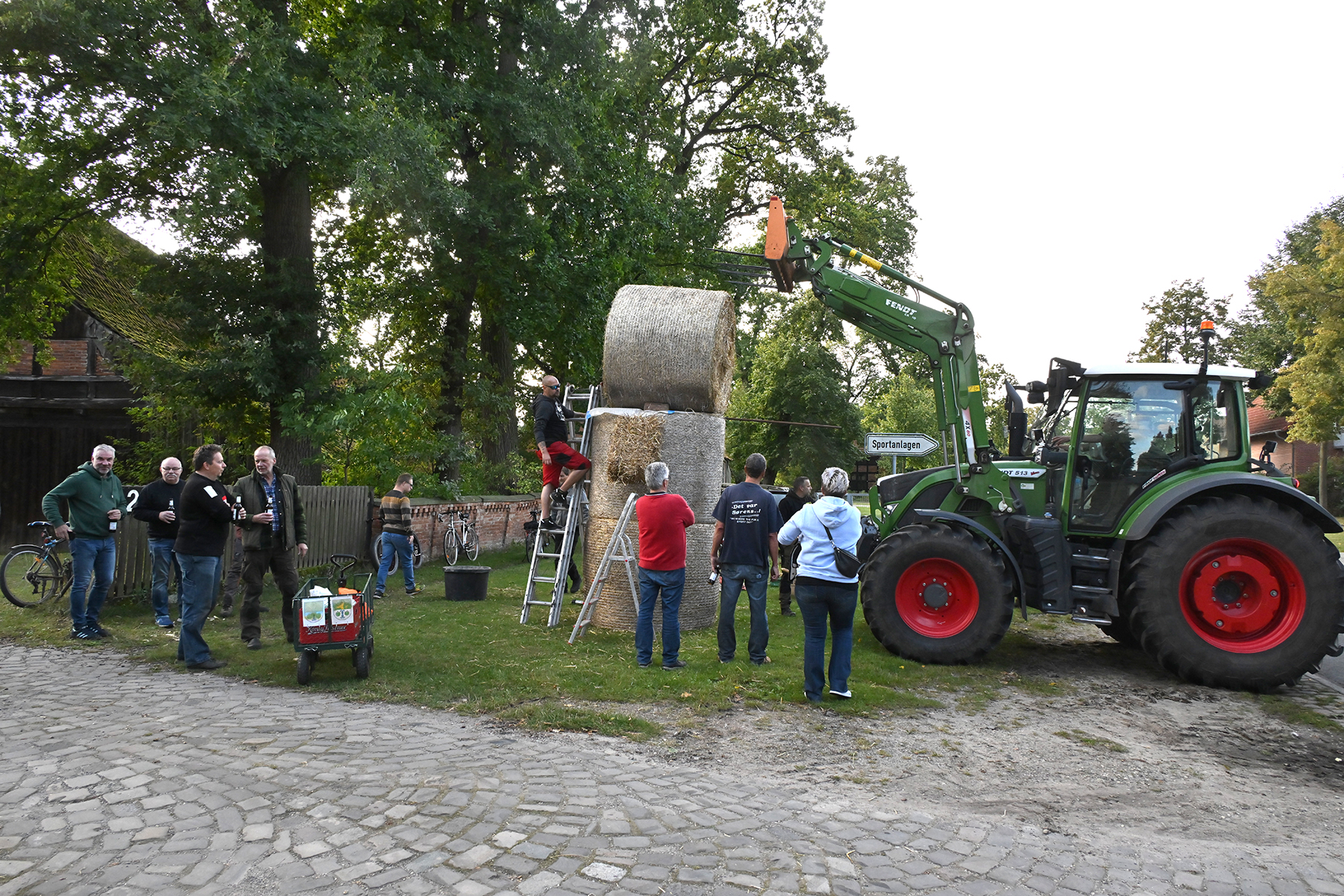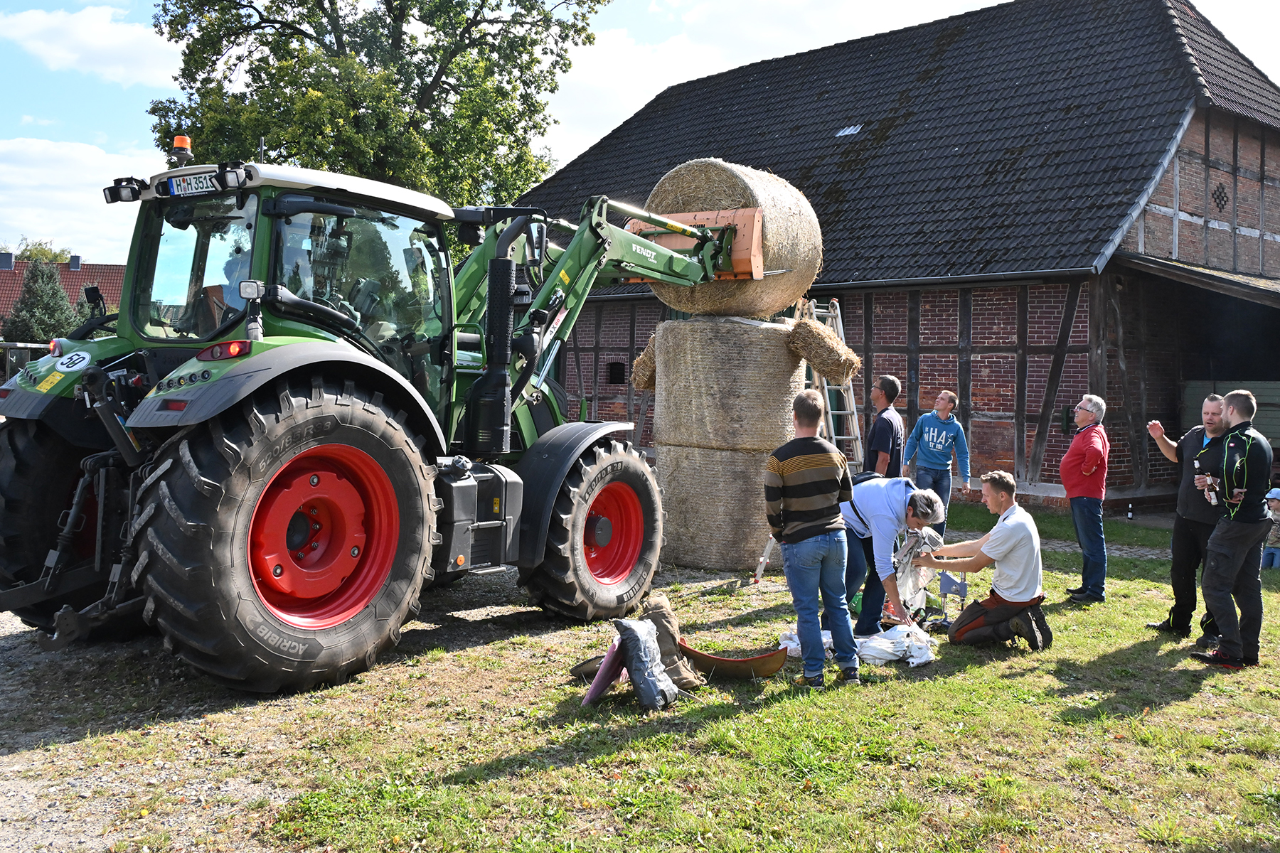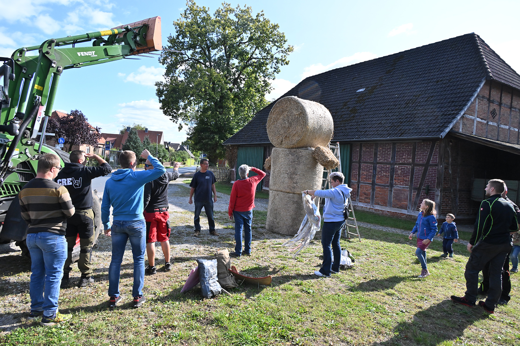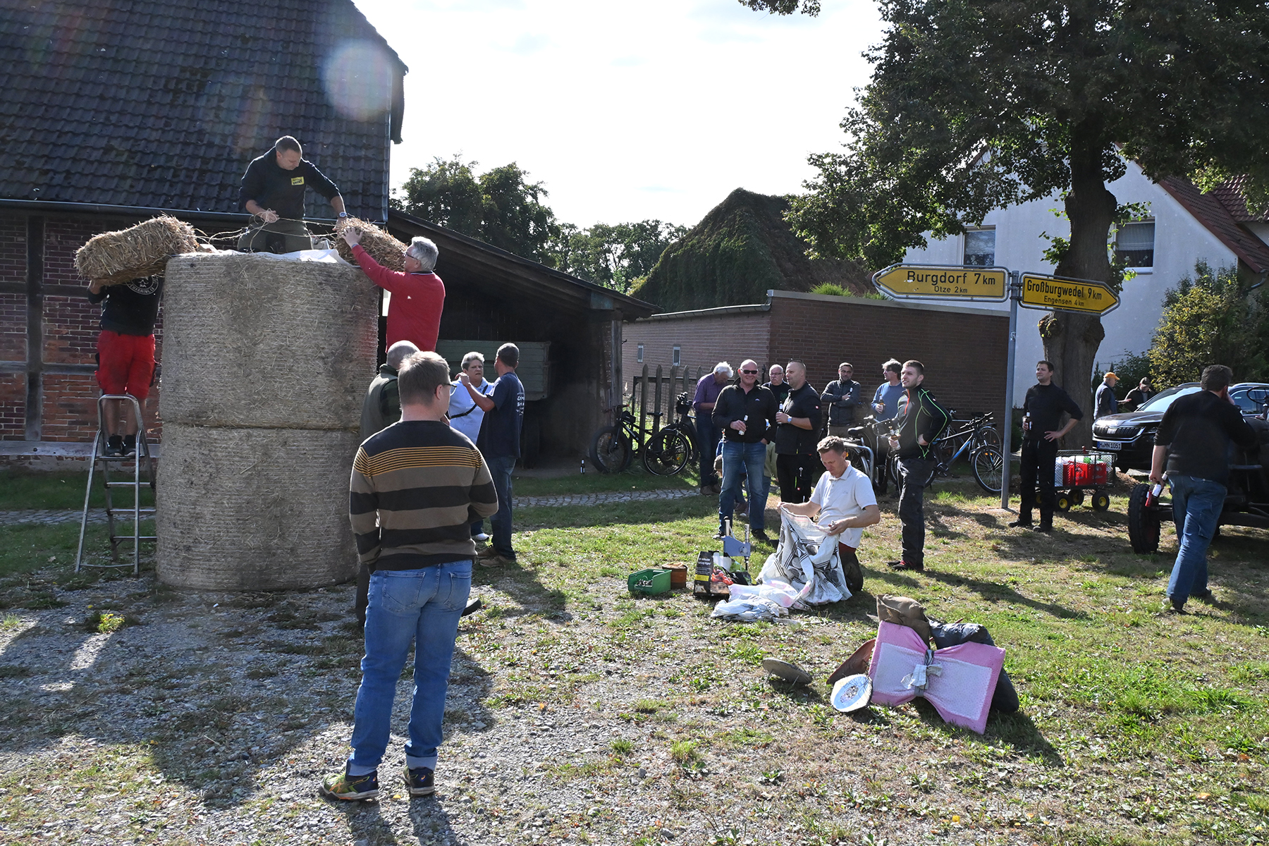Nach rund zweieinhalb Stunden waren gestern dann die Erntepuppen aufgestellt. Auch die Erntekronen waren fertiggestellt, sodass der arbeitsreiche und erfolgreiche Tag mit einem gemeinsamen Grillen auf dem Hof von Andreas und Karin Buchholz gefeiert werden konnte.