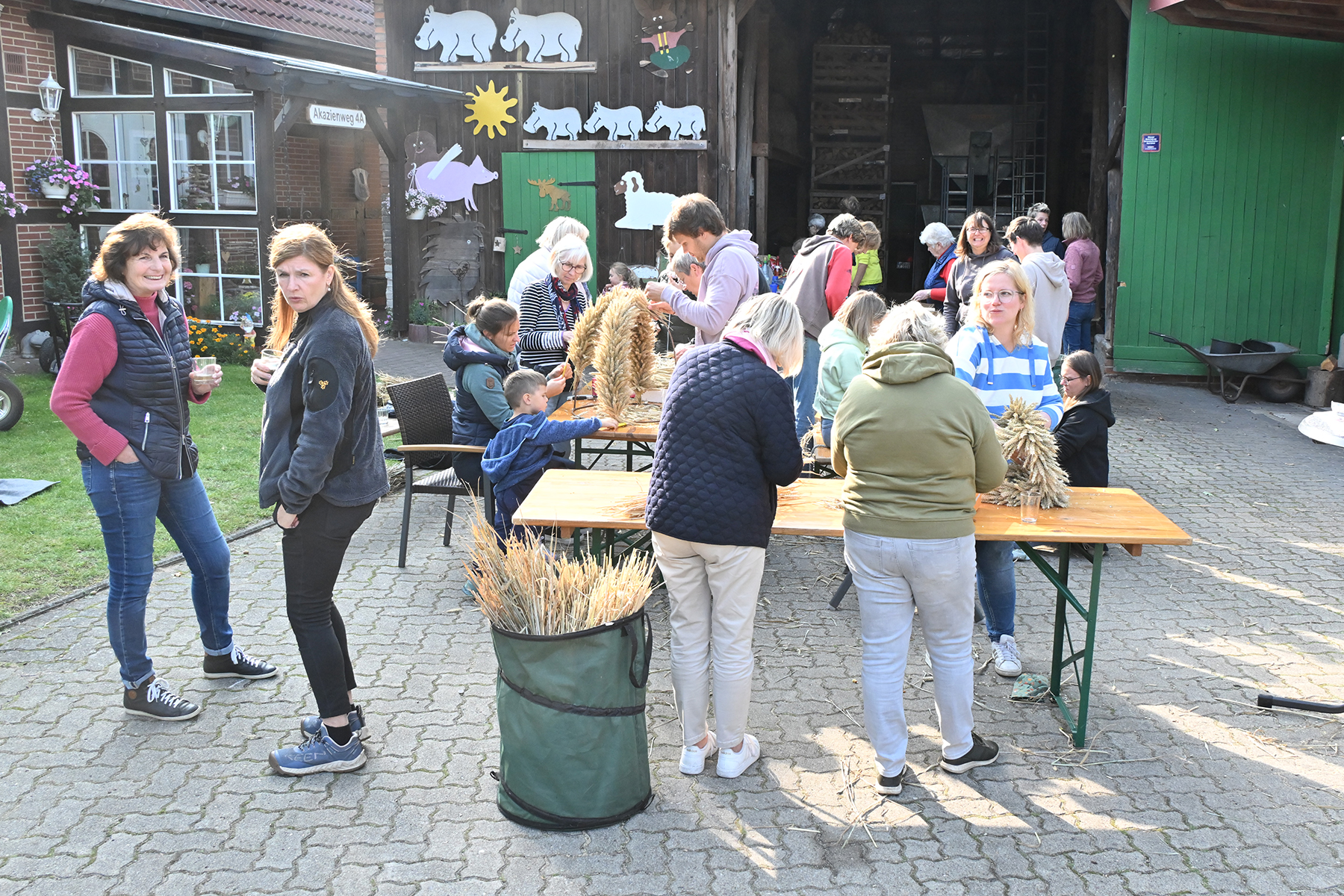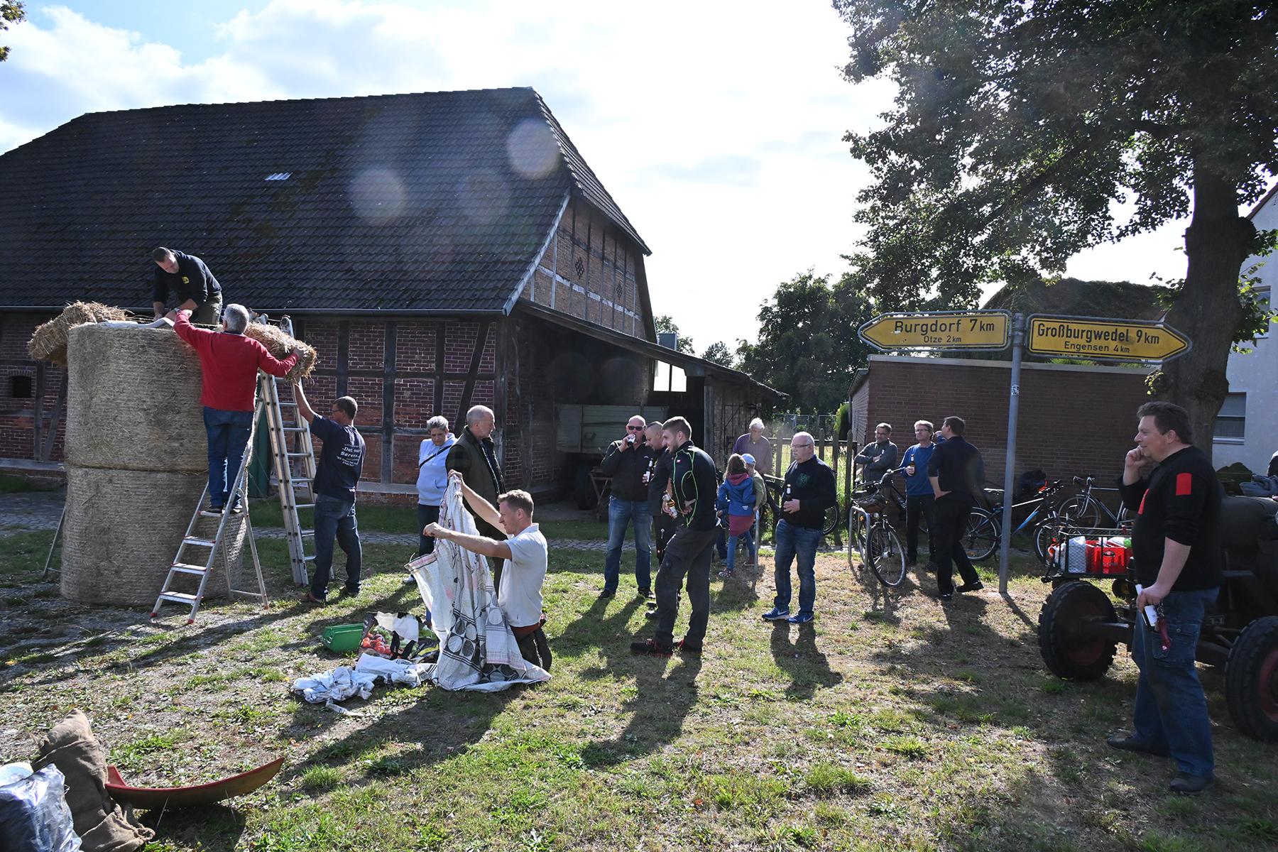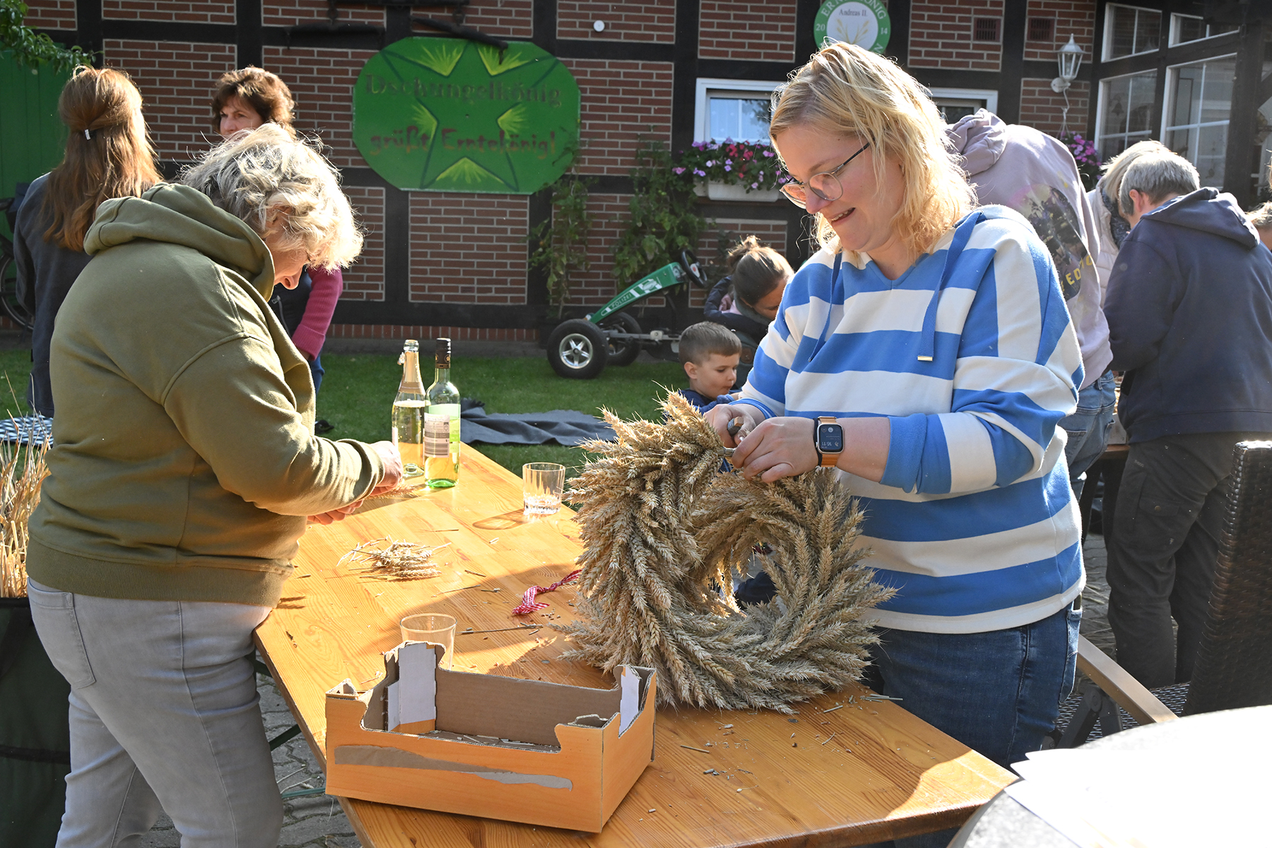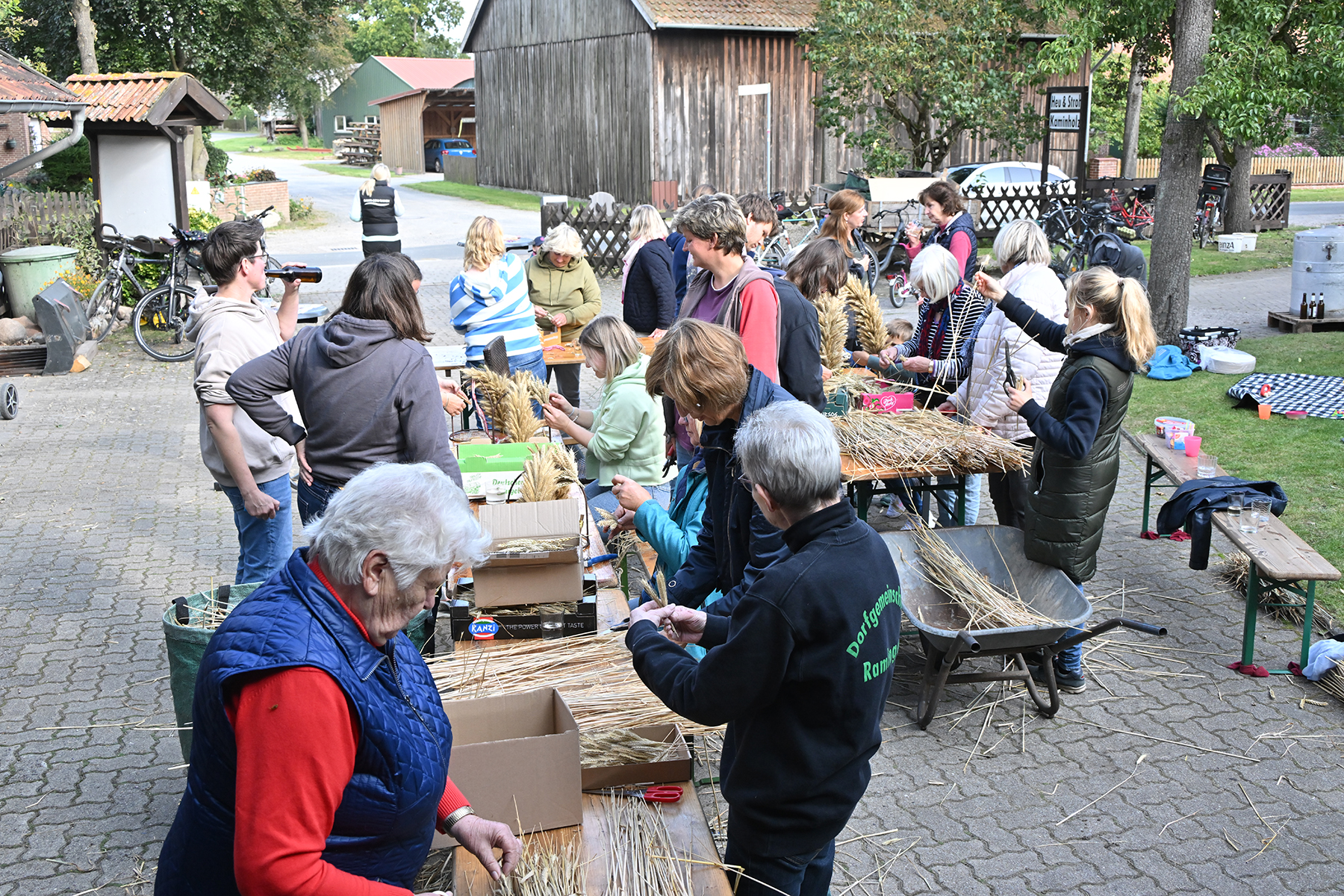 Am gestrigen Sonnabend, 14. September 2024, trafen sich rund 70 Ramlinger, um das Erntefest vorzubereiten. Hierzu gehören das Binden der fünf Erntekronen, die später das Zelt und das Haus des neuen Erntekönigs schmücken, sowie das Aufstellen der Erntepuppen an den Ortsausgängen der Grünen Allee und in der Dorfmitte.