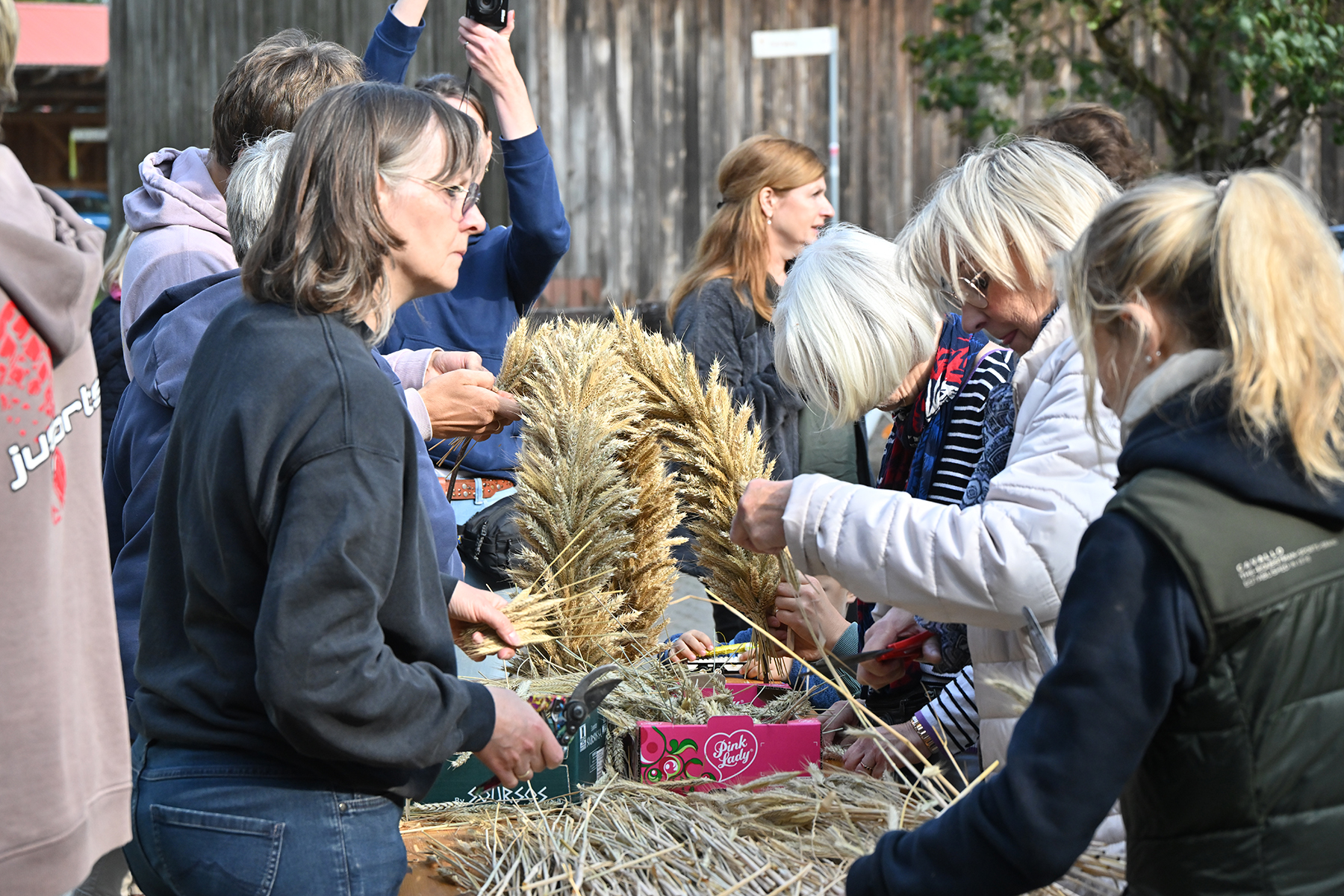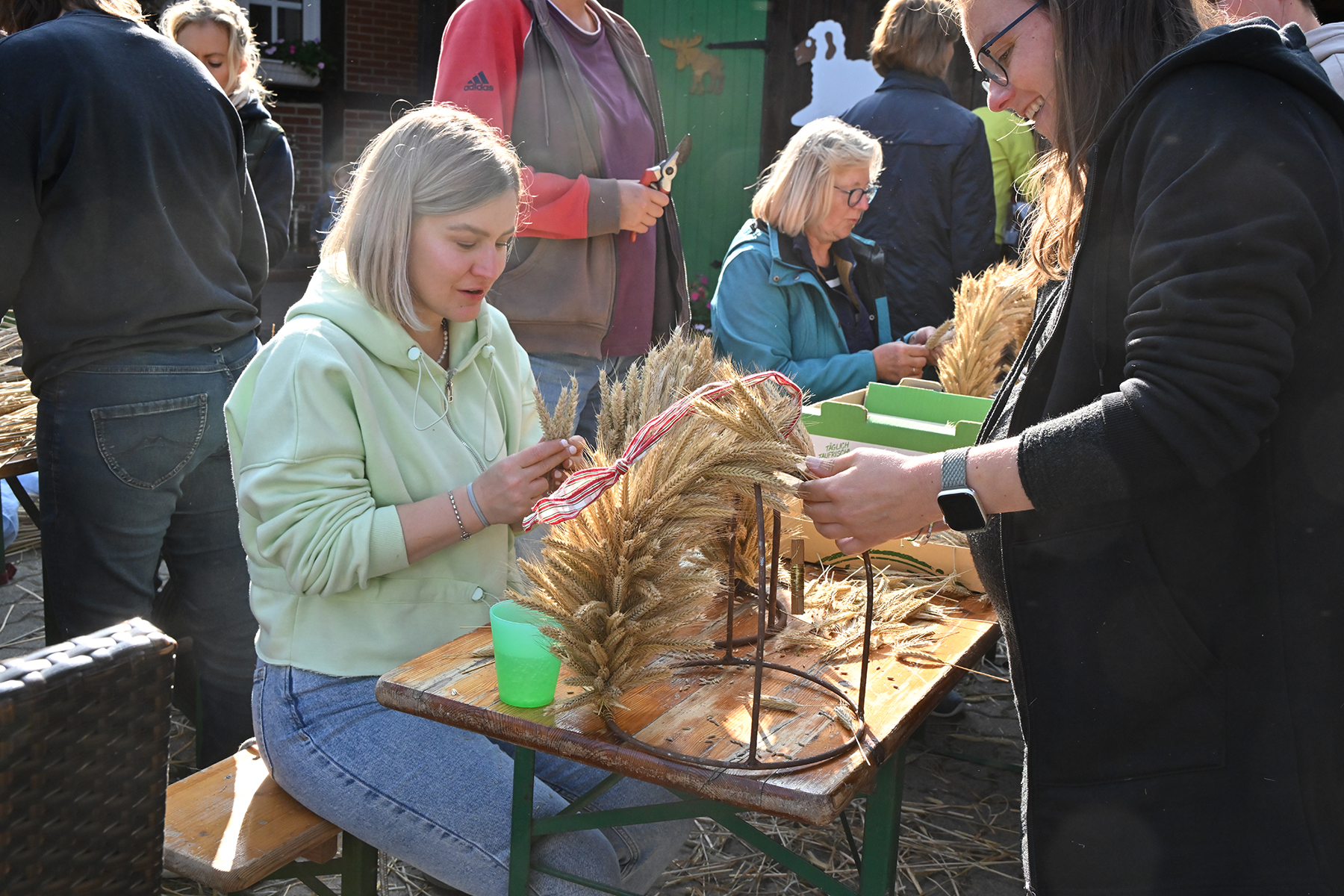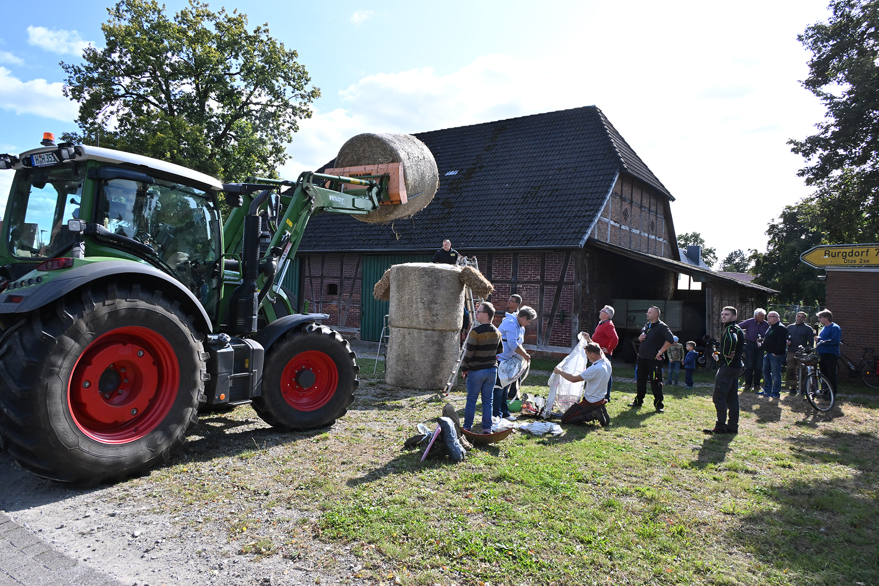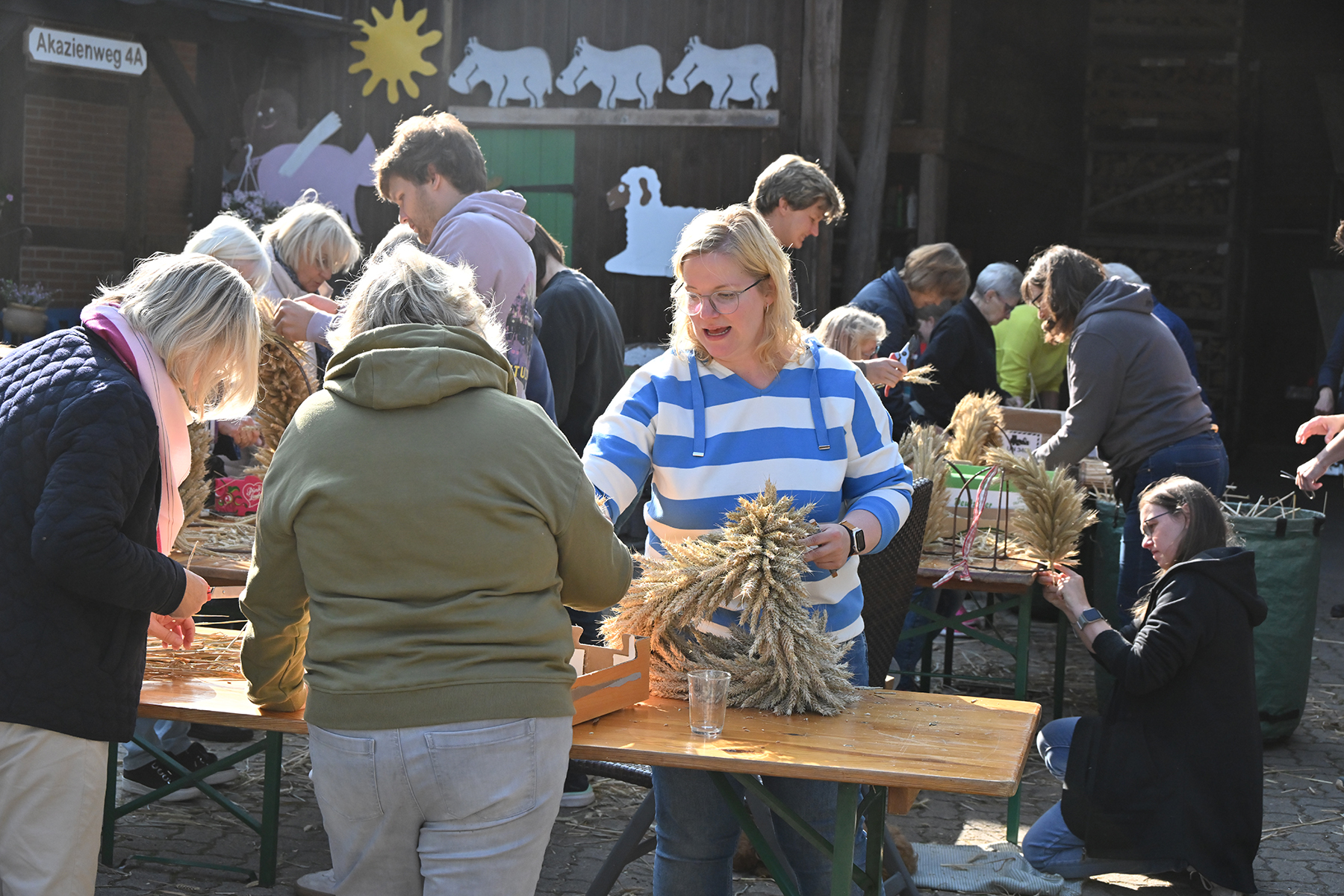 Am gestrigen Sonnabend, 14. September 2024, trafen sich rund 70 Ramlinger, um das Erntefest vorzubereiten. Hierzu gehören das Binden der fünf Erntekronen, die später das Zelt und das Haus des neuen Erntekönigs schmücken, sowie das Aufstellen der Erntepuppen an den Ortsausgängen der Grünen Allee und in der Dorfmitte.
