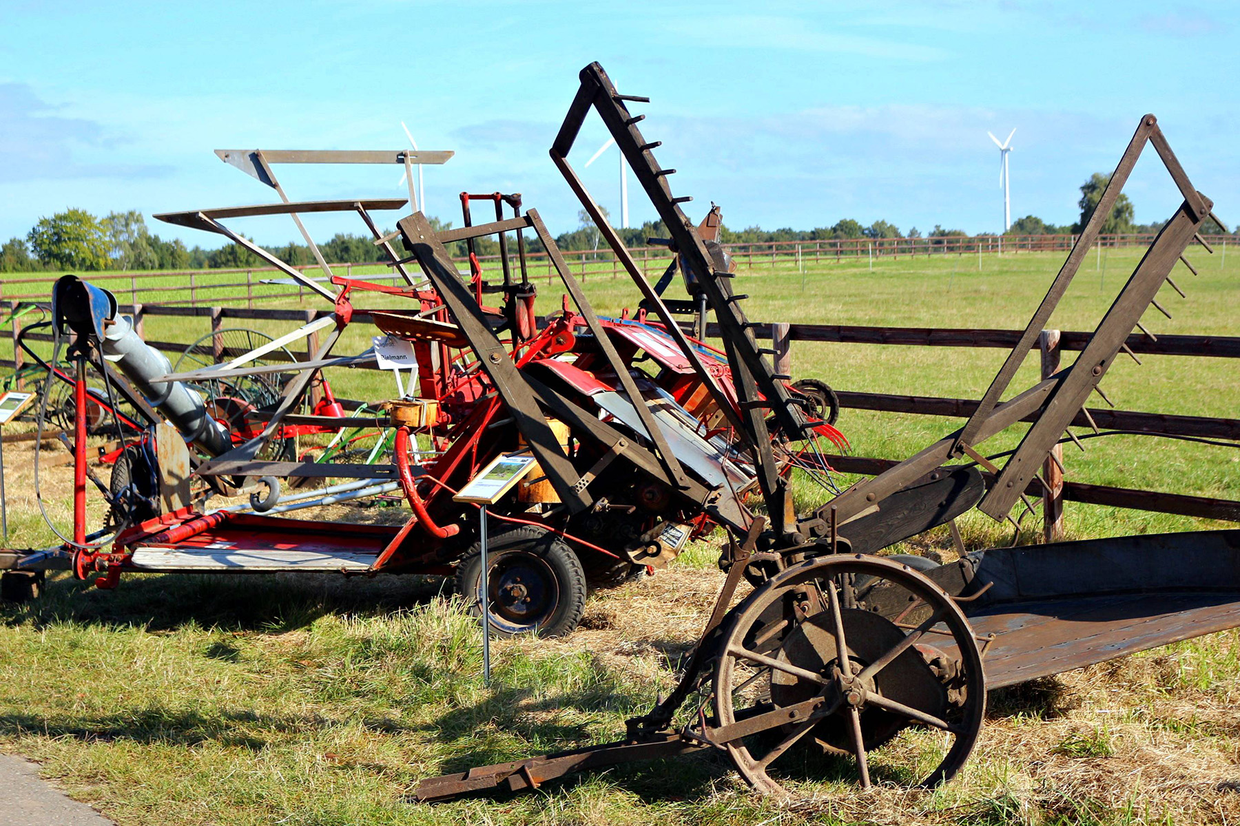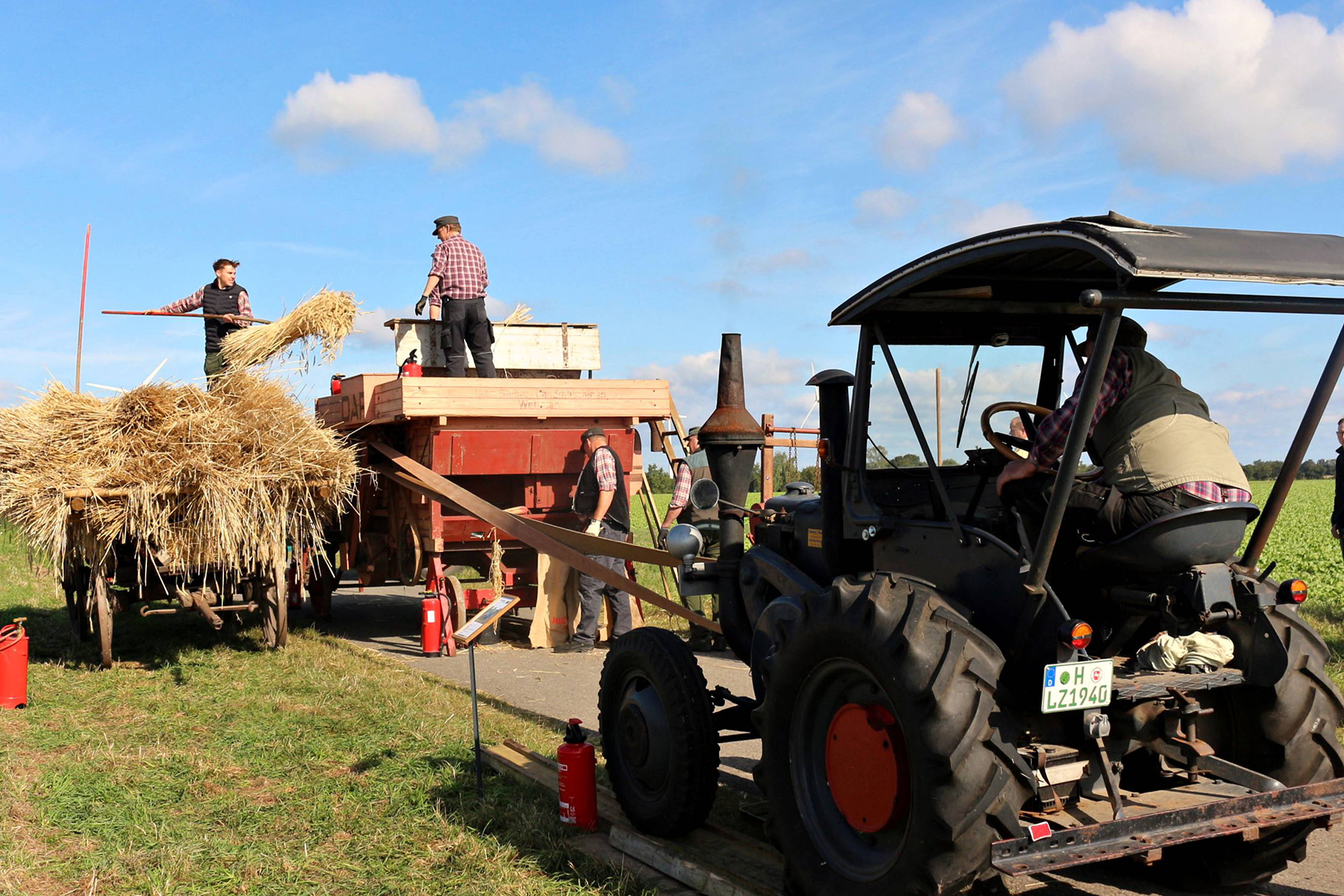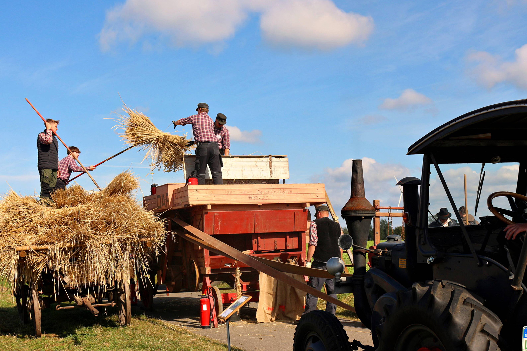 Im weiteren Verlauf der Veranstaltung bekamen die immer zahlreicher eintrudelnden Gäste das Dreschen wie anno dazumal mit Dreschkasten und Ackerschlepper "Lanz Bulldog", die Bodenbearbeitung mit einem Aufreißpflug sowie das Pflügen, Eggen, Drillen und Säen wie zu Urgroßväterszeiten vorgeführt.