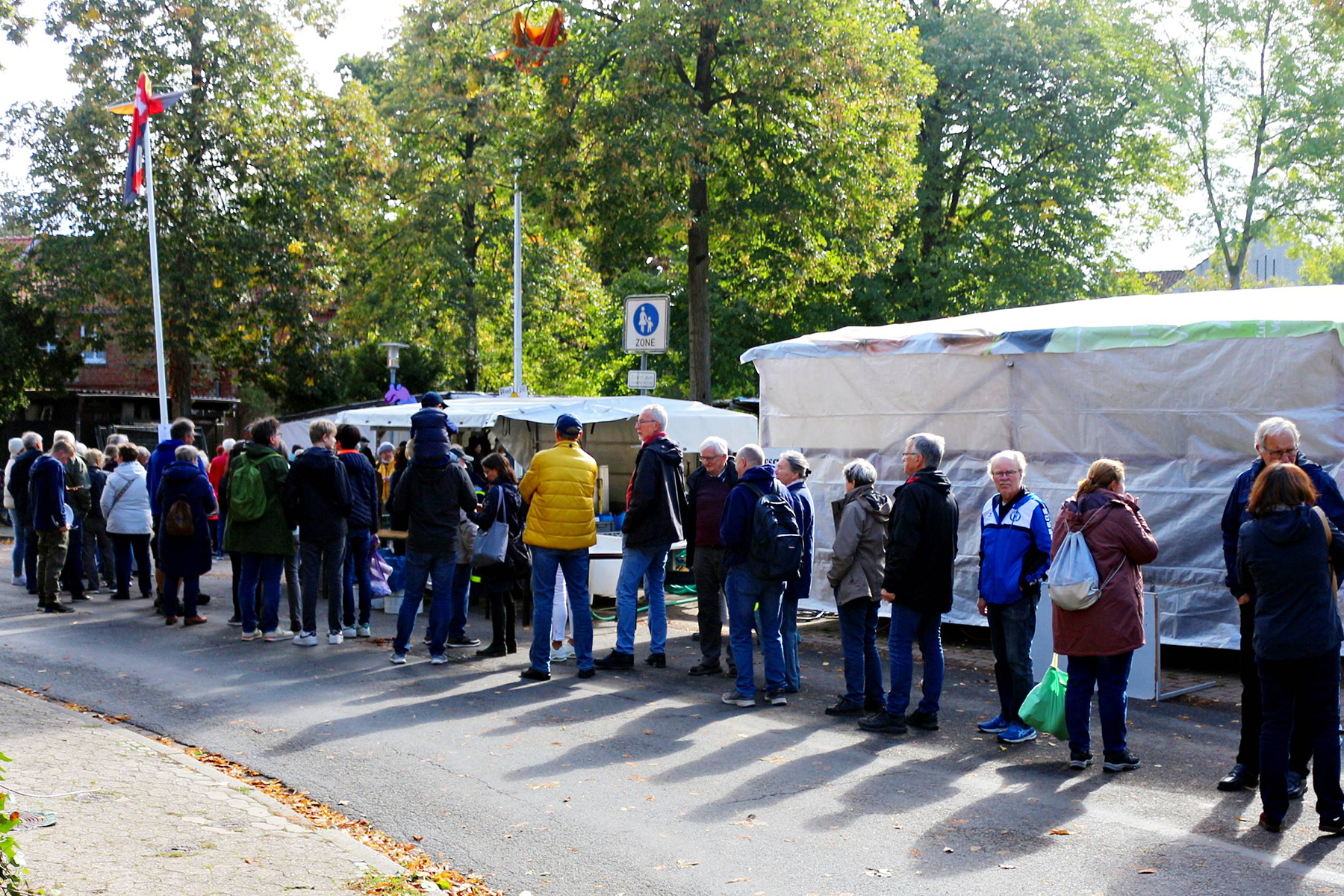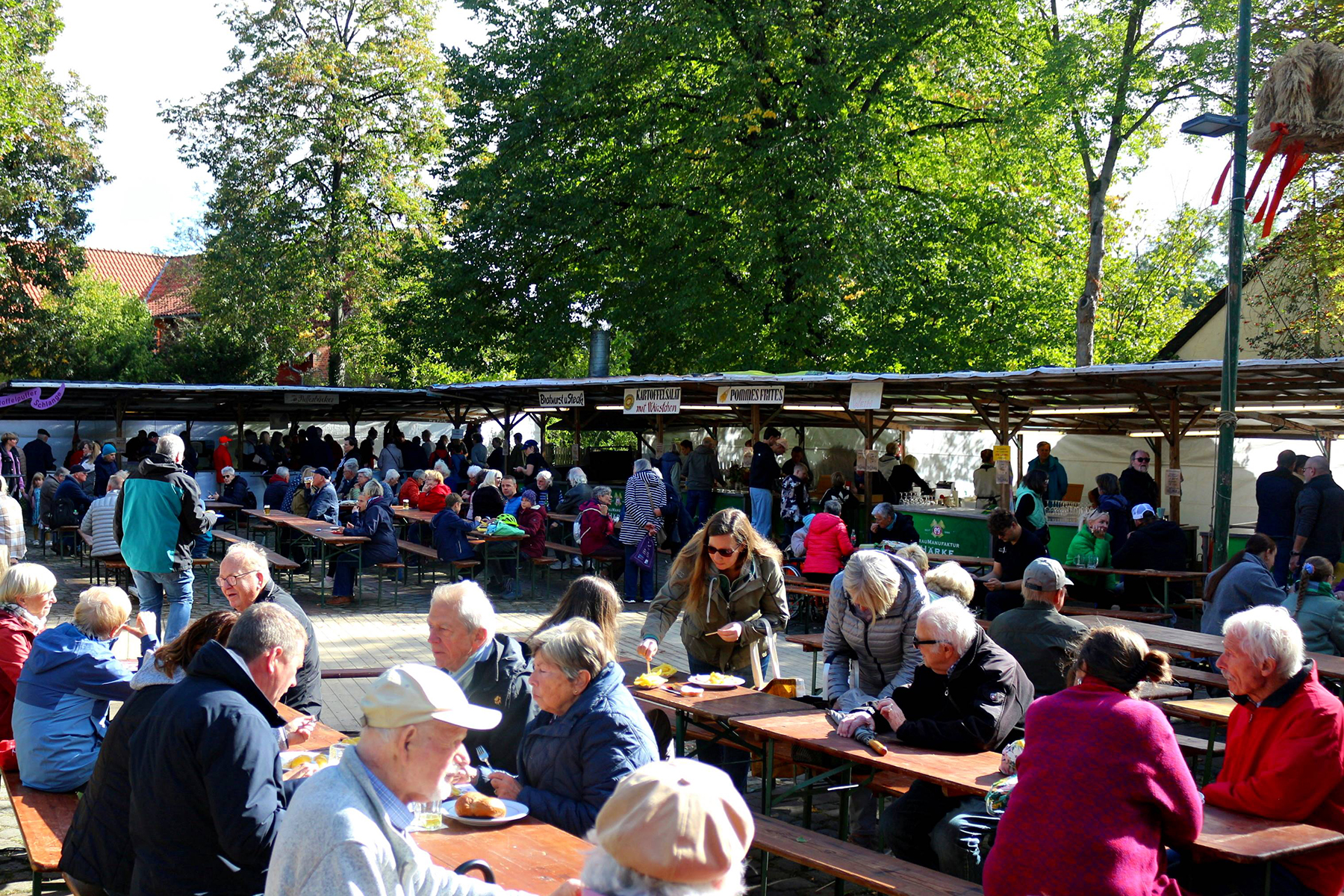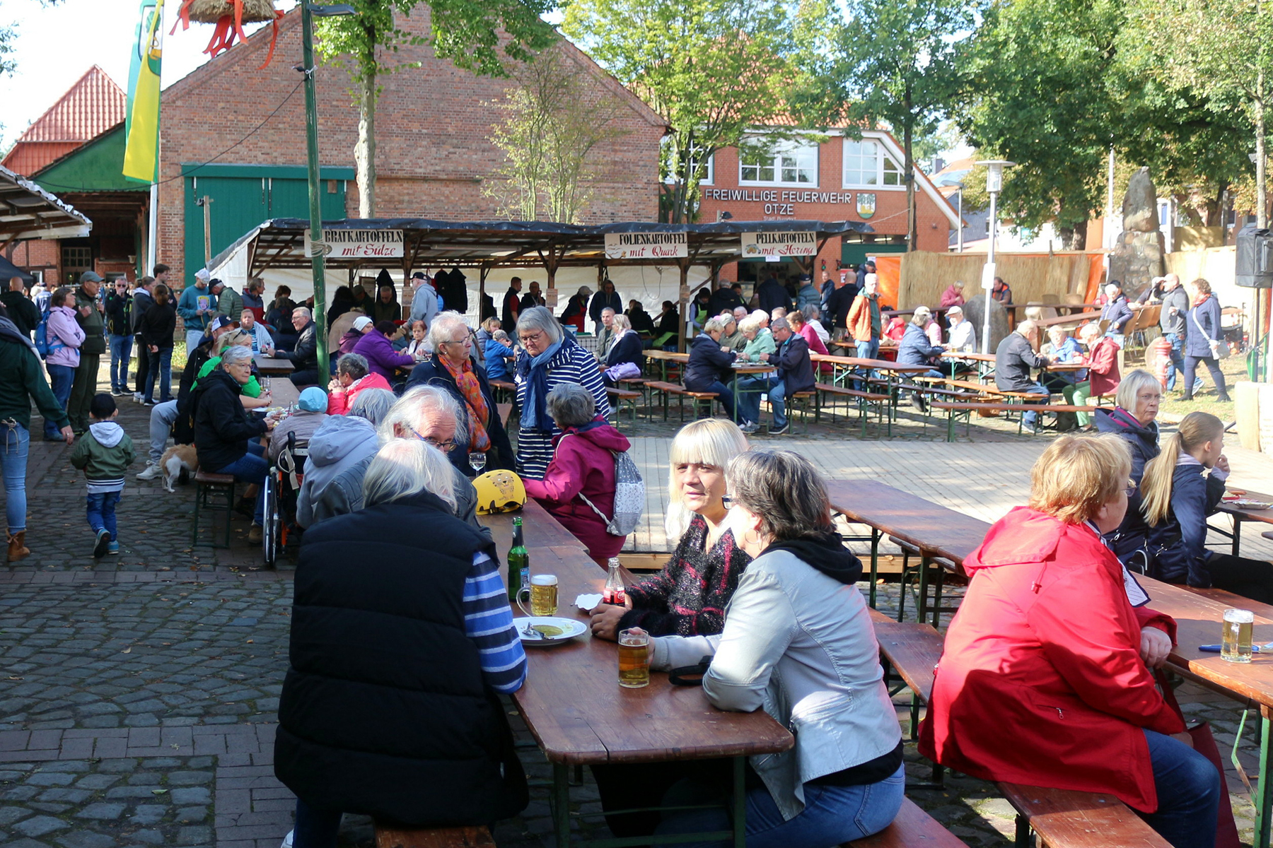 Wie üblich wurde der Kartoffelmarkt mit dem Anbringen der geflochtenen Erntekrone und einem Tusch vom Orchester Berggarten aus Otternhagen offiziell eröffnet, nachdem Hans-Jörg Fischer die Besucher willkommen geheißen hatte. Und schon wenige Augenblicke später hatte sich an der Ausgabe eine lange Schlange von Kennern der legendären Otzer Kartoffelpuffer gebildet. Aber auch andere frisch zubereitete Knollengerichte hatten ihre Feinschmecker.