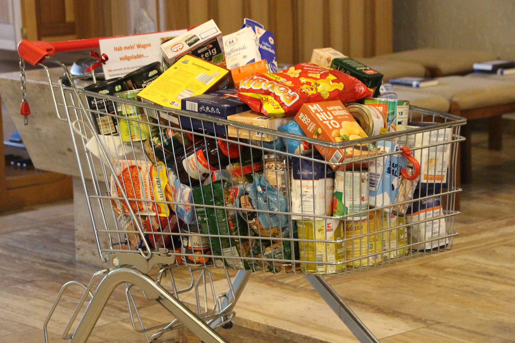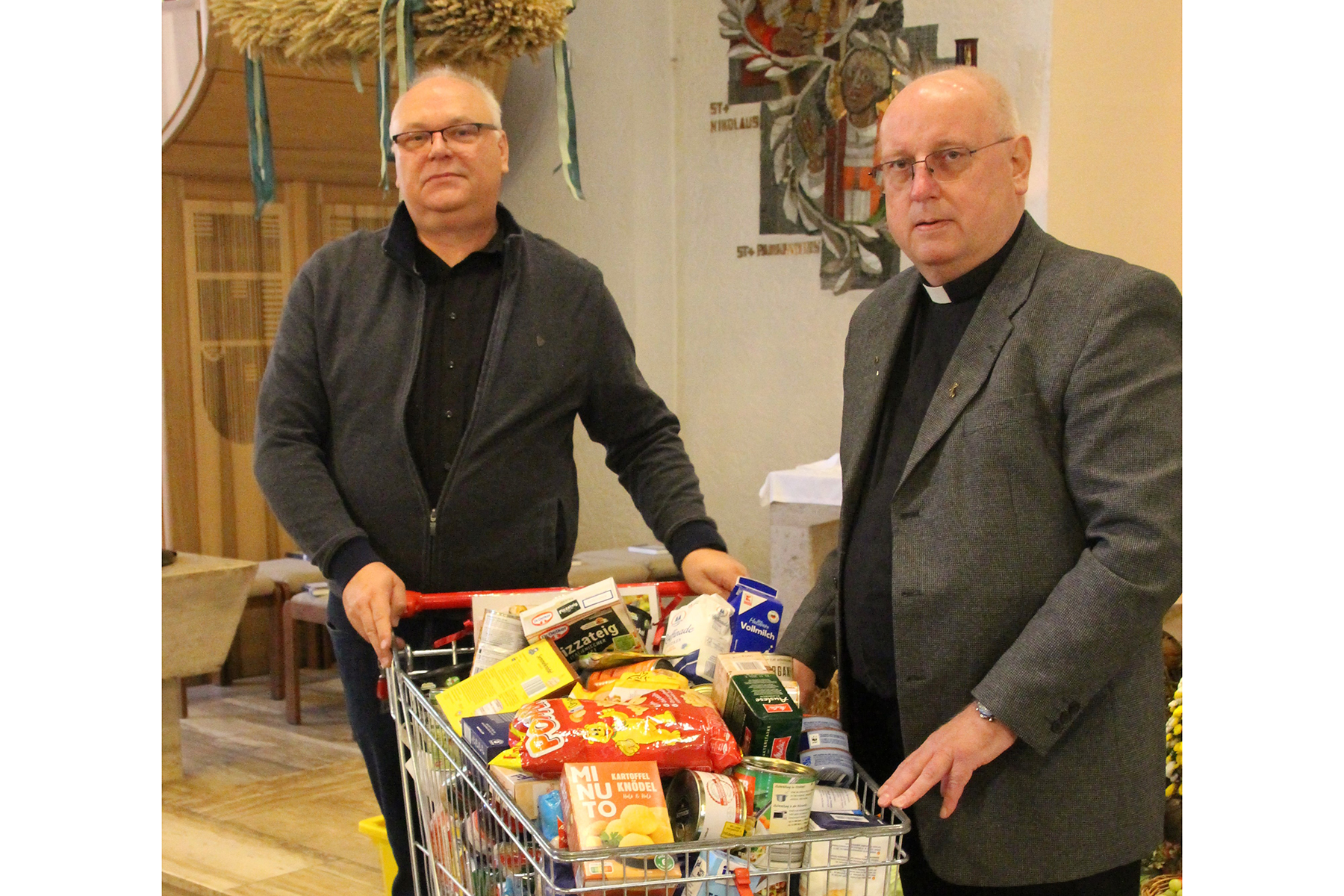 Diese Dankbarkeit zeigt sich beim Erntedankgottesdienst im St. Nikolaus. Körbe voller Obst und Früchte der Felder bereicherten den Altarraum. Und dazu ein reichlich gefüllter Einkaufswagen, der die vergangenen Wochen im Eingangsbereich der Kirche stand.