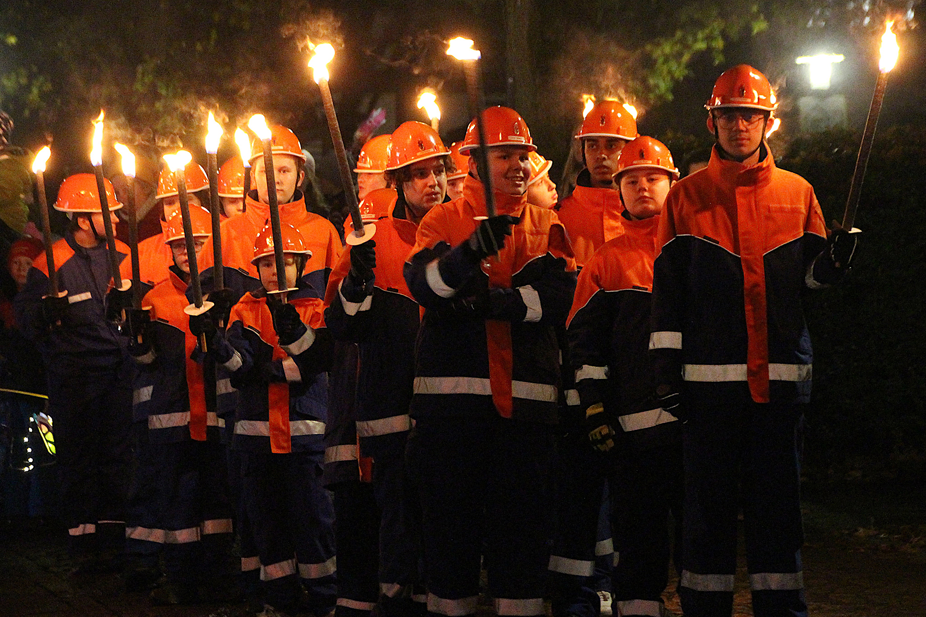 Anschließend ging es mit den bunten Laternen zur St. Nikolaus-Kirche ins Lange Mühlenfeld, angeführt durch die Fackelträger der Jugendfeuerwehr.