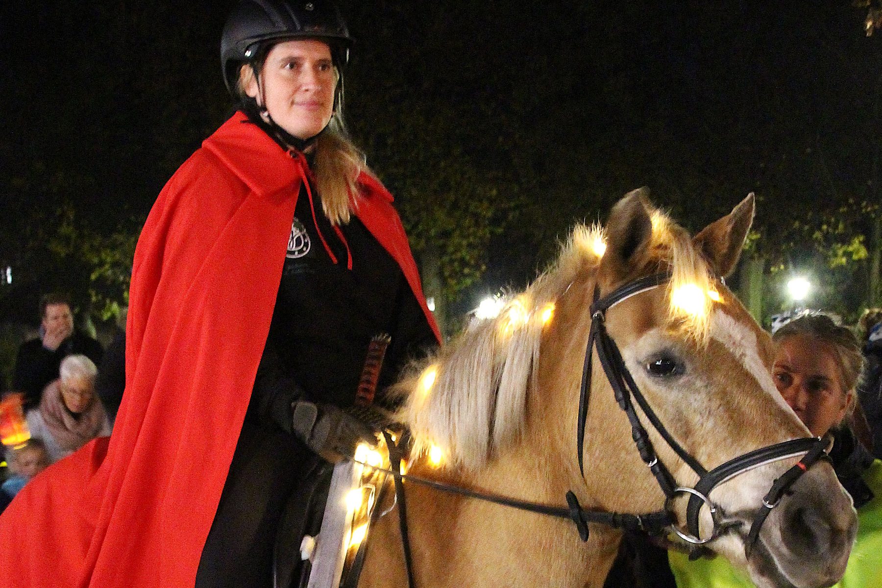 Ums Teilen ging es auch, als die zahlreich erschienenen Eltern, Omas und Opas mit ihren Kindern und Enkelkindern die Stadtkirche wieder verließen. Sie erhielten alle ein Hörnchen. Hoch zu Roß wartete auf dem Spittaplatz der heilige Martin. Der Posaunenchor von St. Pankratius spielte an der Post auf und Anne-Kathrin Albert, Clanpiperin der Clan MacKenzie Society of Germany, begleitete den Umzug mit dem Dudelsack. Sie wurde von Lucius und Marian flankiert, damit sie beim Spielen und Marschieren nicht unbeabsichtigt mit jemandem kollidierte.