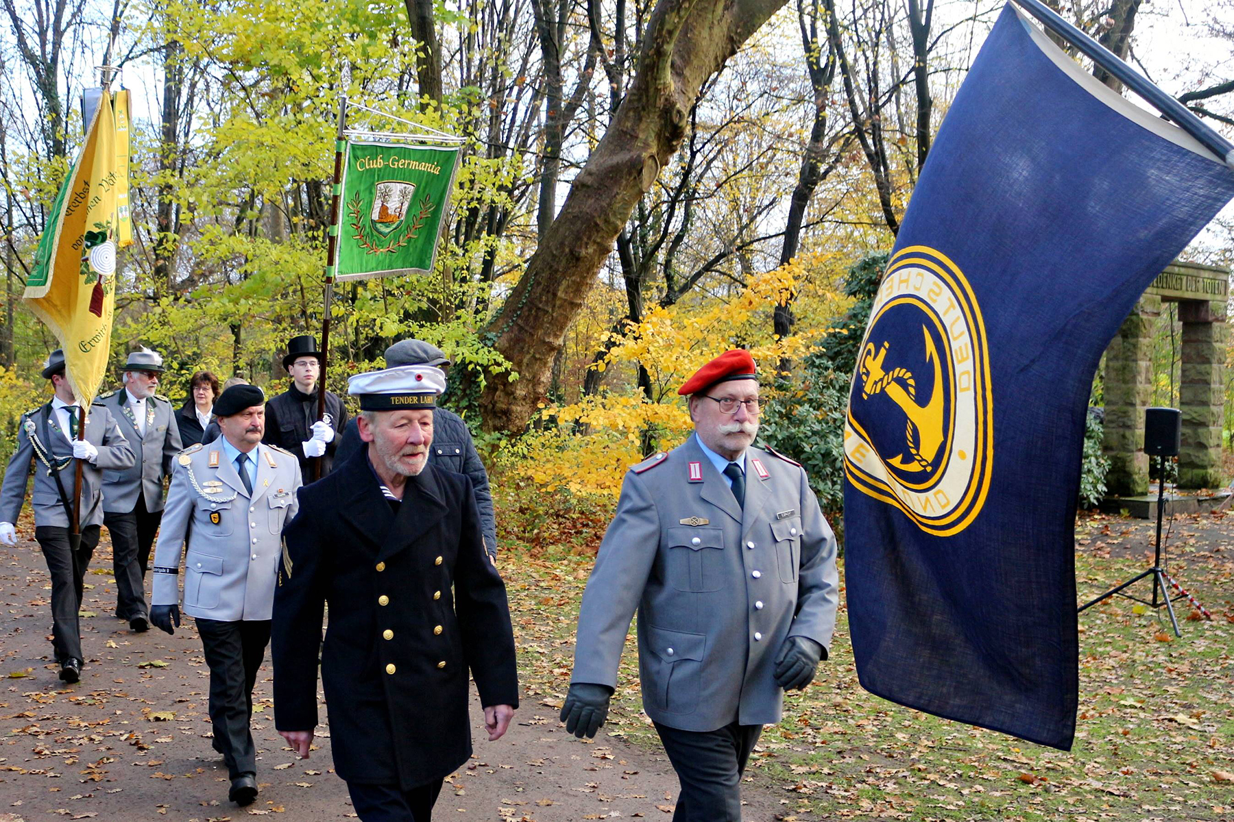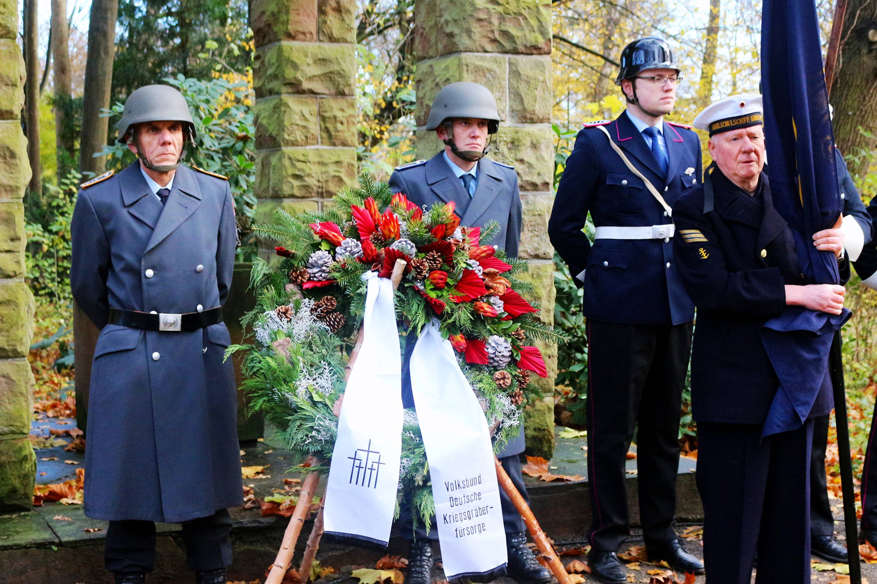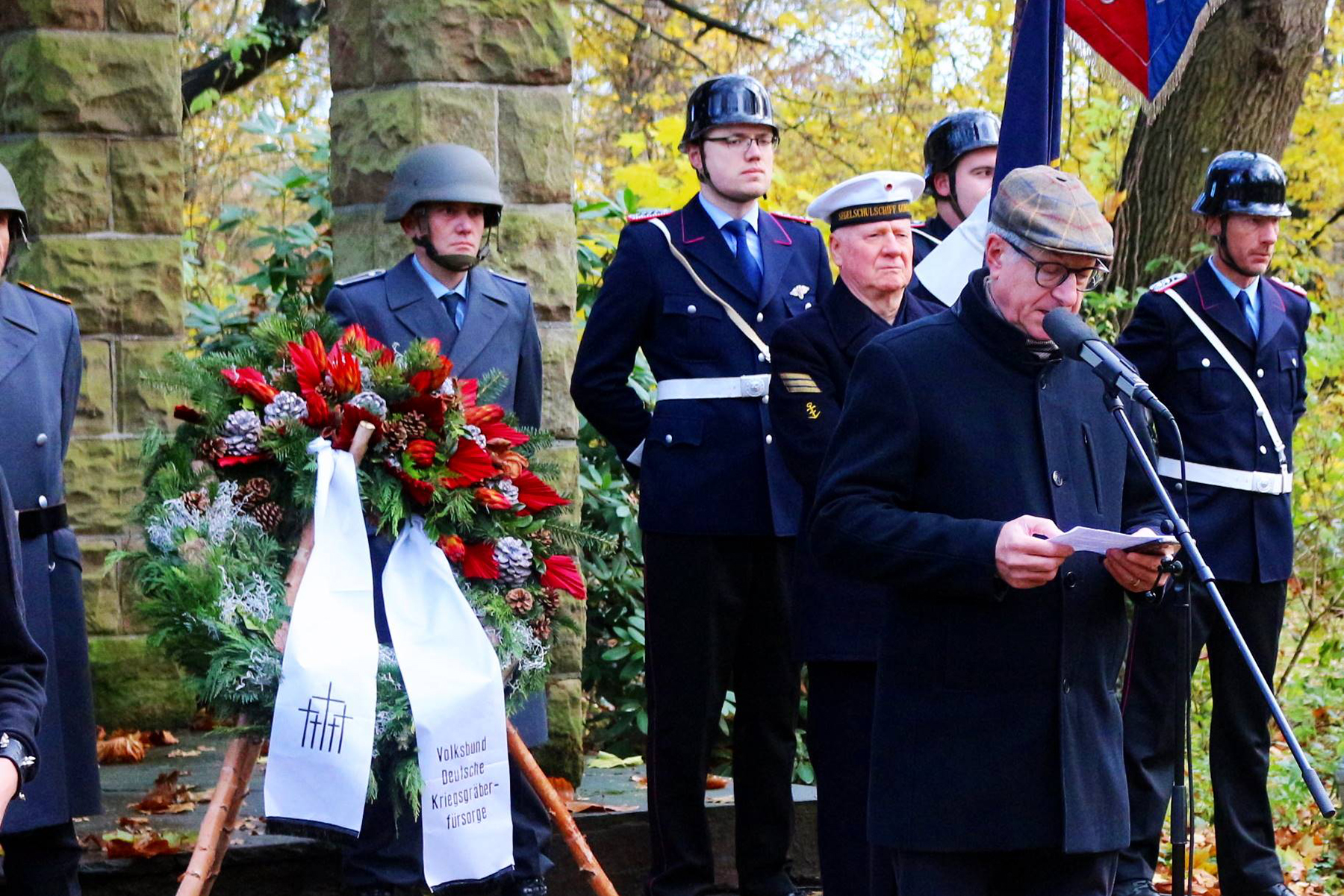 Nach dem von Arnim Pollehn vorgetragenen Totengedenken "Wir gedenken heute auch derer, die bei uns durch Hass und Gewalt Opfer geworden sind. Wir gedenken der Opfer von Terrorismus und Extremismus, Antisemitismus und Rassismus in unserem Land", legte die Reservistenkameradschaft den Kranz am Ehrenmal nieder.