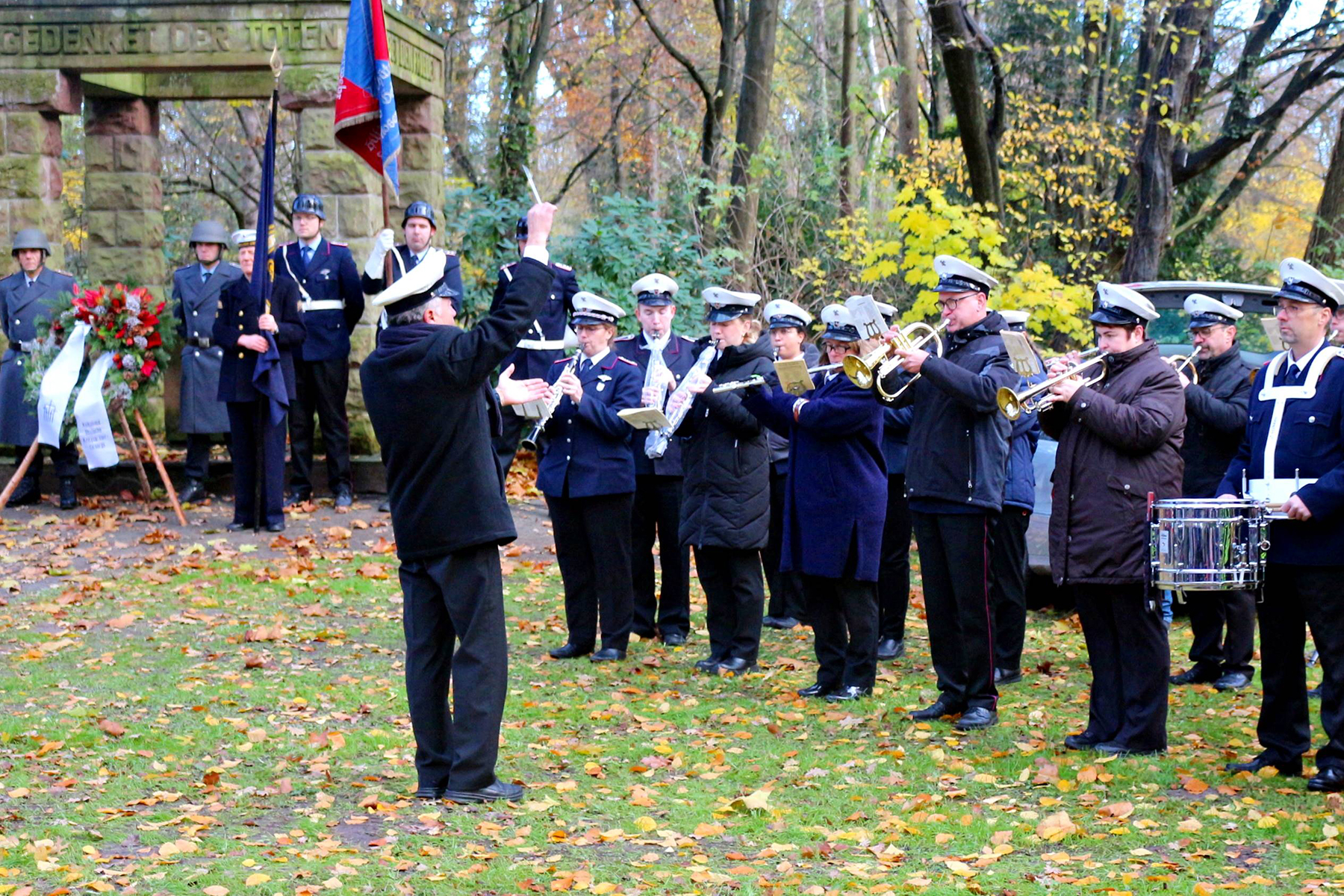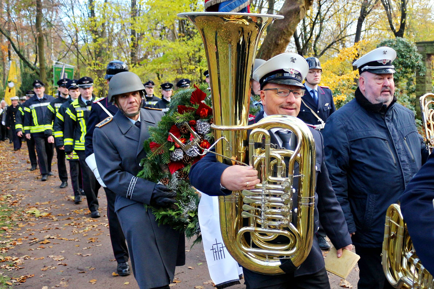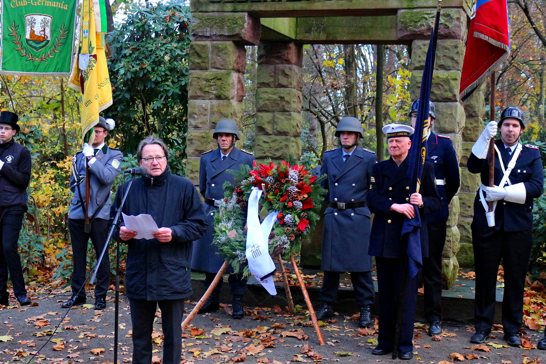 Nach dem von Arnim Pollehn vorgetragenen Totengedenken "Wir gedenken heute auch derer, die bei uns durch Hass und Gewalt Opfer geworden sind. Wir gedenken der Opfer von Terrorismus und Extremismus, Antisemitismus und Rassismus in unserem Land", legte die Reservistenkameradschaft den Kranz am Ehrenmal nieder.