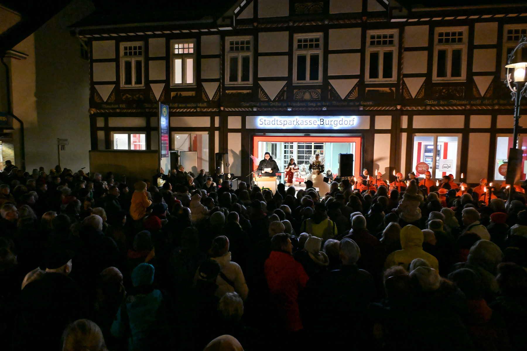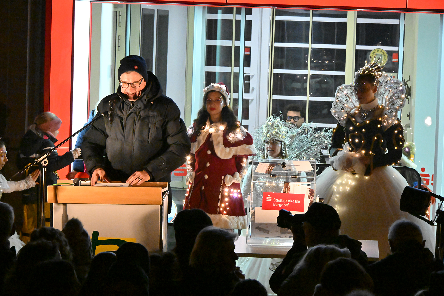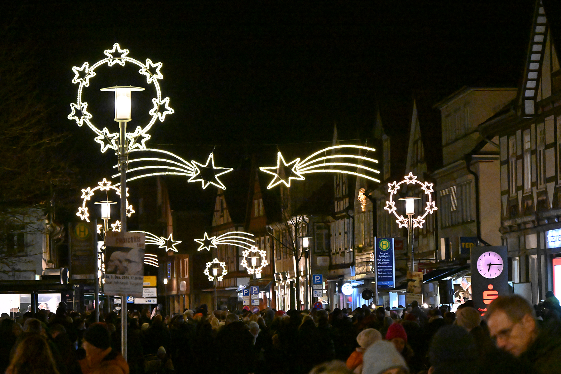 Kurz nach 18 Uhr stimmte Bürgermeister Armin Pollehn den Countdown an. Unterstützt wurde er dabei vom fünfjährigen Leonard, der mit großer Freude den roten Knopf drückte, um die Weihnachtsbeleuchtung einzuschalten. Bürgermeister Pollehn hob in seiner Ansprache die Einzigartigkeit der Burgdorfer Lichtwochen hervor und dankte den mehr als 70 Sponsoren, deren Unterstützung die Realisierung dieser stimmungsvollen Veranstaltung erst möglich gemacht hat. "Was wir hier auf die Beine stellen, ist wirklich einmalig in der Region", betonte Pollehn und lobte die Arbeit des Stadtmarketings und aller Beteiligten.