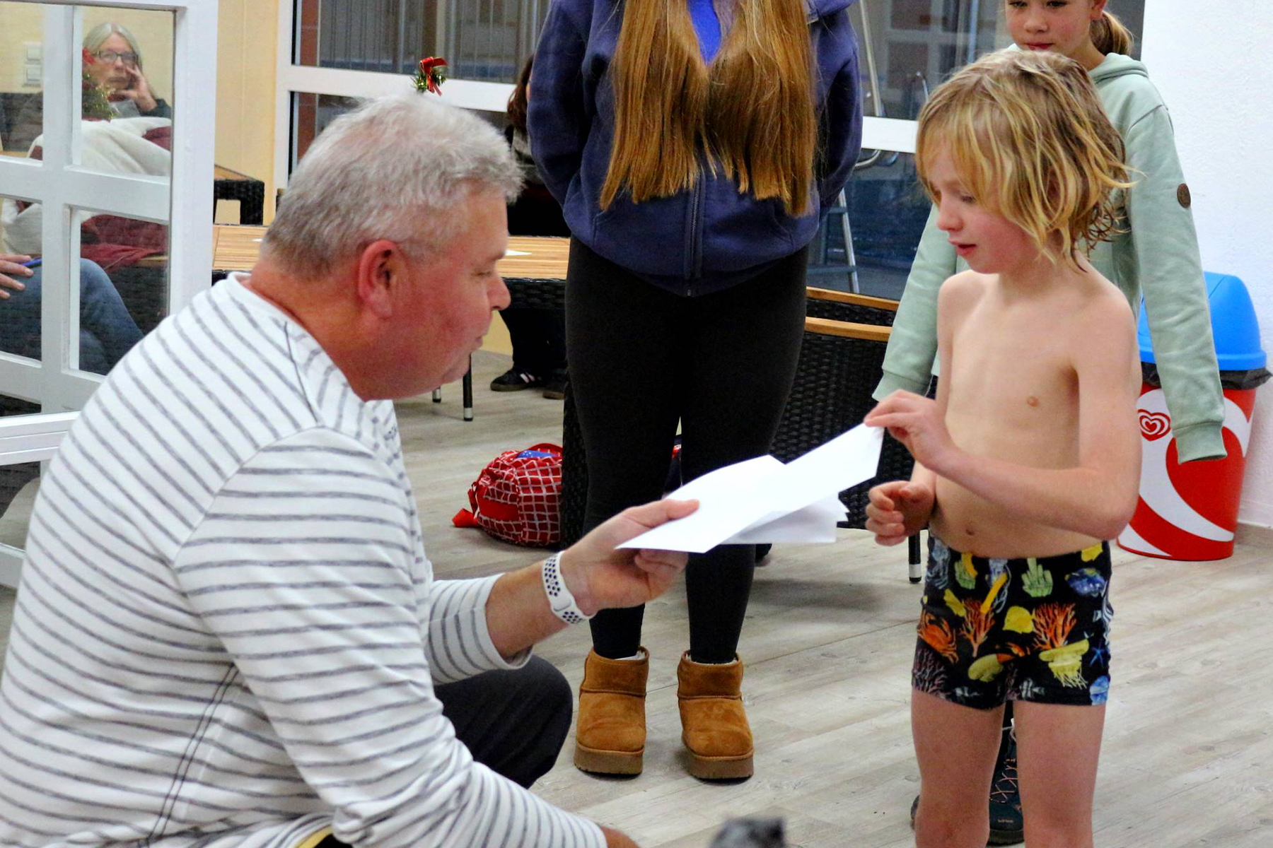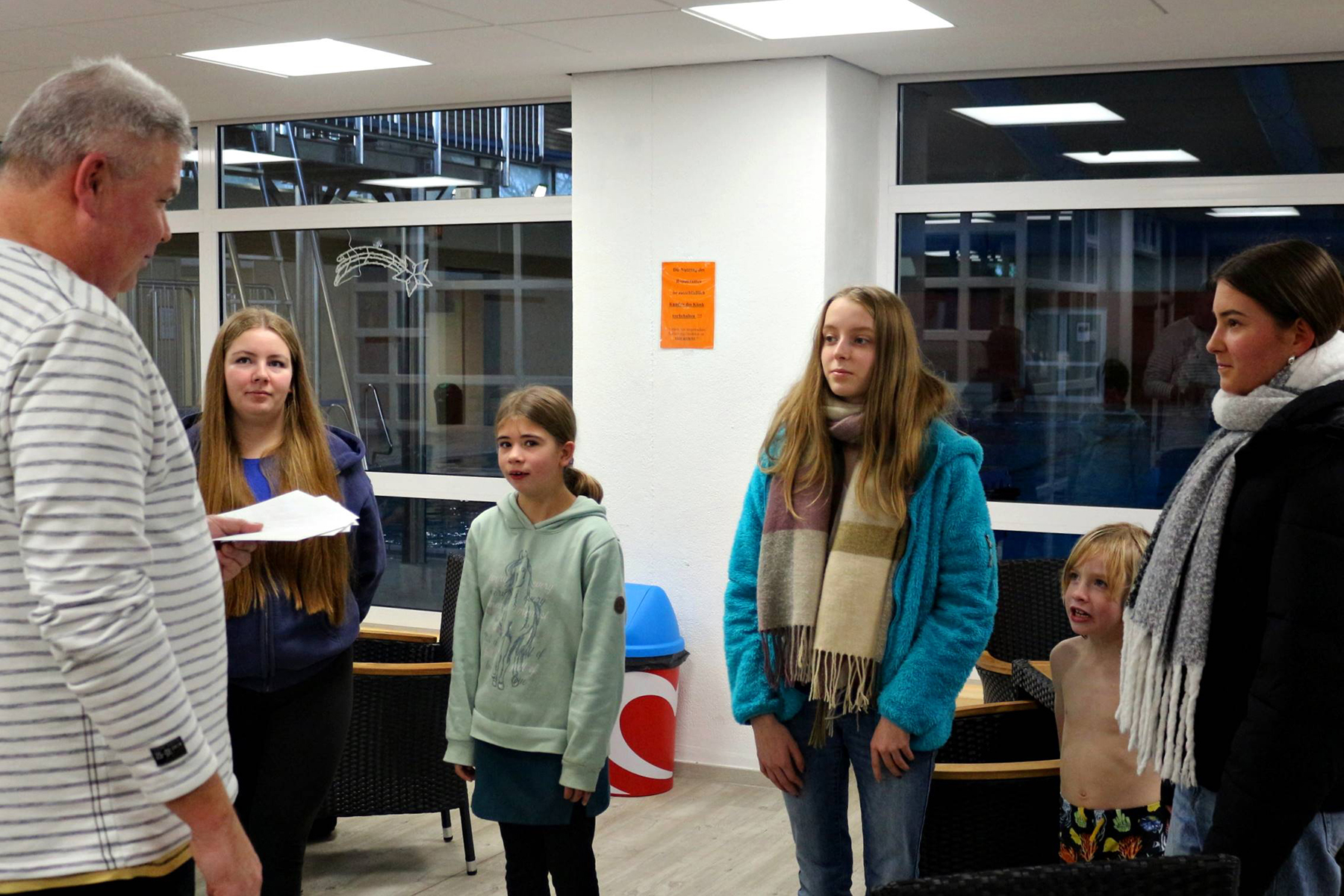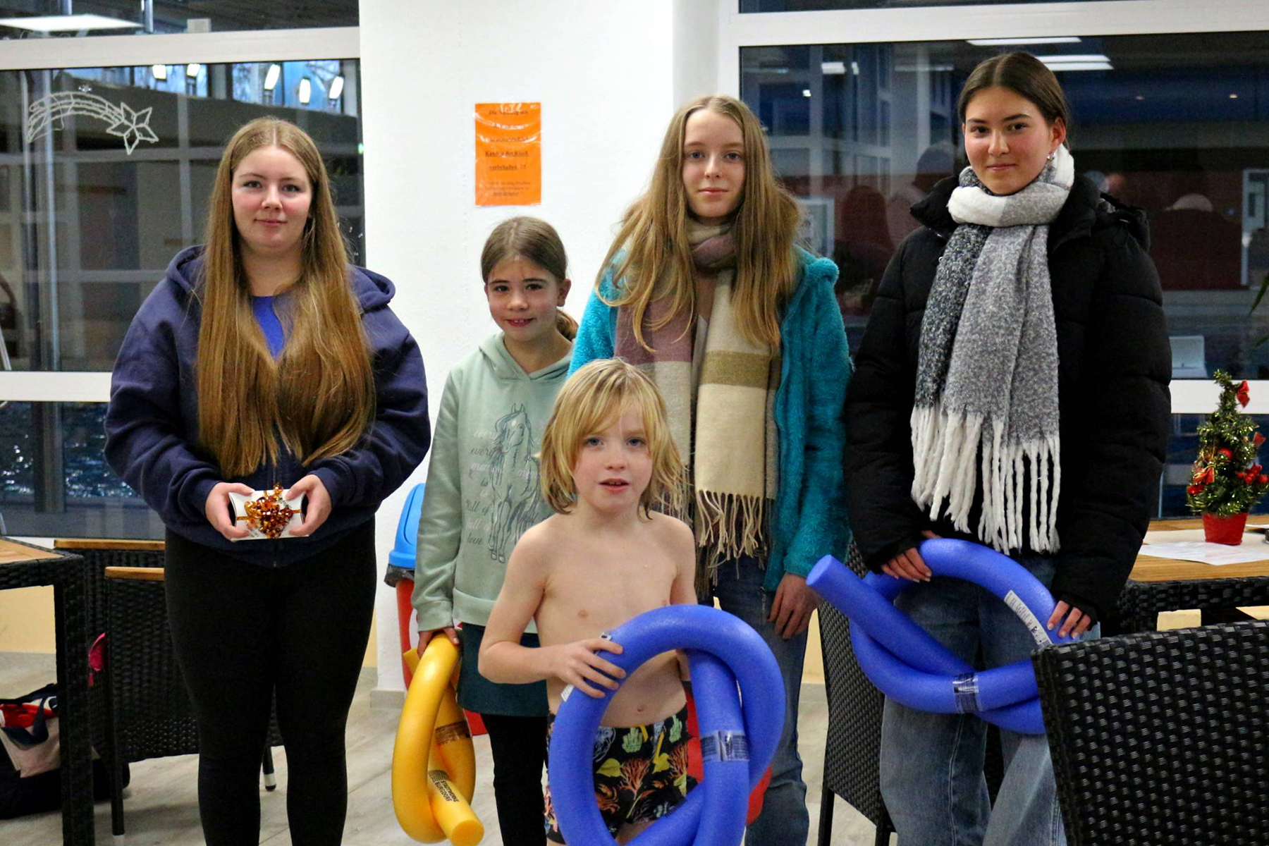 Bevor der Hauptpreis ausgehändigt werden konnte, ließ Ralf Beer den kleinen Moritz die Gewinnerin ziehen. So "bescherte" er Ronja Hansen am Nikolaustag einen von den Wirtschaftsbetrieben gestifteten 36 Euro-Eintrittskartenblock, der aber einen Geldwert von 42 Euro hat. Als Dank für ihre Beteiligung und ihr Erscheinen erhielten die übrigen weiblichen Jugendlichen je eine bunte Schwimmnudel.