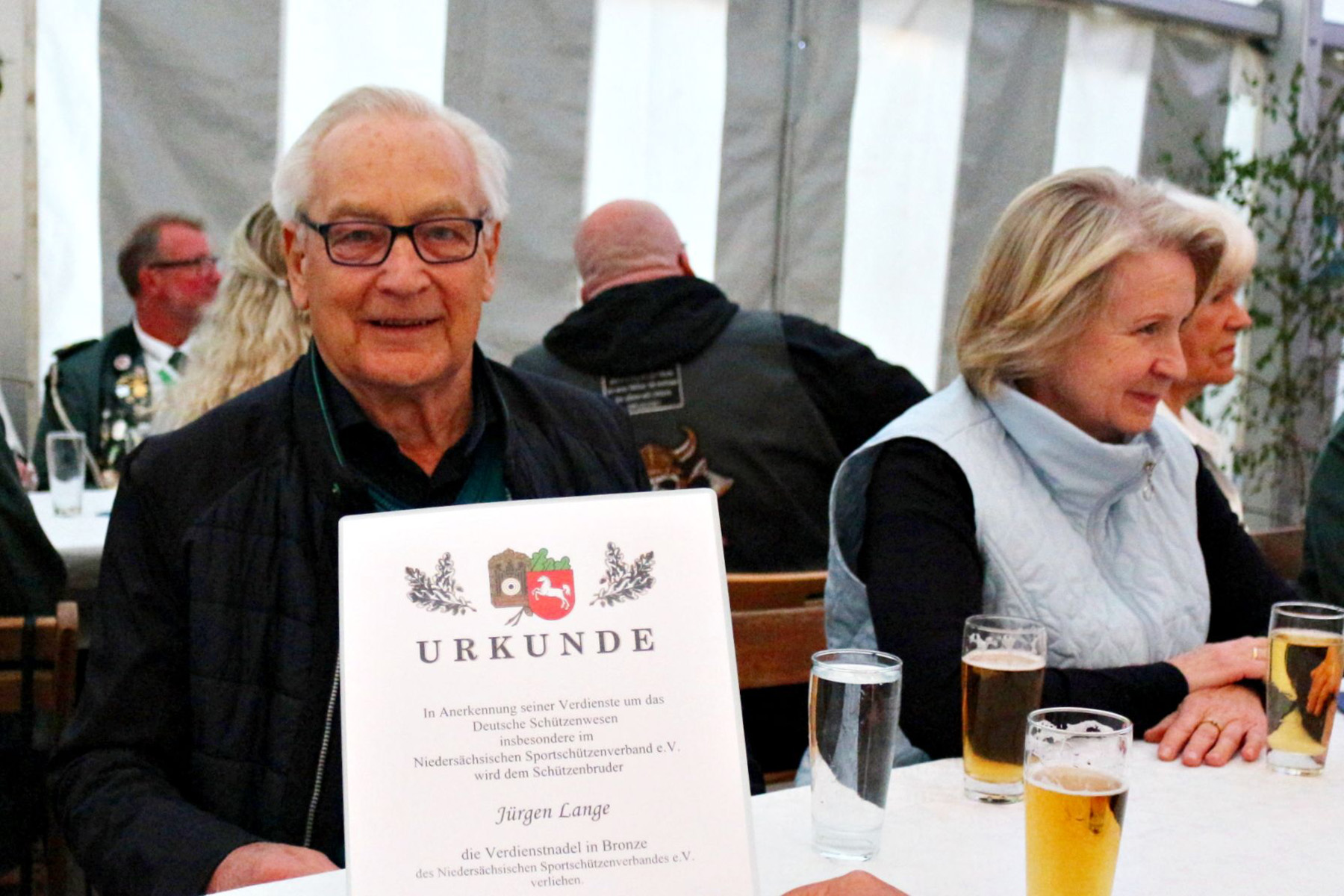 Bevor Sascha Schwartz und der Vorsitzende des Kreisschützenverbandes (KSV) Burgdorf, Werner Bösche, Vereinsmitglieder für mehrjährige Treue sowie Verdienste um das Schützenwesen auszeichneten, bekam Marianne Bethmann den 111er-Orden 2025 von ihrer Vorgängerin Anna-Maria Erhardt umgehangen.