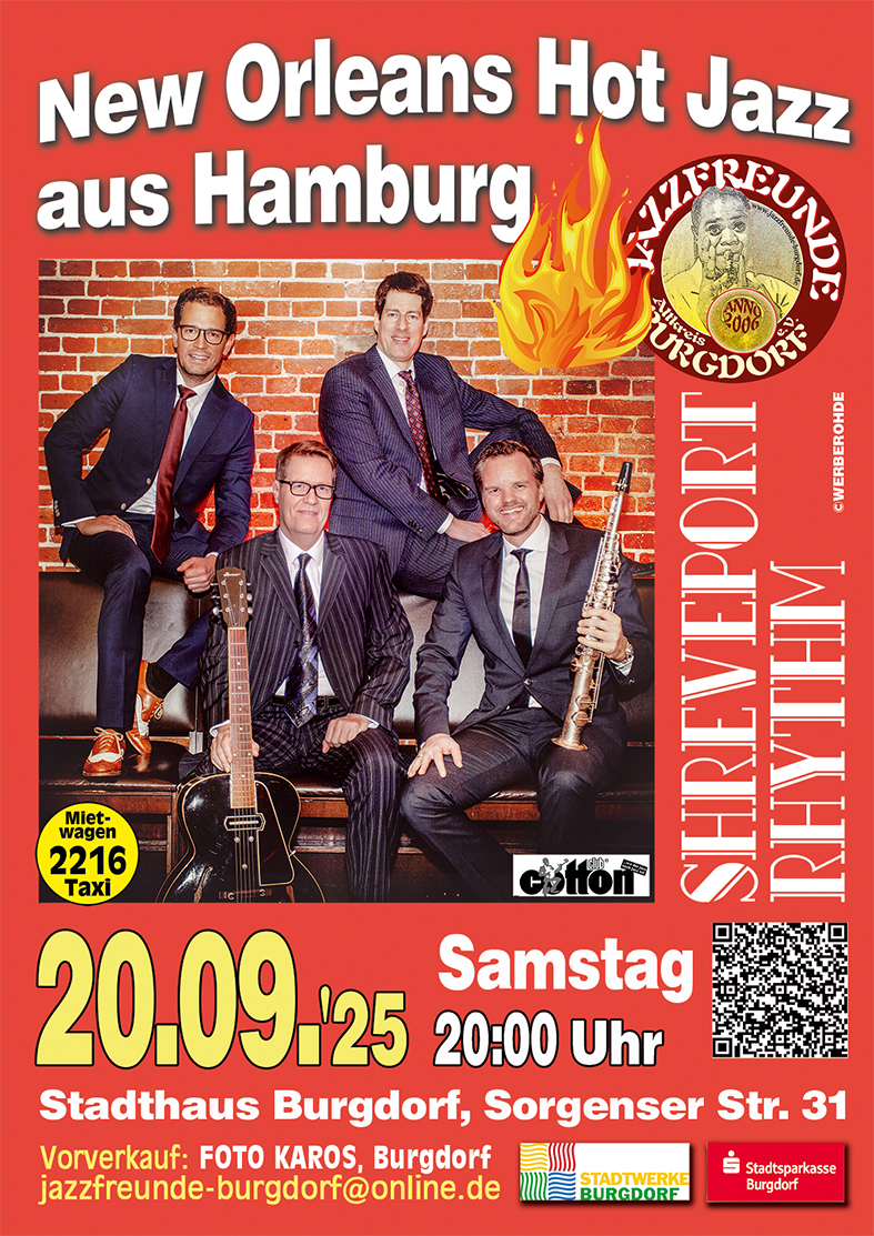 Eine wahre Spitzenband erwartet die Jazzfreunde Burgdorf am Sonnabend, 20. September 2025, ab 20 Uhr im Stadthaus. Mit Shreveport Rhythm kommt eines der besten Jazz-Quartetts Norddeutschlands nach Burgdorf – eine Band, die weit über die Grenzen Hamburgs hinaus für ihre virtuose Mischung aus Hot Jazz, Swing, Drive und Entertainment geschätzt wird und nicht zuletzt bei Lindy-Hop-Tänzern äußerst beliebt ist.