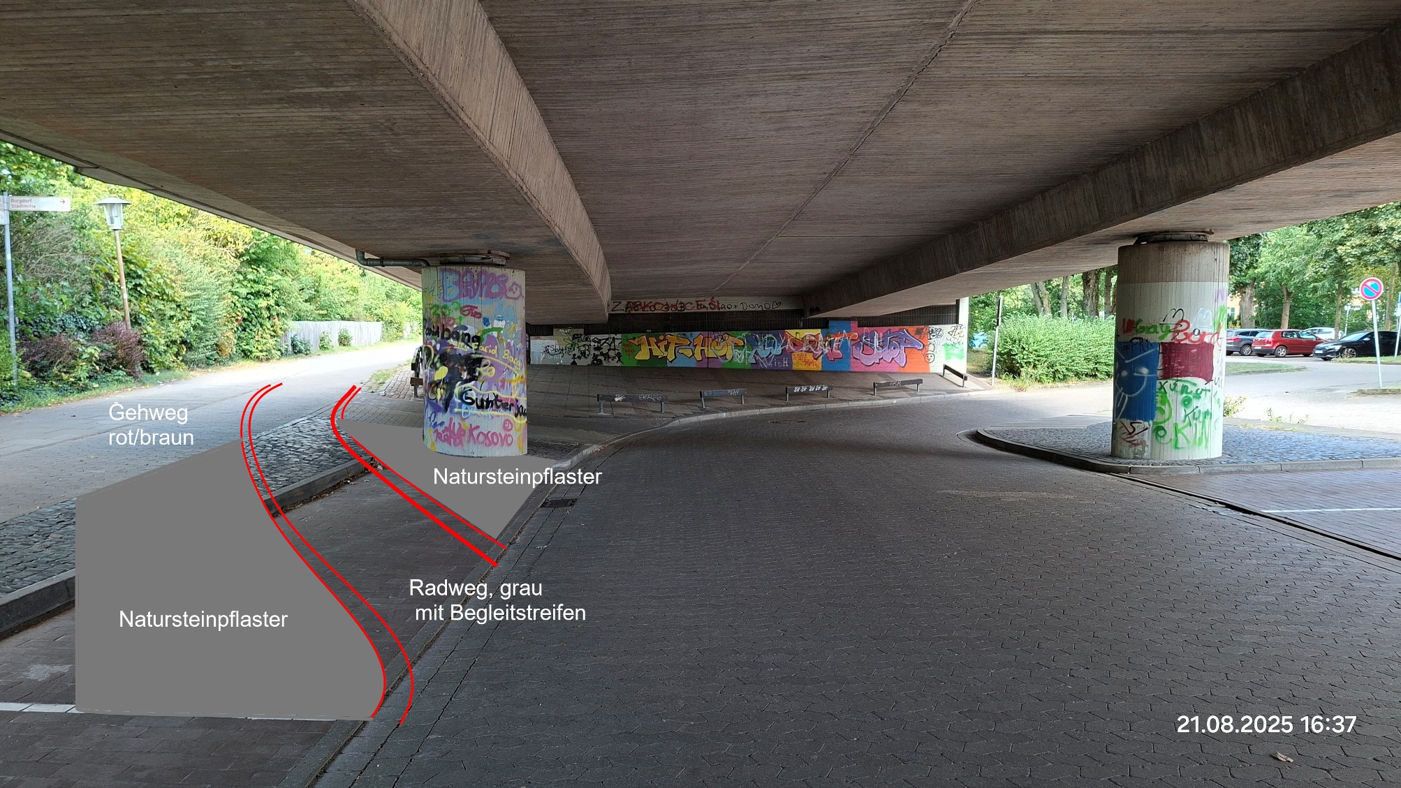 Zudem sieht der Antrag vor, den Gehweg entlang des Magdalenenfriedhofs zu erneuern und dabei rotes oder heidebraunes Rechteckpflaster zu verwenden – analog zur Gestaltung auf der Strecke vom Kreisverkehr kommend. Die Bordabsenkung am Tunneleingang soll auf drei Meter verbreitert werden, um auch hier den Begegnungsverkehr von Radfahrenden zu ermöglichen.