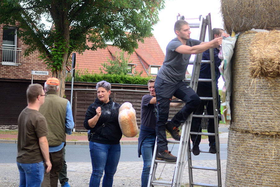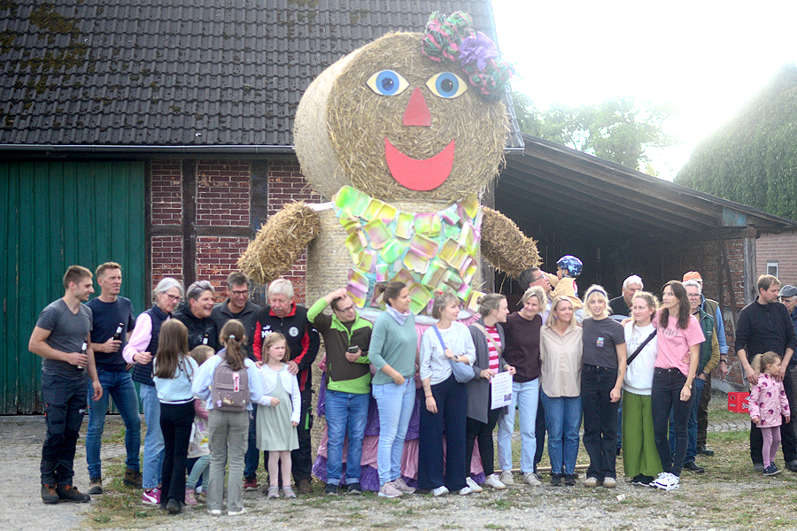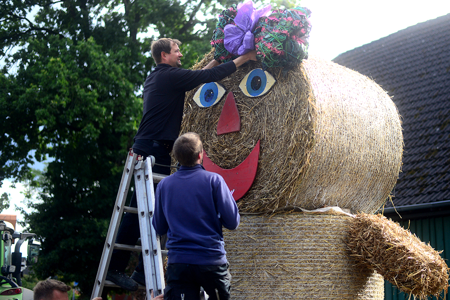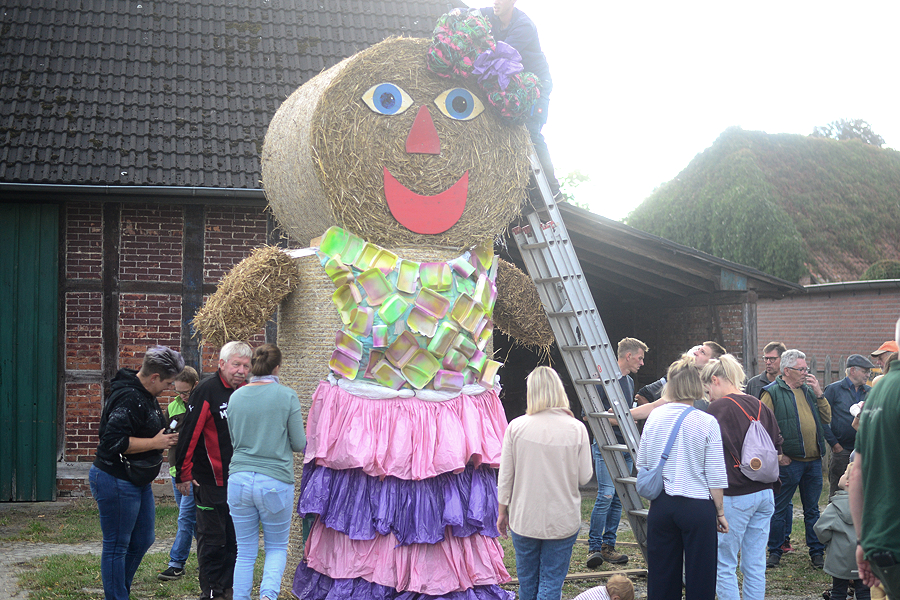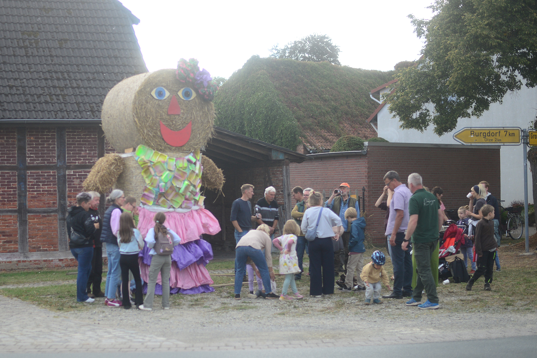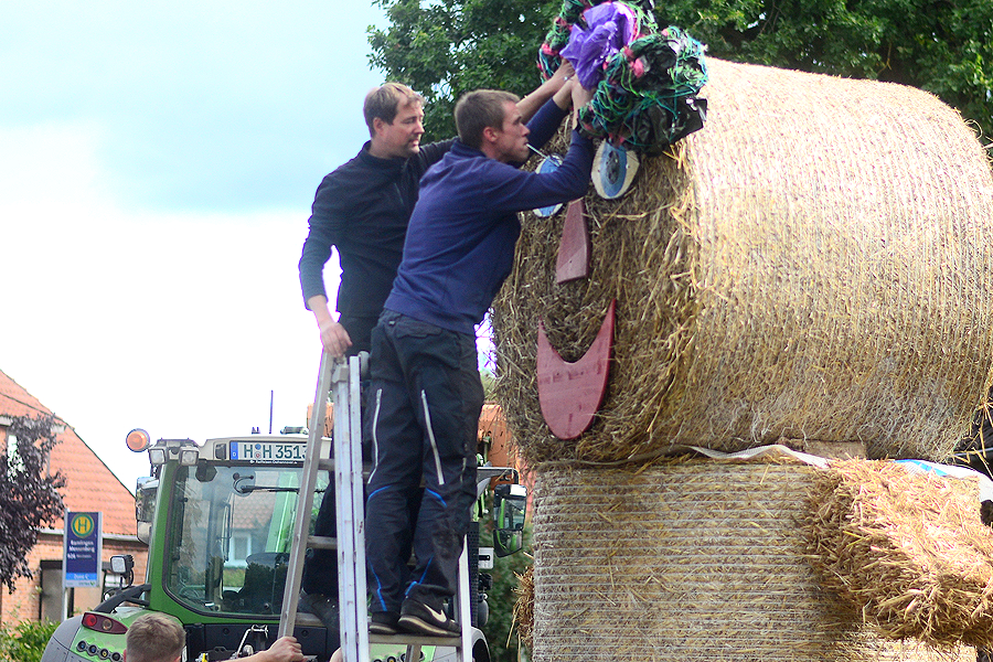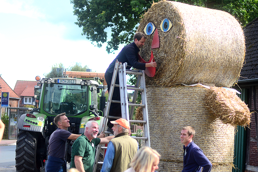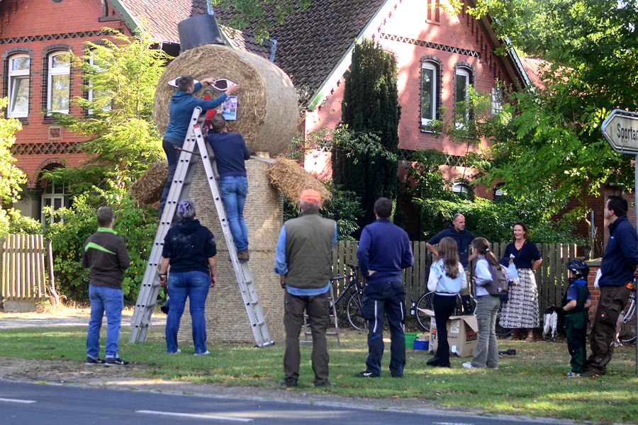 Während eine Reihe von Frauen auf dem Hof Buchholz die Kronen gebunden hat, waren einige Männer unterwegs, um die Strohpuppen aufzustellen. Die erste steht nun an der Kreuzung Grüne Allee/Messenberg, eine weitere in der Grünen Allee am Ortseingang aus Richtung Engensen kommend sowie die dritte in der Mitte des Ortes, die den Besuchern den Weg zum Festplatz im Akazienweg weist.