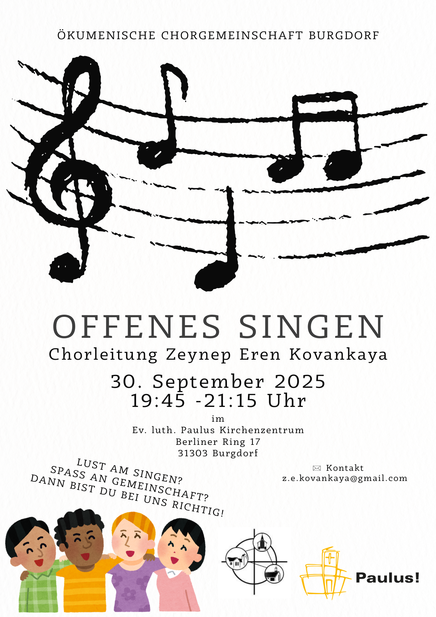 Wer Lust hat, gemeinsam zu singen und in eine lebendige Chorgemeinschaft einzutauchen, ist am Dienstag, 30. September 2025, zur offenen Probe der Ökumenischen Chorgemeinschaft Burgdorf eingeladen. Von 19.45 bis 21.15 Uhr besteht im Pauluskirchenzentrum am Berliner Ring 17 die Gelegenheit, unverbindlich teilzunehmen und Chorluft zu schnuppern.