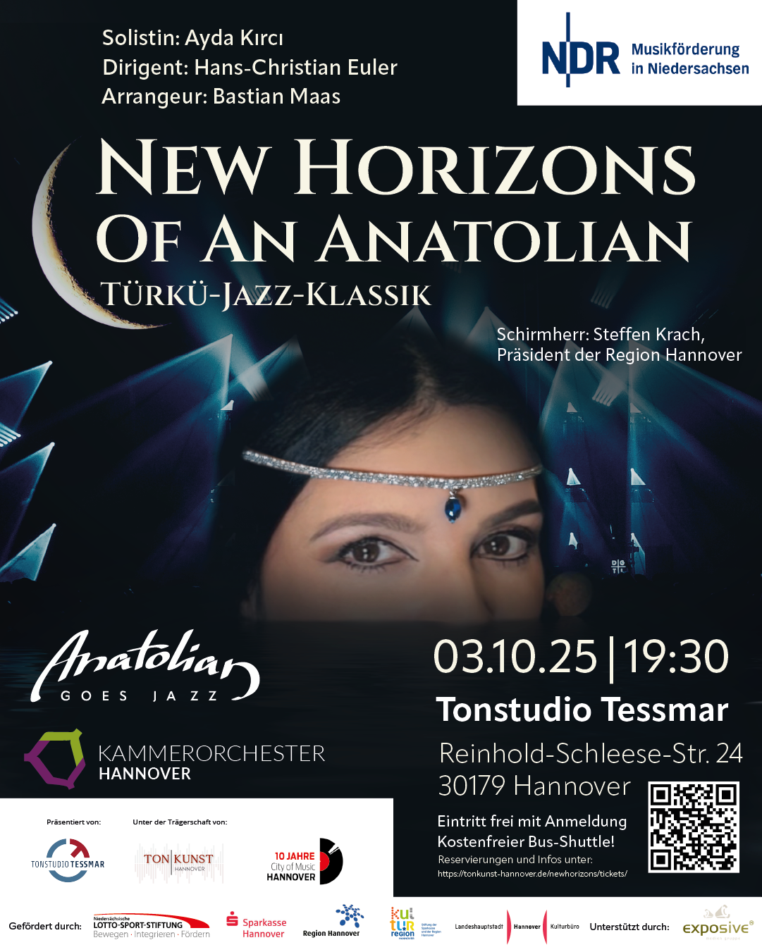 Am Freitag, 3. Oktober 2025, wird Hannover zum Schauplatz einer besonderen musikalischen Premiere. Unter dem Motto „Einheit in Vielfalt“ präsentiert der Verein Tonkunst Hannover e.V. im Tonstudio Tessmar, Reinhard-Schleese-Straße 24 in Hannover, das Projekt „New Horizons Of An Anatolian – Türkü-Jazz-Klassik“. Auf der Bühne treffen das Kammerorchester Hannover, die Band Anatolian Goes Jazz und die Solistin Ayda Kırcı aufeinander. Das Ergebnis verspricht einen spannenden Dialog zwischen anatolischer Volksmusik, Jazz und Klassik – Musik, die Brücken baut und Horizonte erweitert.
