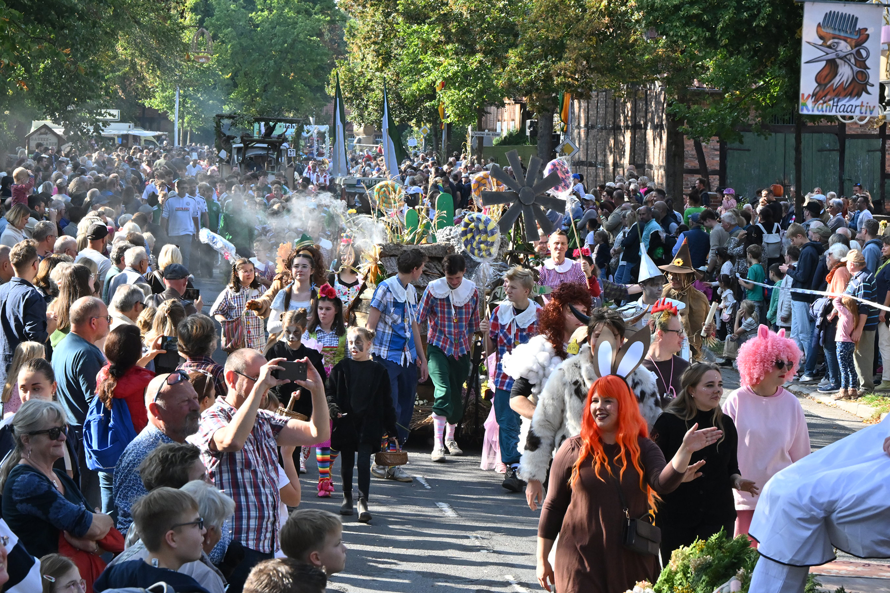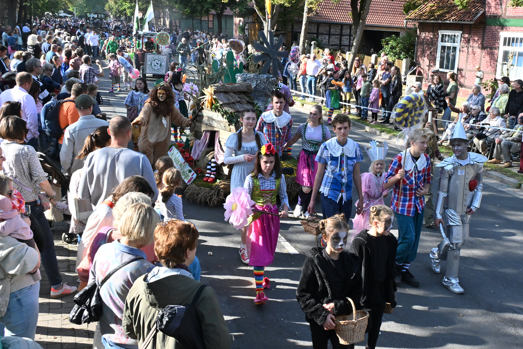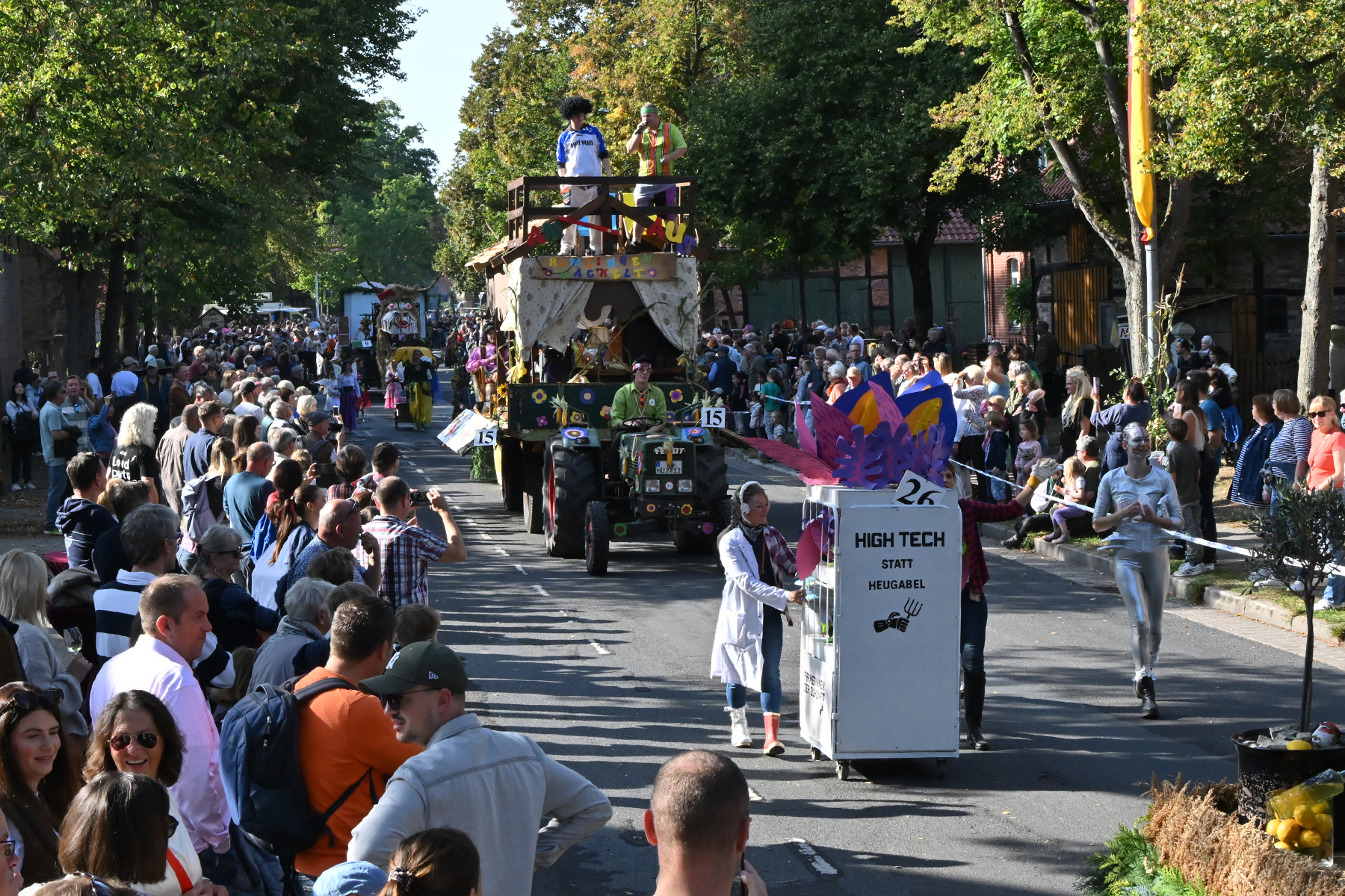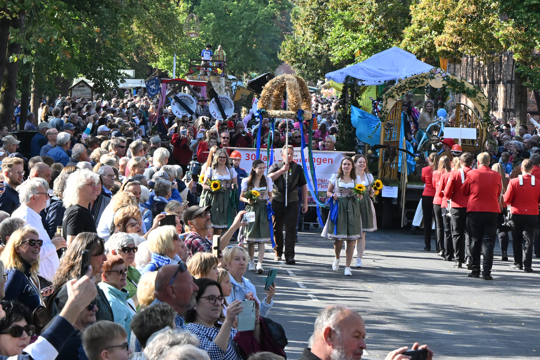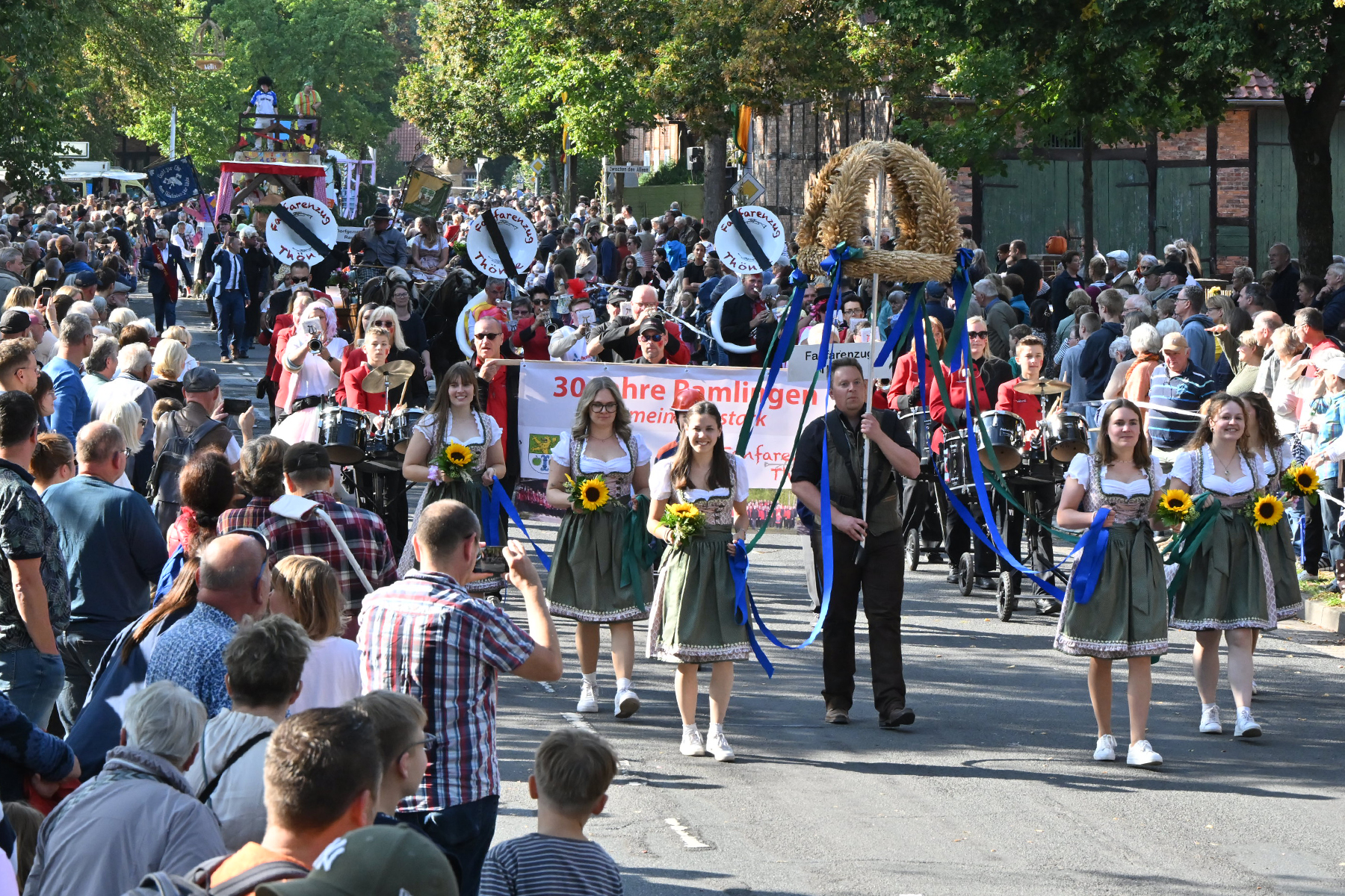 Anschließend setzte sich der Festumzug, angeführt von der Erntekrone, getragen von Dominik Schlumbohm und begleitet von den sechs Kronengirls, auf die zweifache Runde durch den Ort. Die Zuschauer jubelten den Umzugsteilnehmern zu, und für die jüngsten Besucher sprang dabei auch die eine oder andere Süßigkeit heraus.