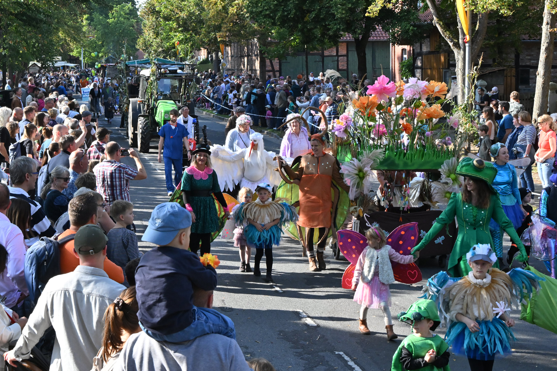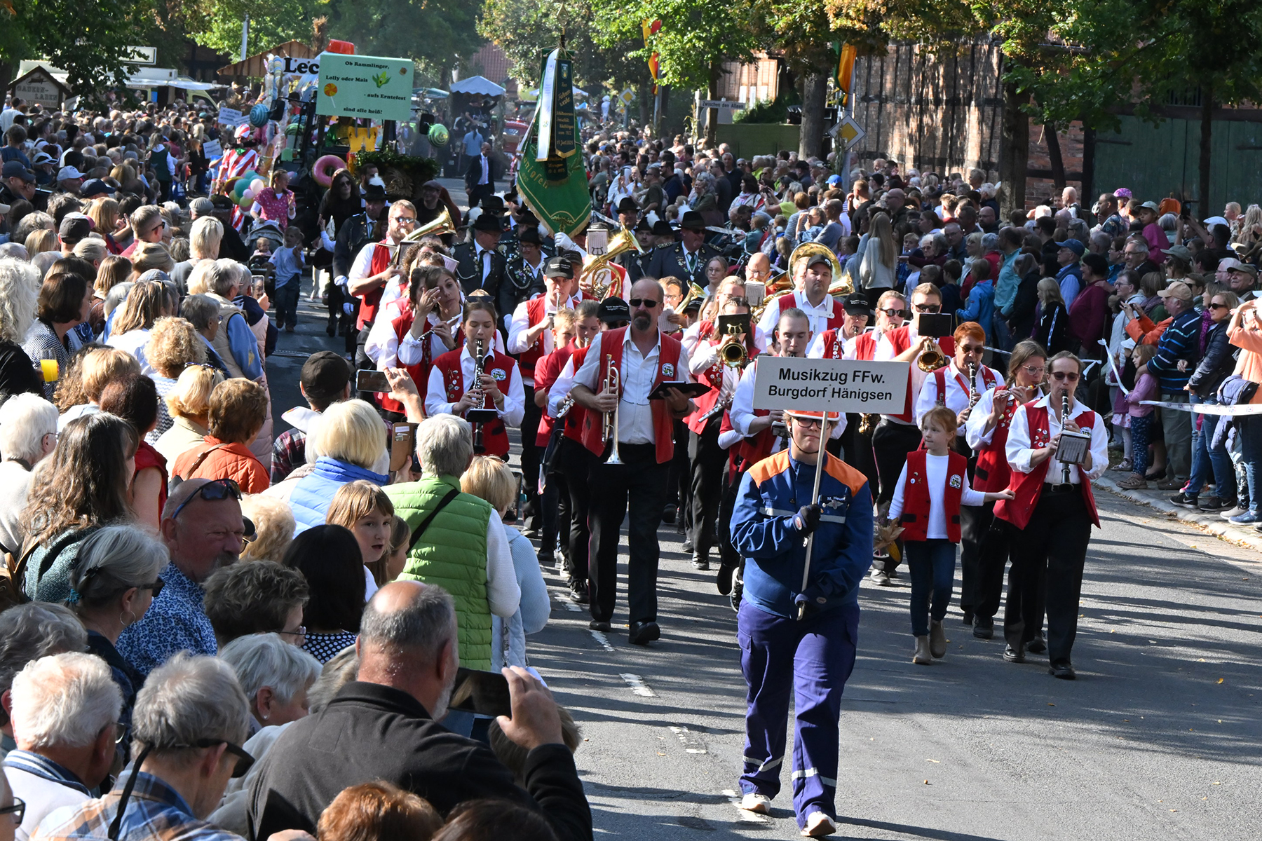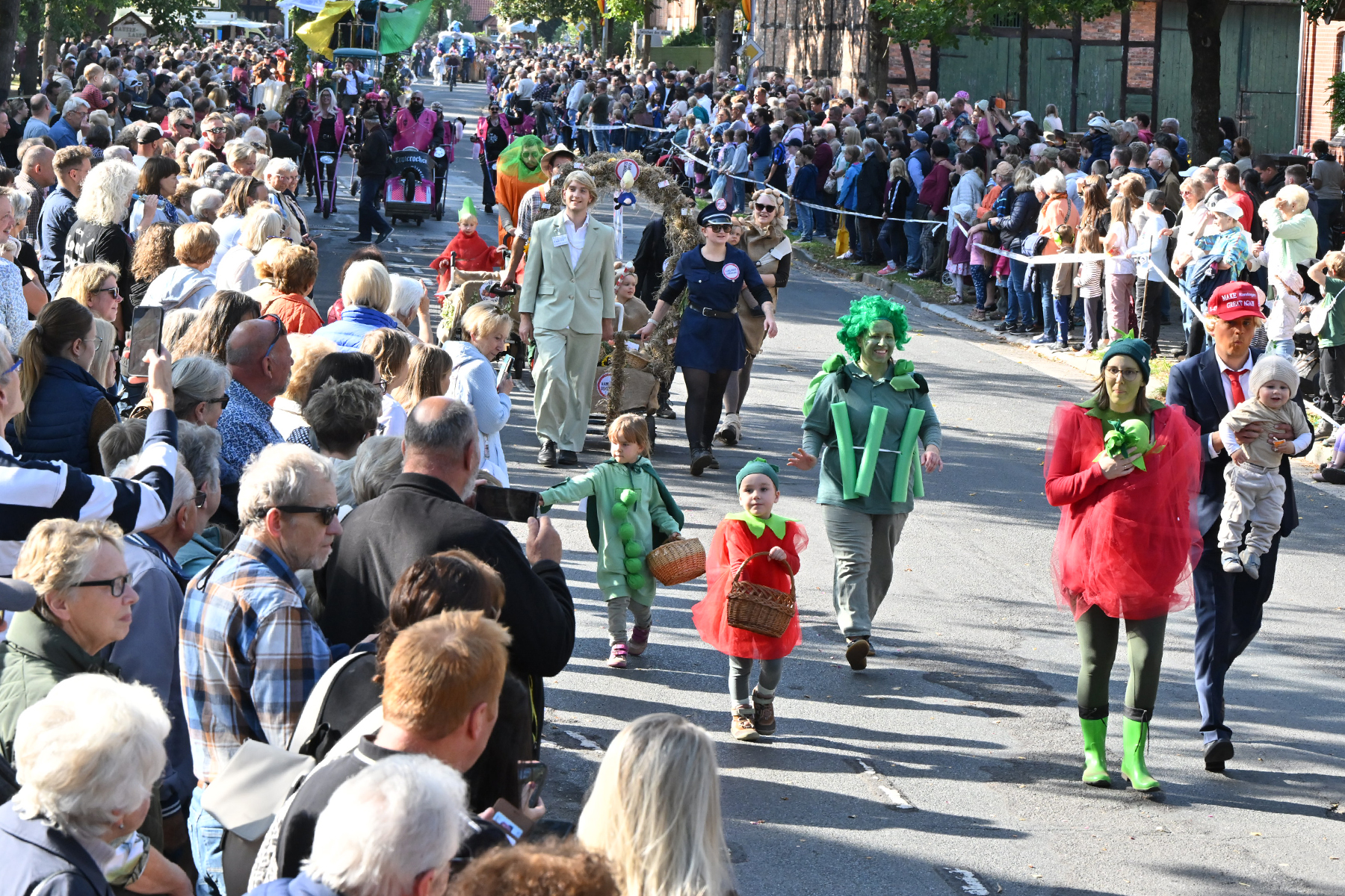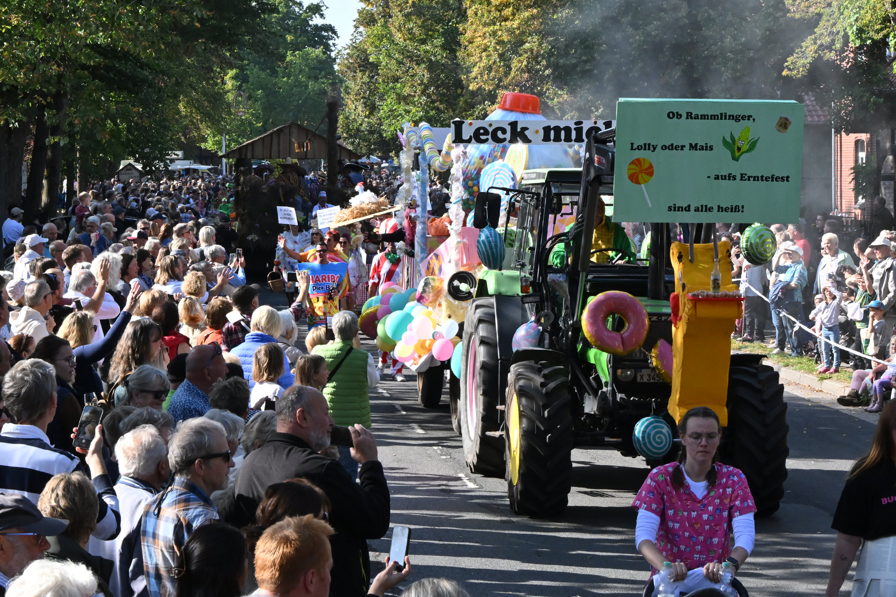 Anschließend setzte sich der Festumzug, angeführt von der Erntekrone, getragen von Dominik Schlumbohm und begleitet von den sechs Kronengirls, auf die zweifache Runde durch den Ort. Die Zuschauer jubelten den Umzugsteilnehmern zu, und für die jüngsten Besucher sprang dabei auch die eine oder andere Süßigkeit heraus.