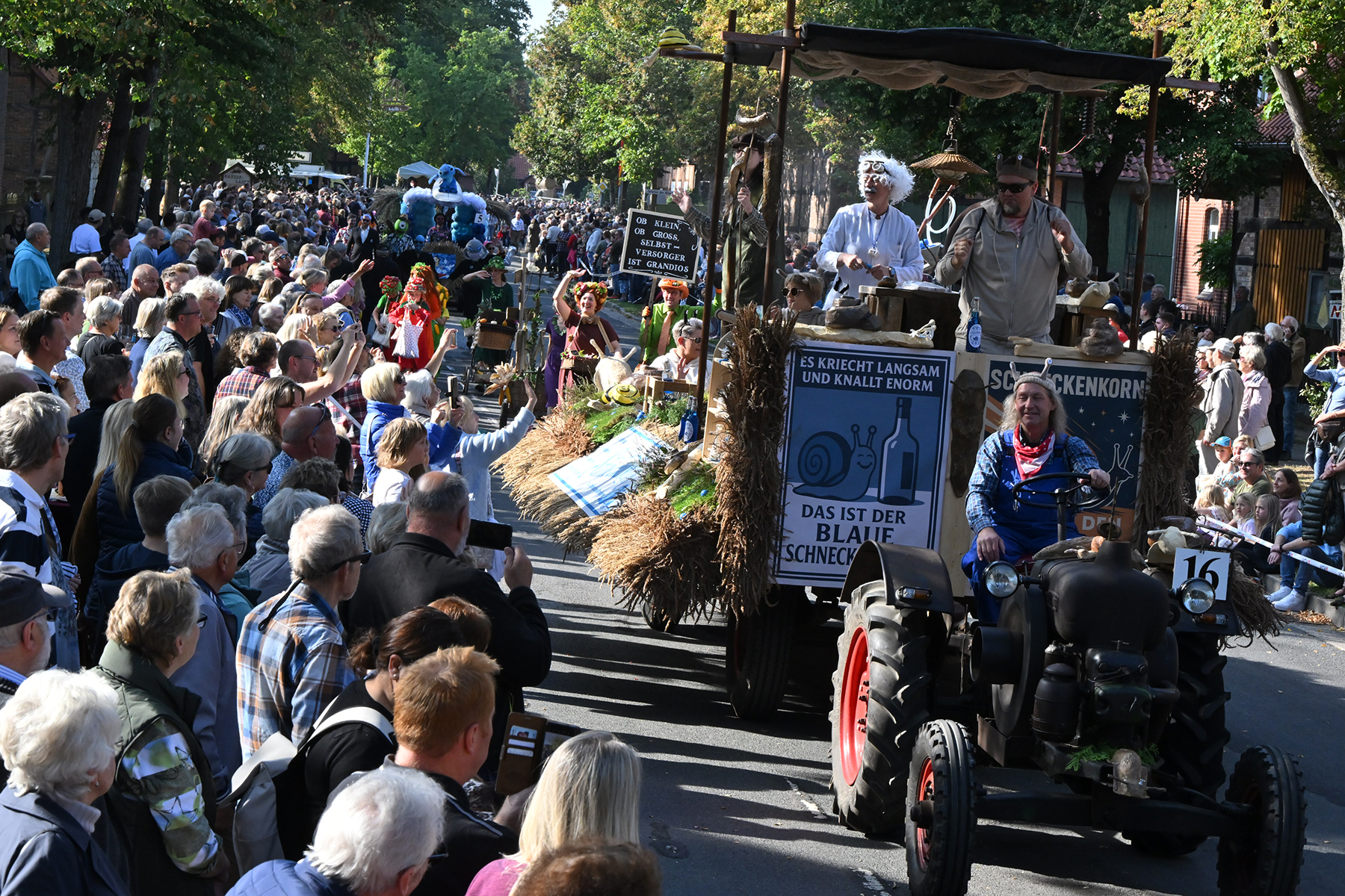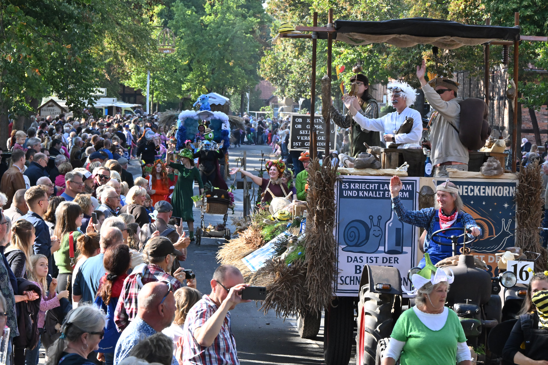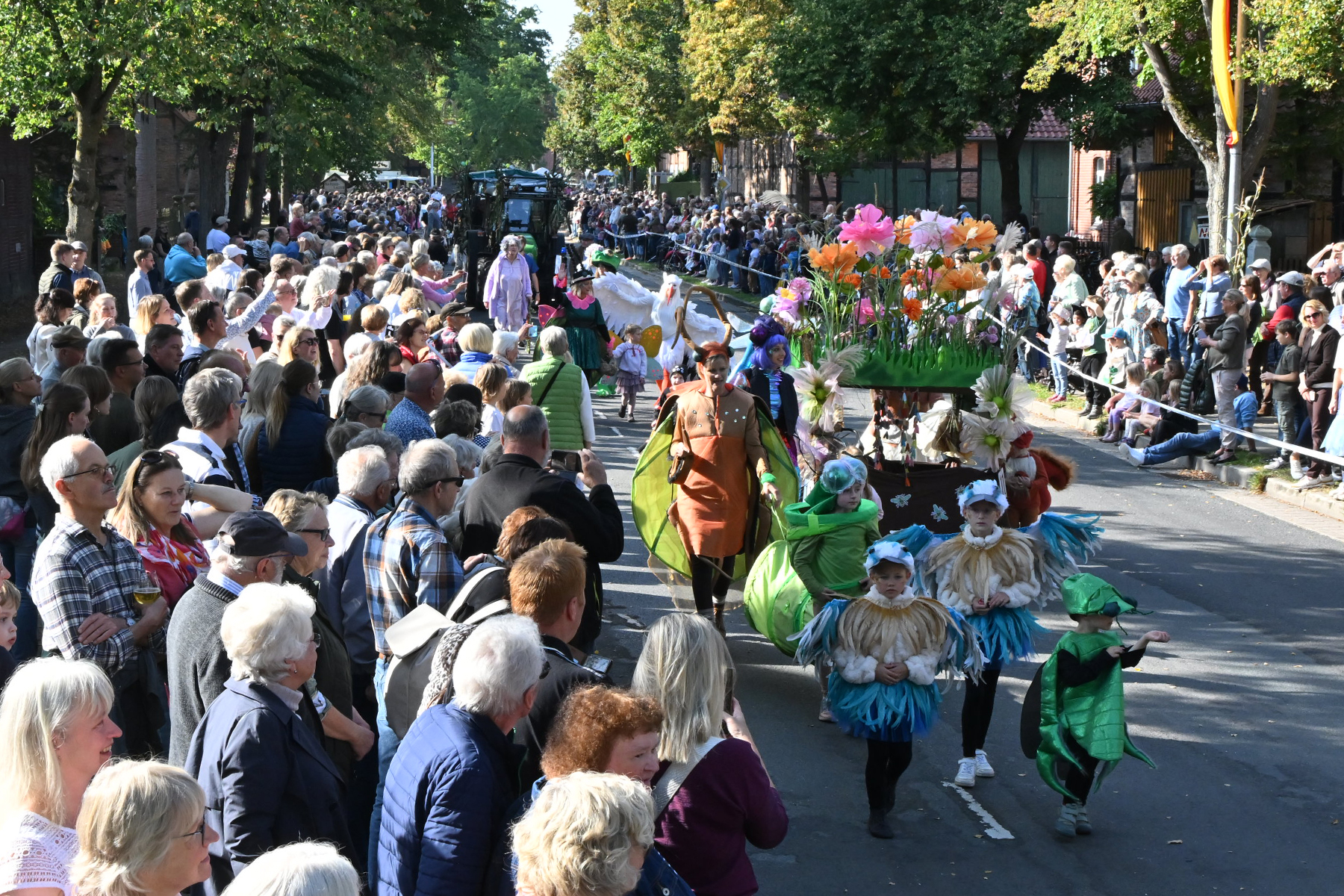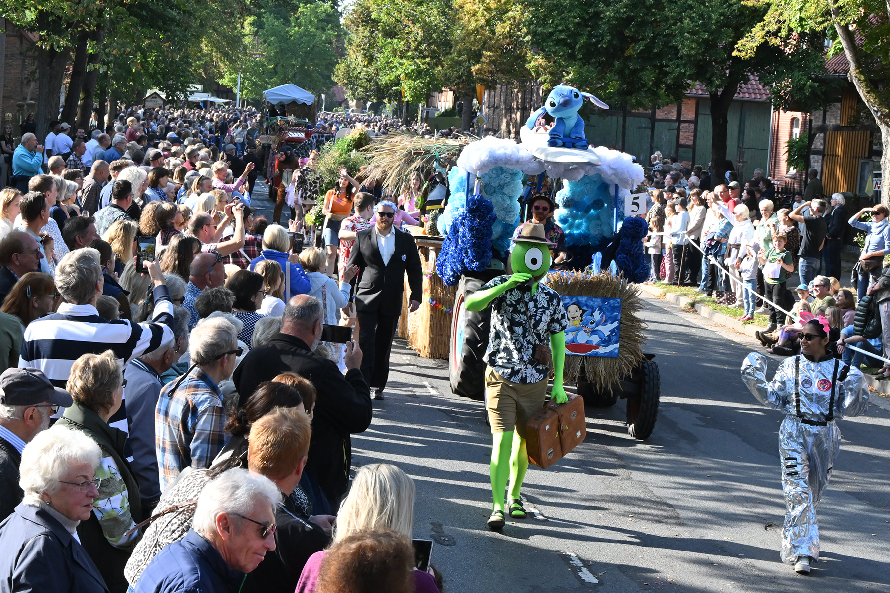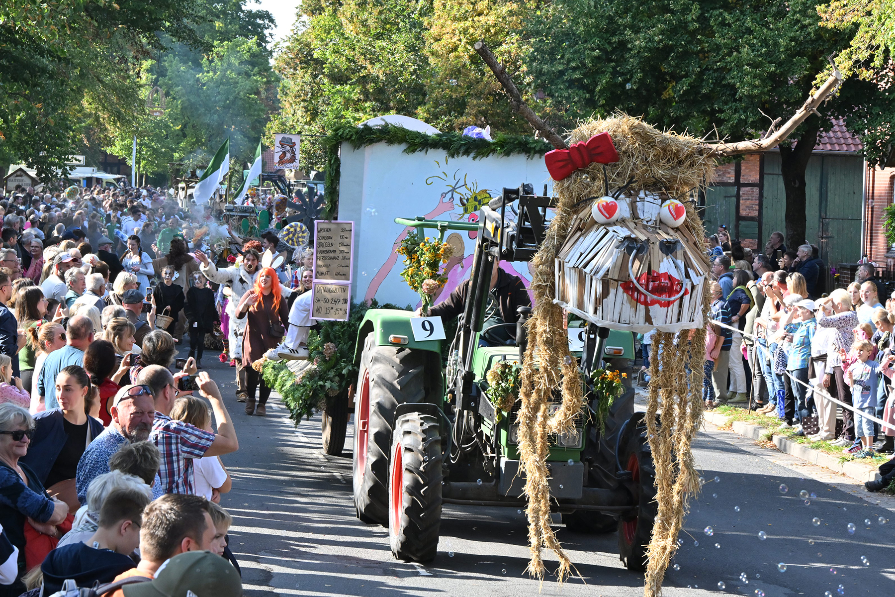 Anschließend setzte sich der Festumzug, angeführt von der Erntekrone, getragen von Dominik Schlumbohm und begleitet von den sechs Kronengirls, auf die zweifache Runde durch den Ort. Die Zuschauer jubelten den Umzugsteilnehmern zu, und für die jüngsten Besucher sprang dabei auch die eine oder andere Süßigkeit heraus.
