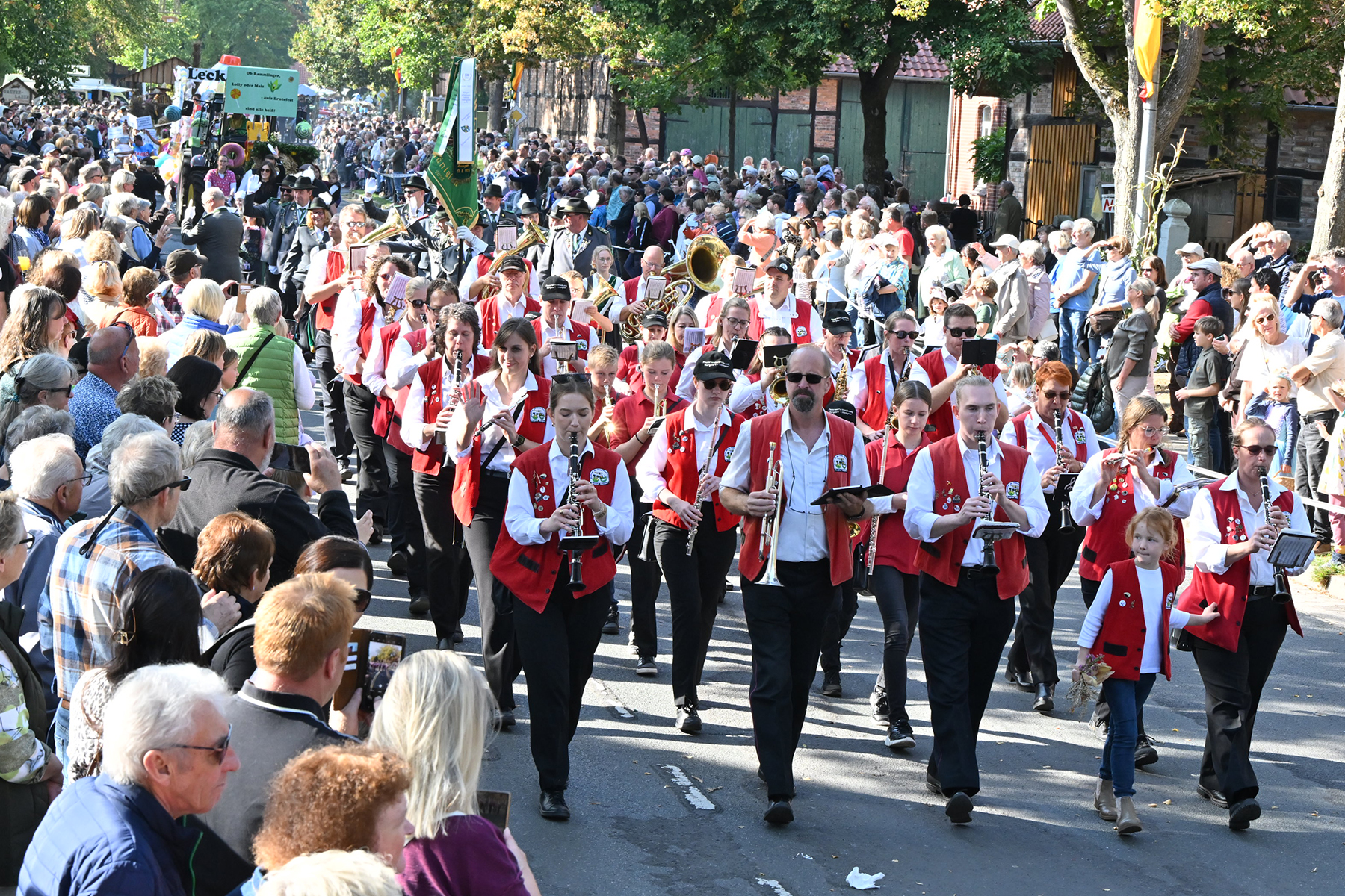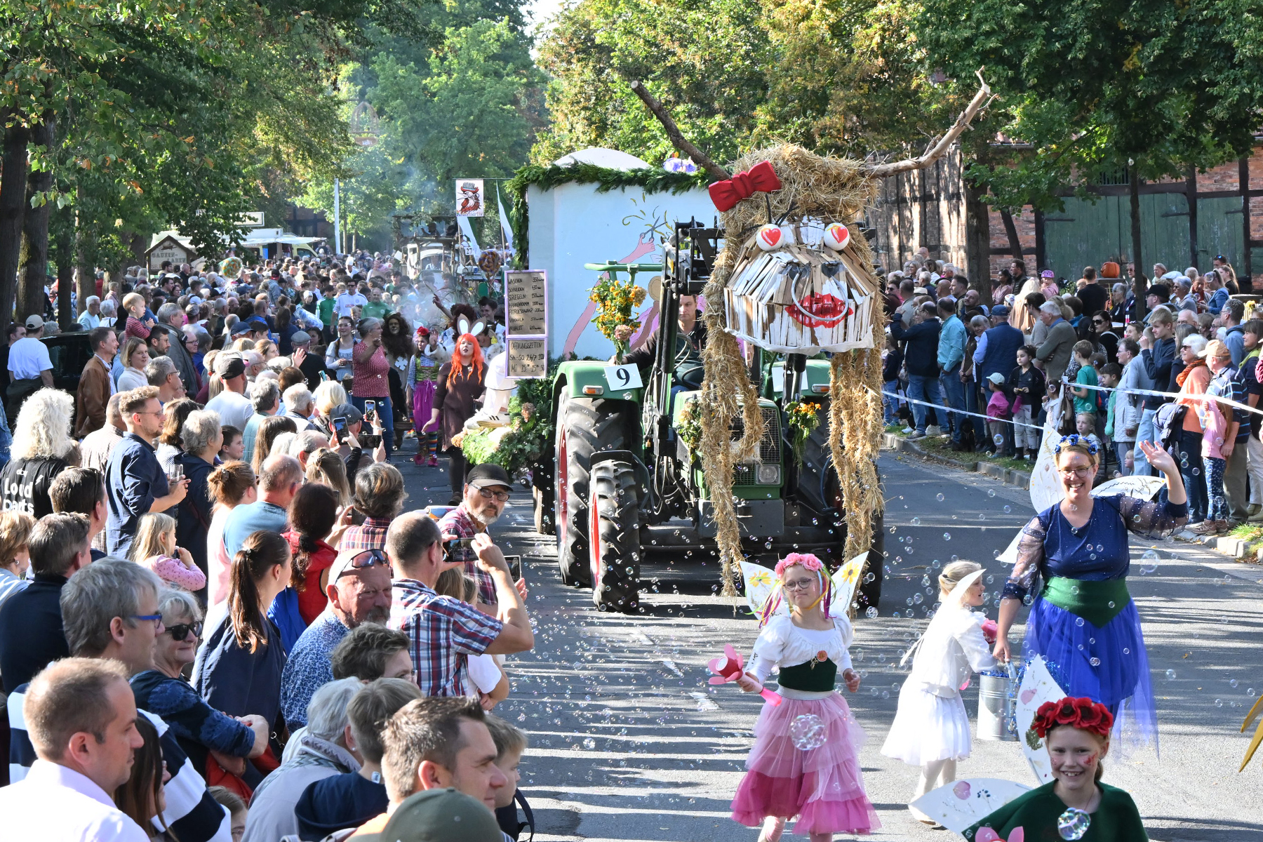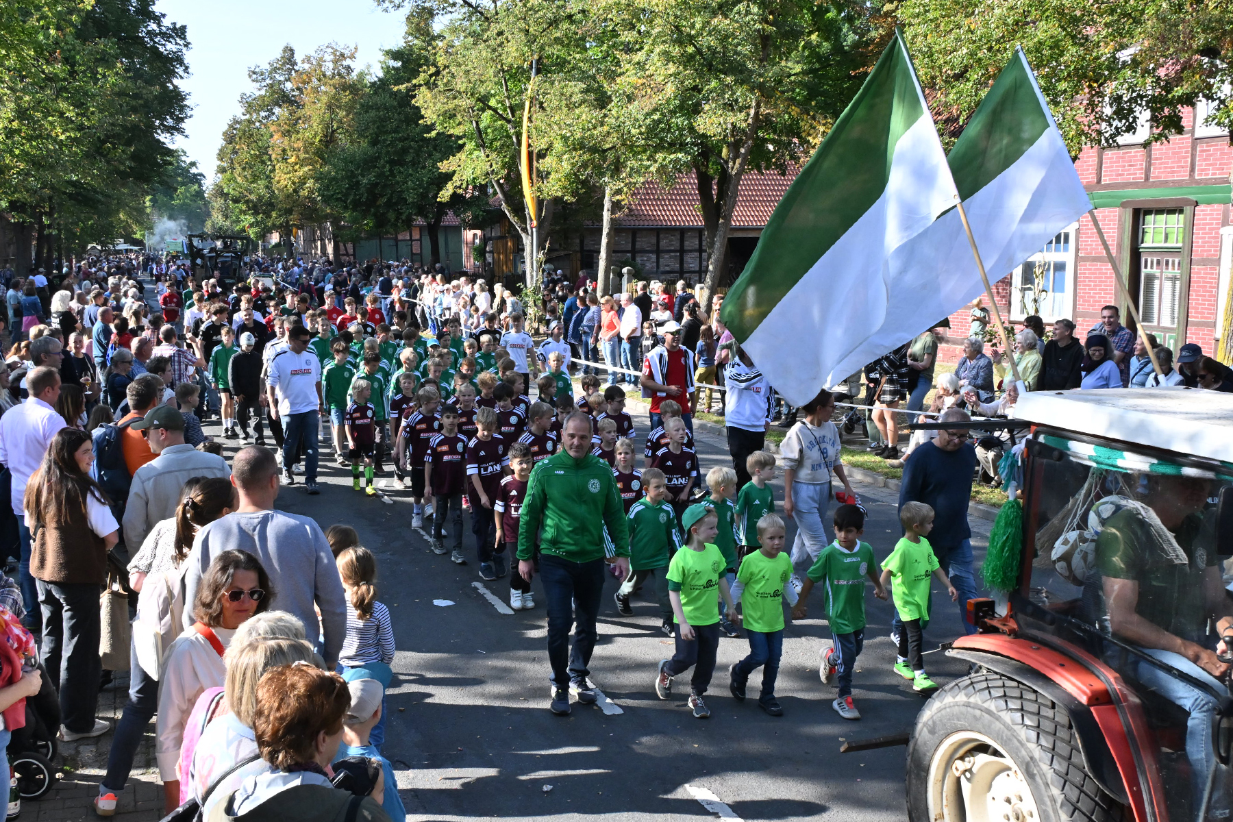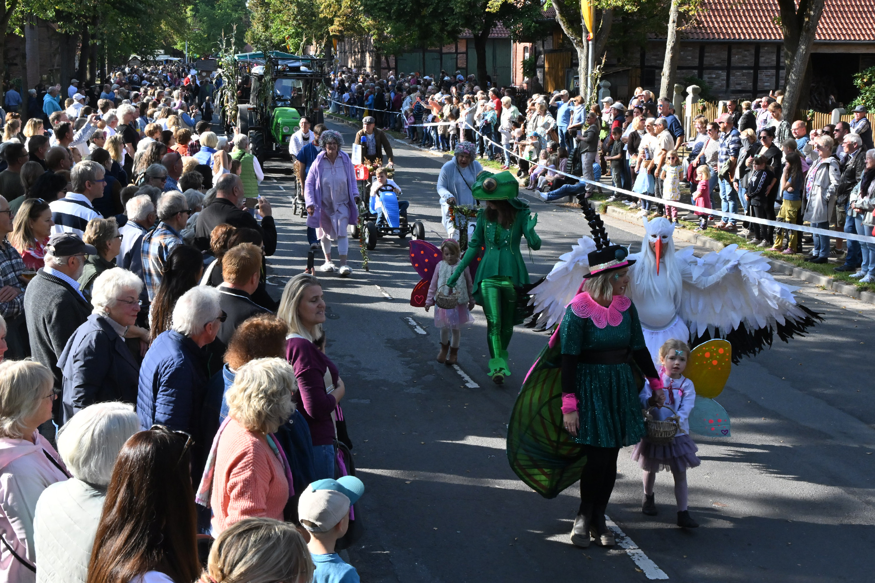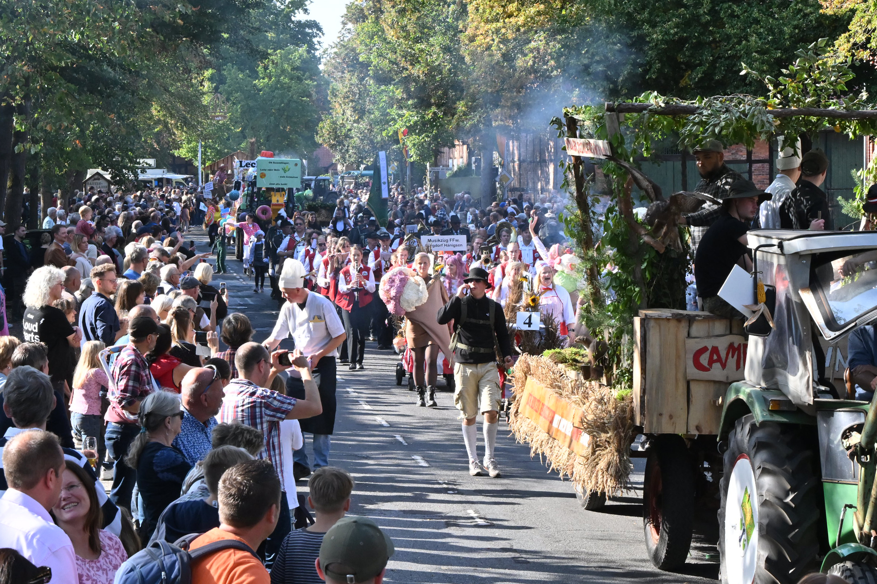 Anschließend setzte sich der Festumzug, angeführt von der Erntekrone, getragen von Dominik Schlumbohm und begleitet von den sechs Kronengirls, auf die zweifache Runde durch den Ort. Die Zuschauer jubelten den Umzugsteilnehmern zu, und für die jüngsten Besucher sprang dabei auch die eine oder andere Süßigkeit heraus.