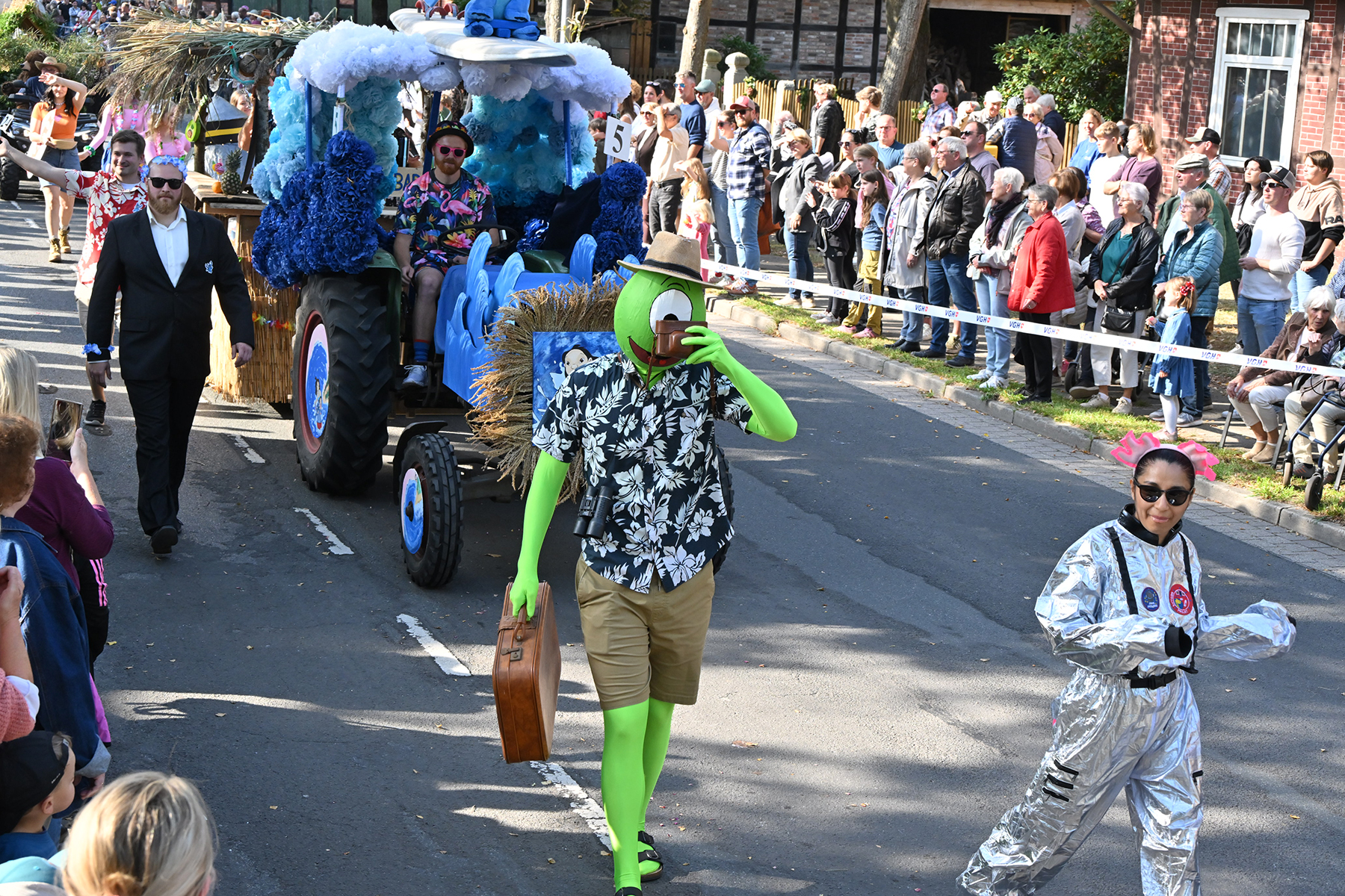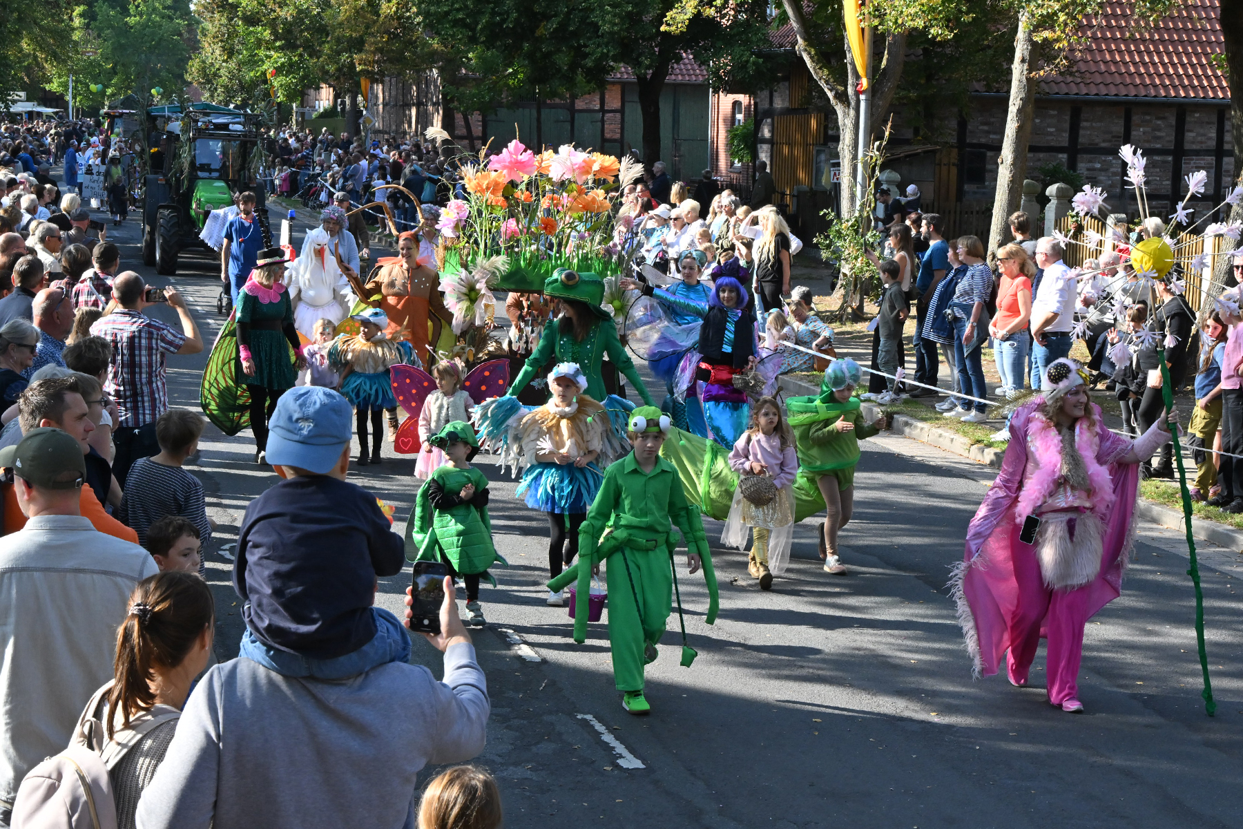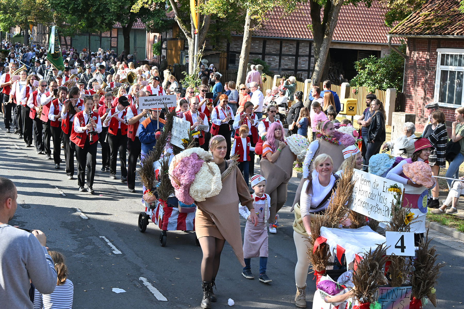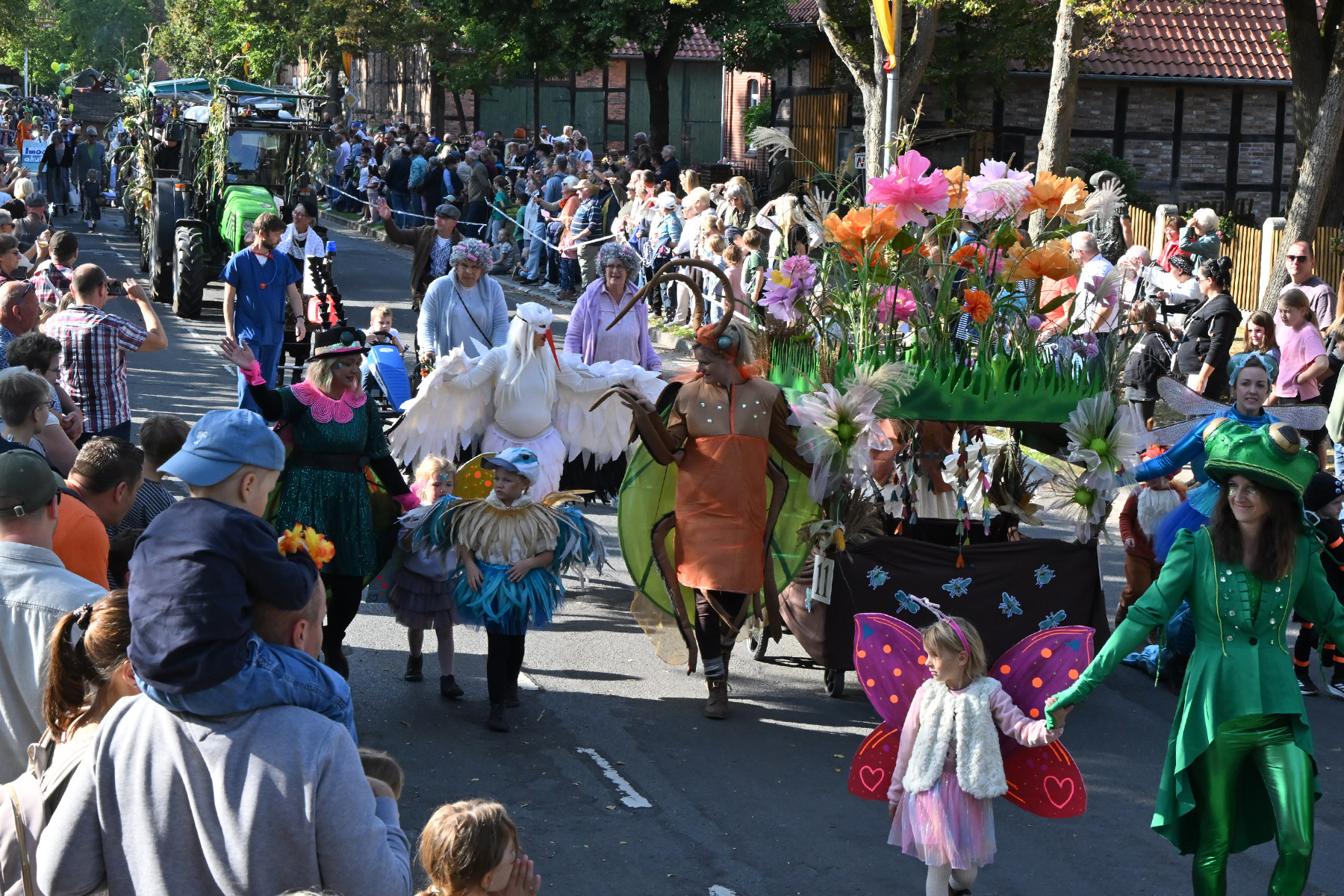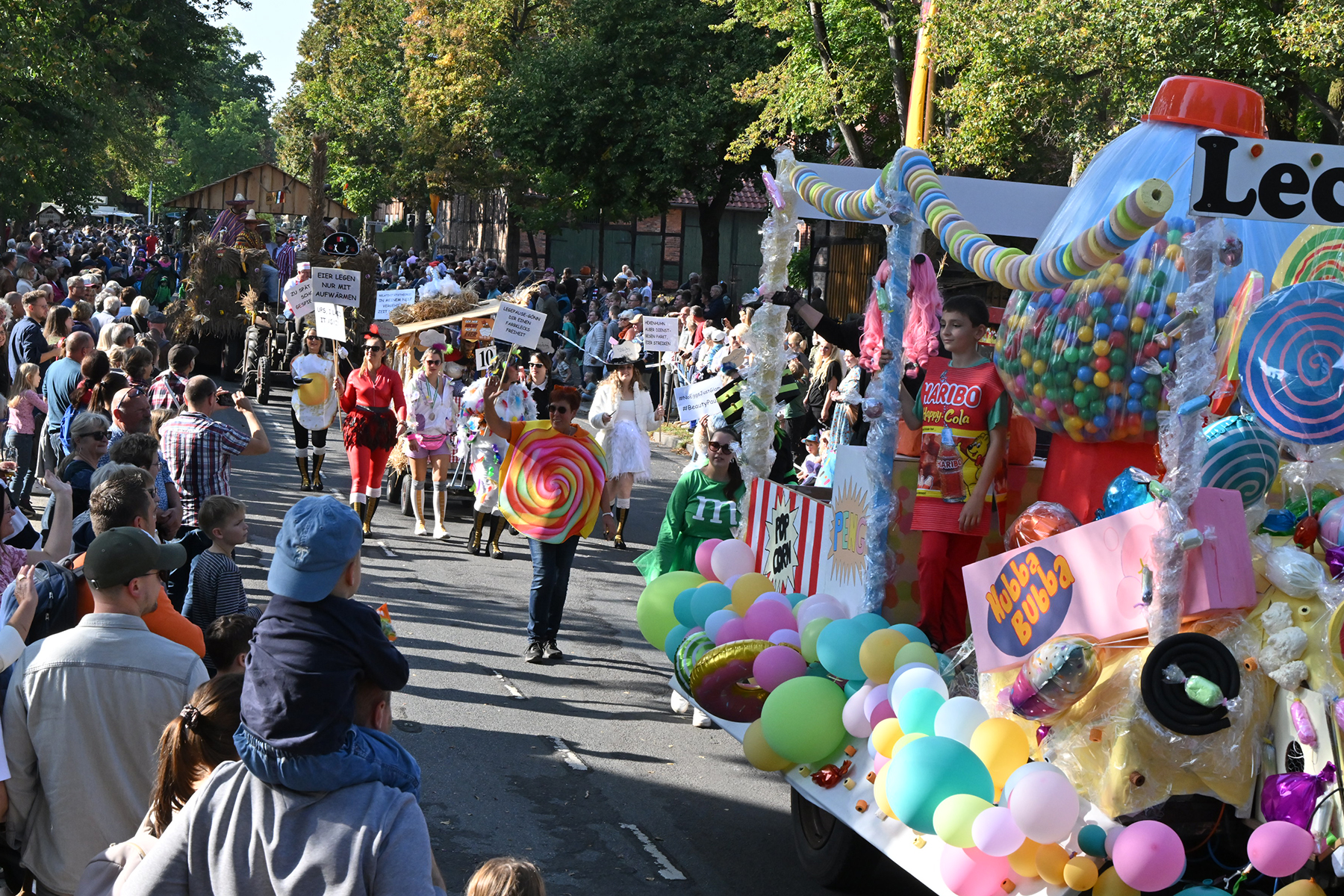 Anschließend setzte sich der Festumzug, angeführt von der Erntekrone, getragen von Dominik Schlumbohm und begleitet von den sechs Kronengirls, auf die zweifache Runde durch den Ort. Die Zuschauer jubelten den Umzugsteilnehmern zu, und für die jüngsten Besucher sprang dabei auch die eine oder andere Süßigkeit heraus.