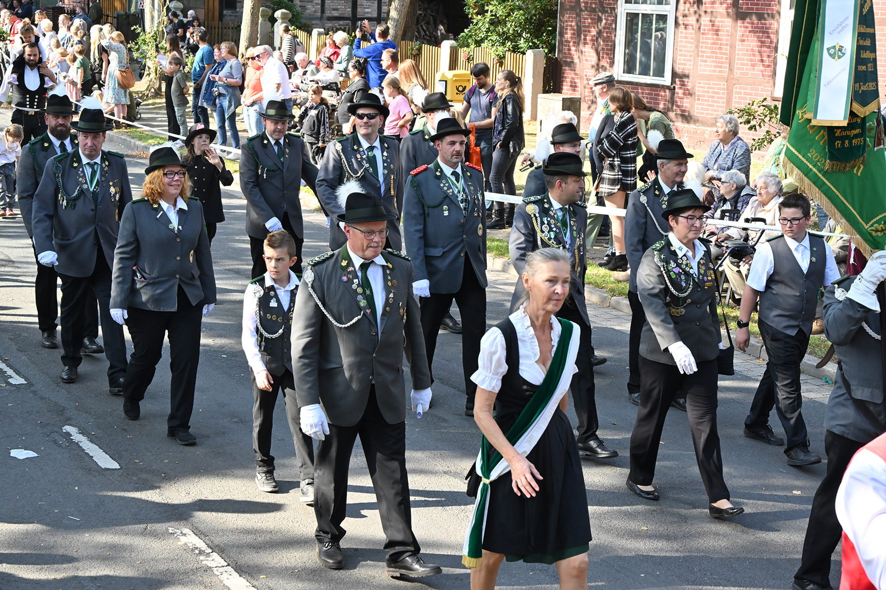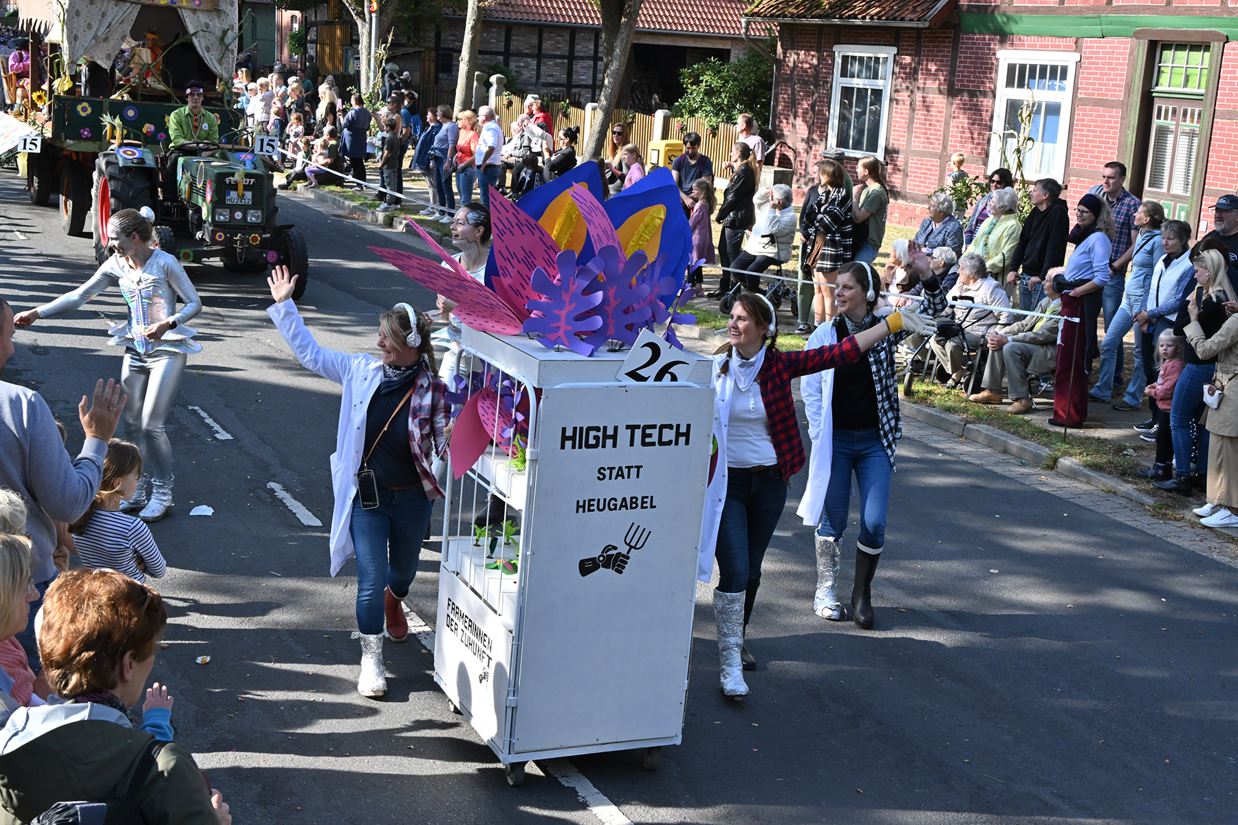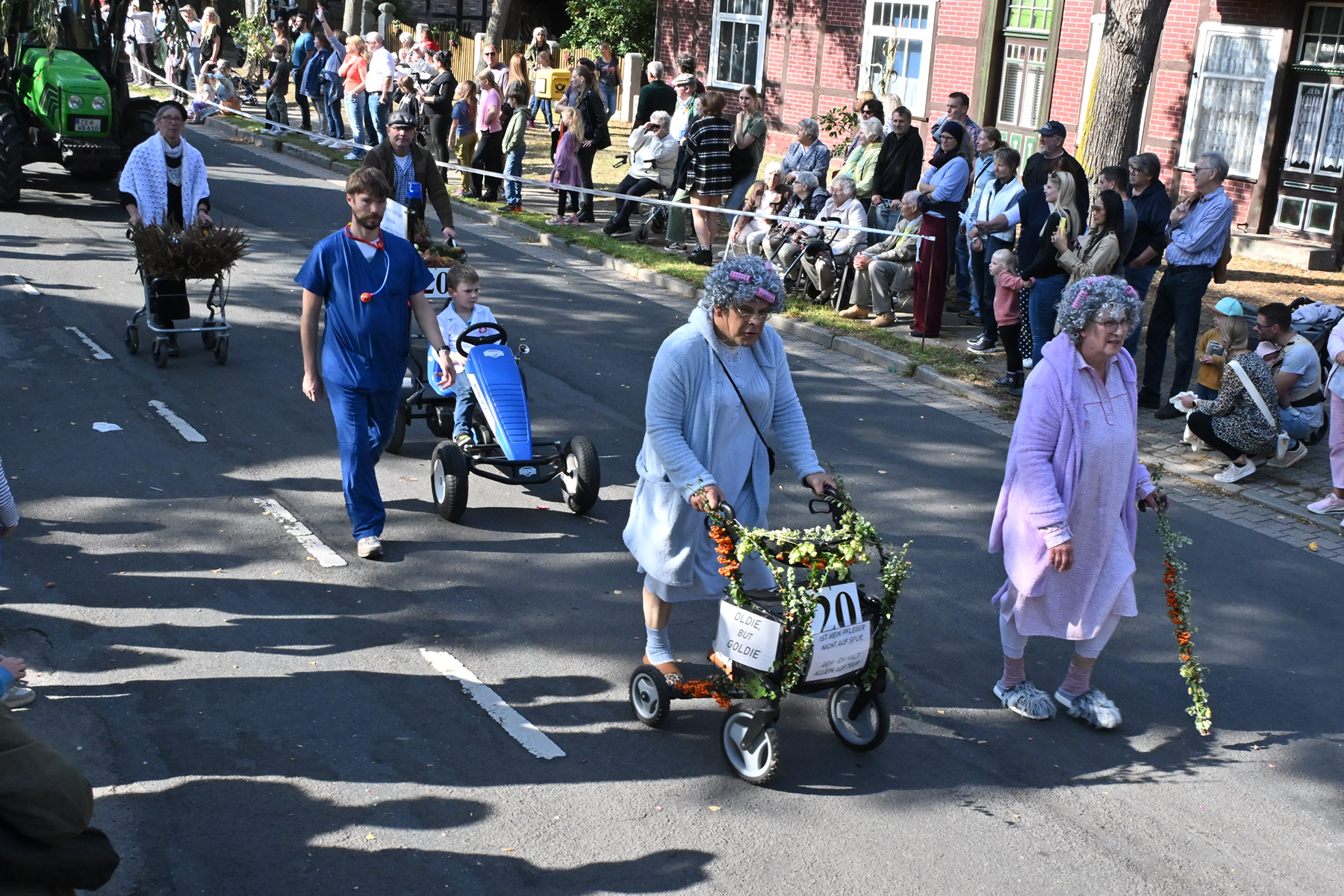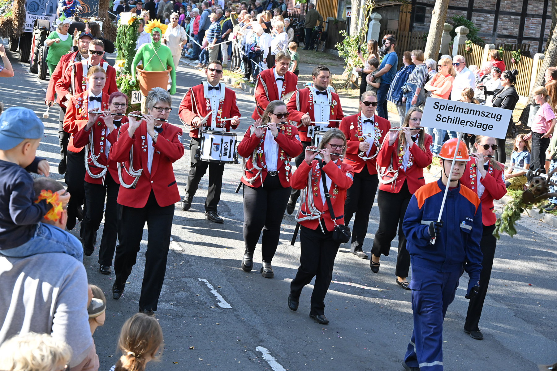 Anschließend setzte sich der Festumzug, angeführt von der Erntekrone, getragen von Dominik Schlumbohm und begleitet von den sechs Kronengirls, auf die zweifache Runde durch den Ort. Die Zuschauer jubelten den Umzugsteilnehmern zu, und für die jüngsten Besucher sprang dabei auch die eine oder andere Süßigkeit heraus.