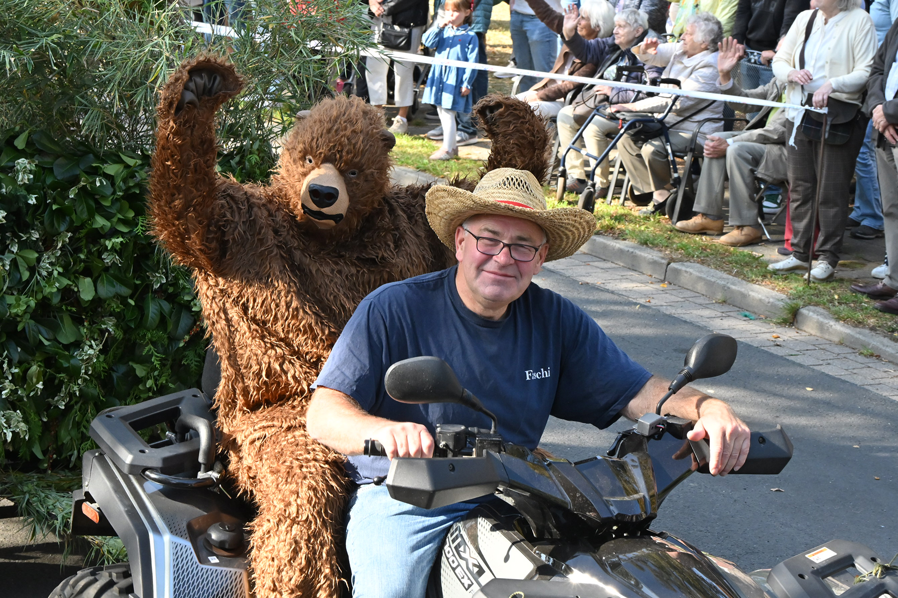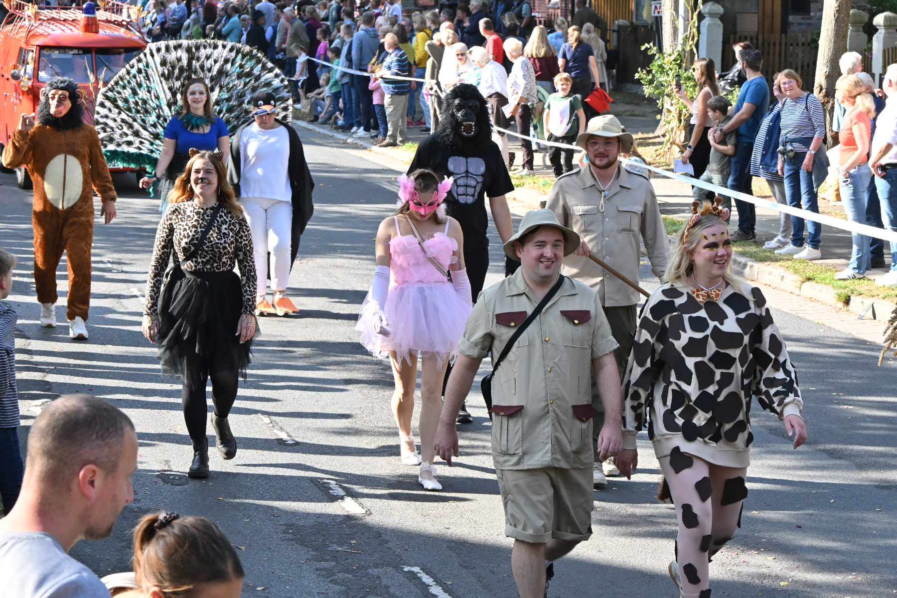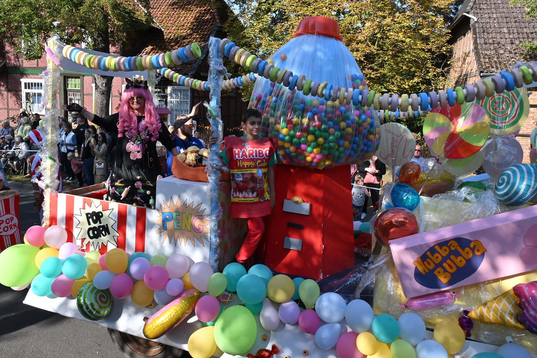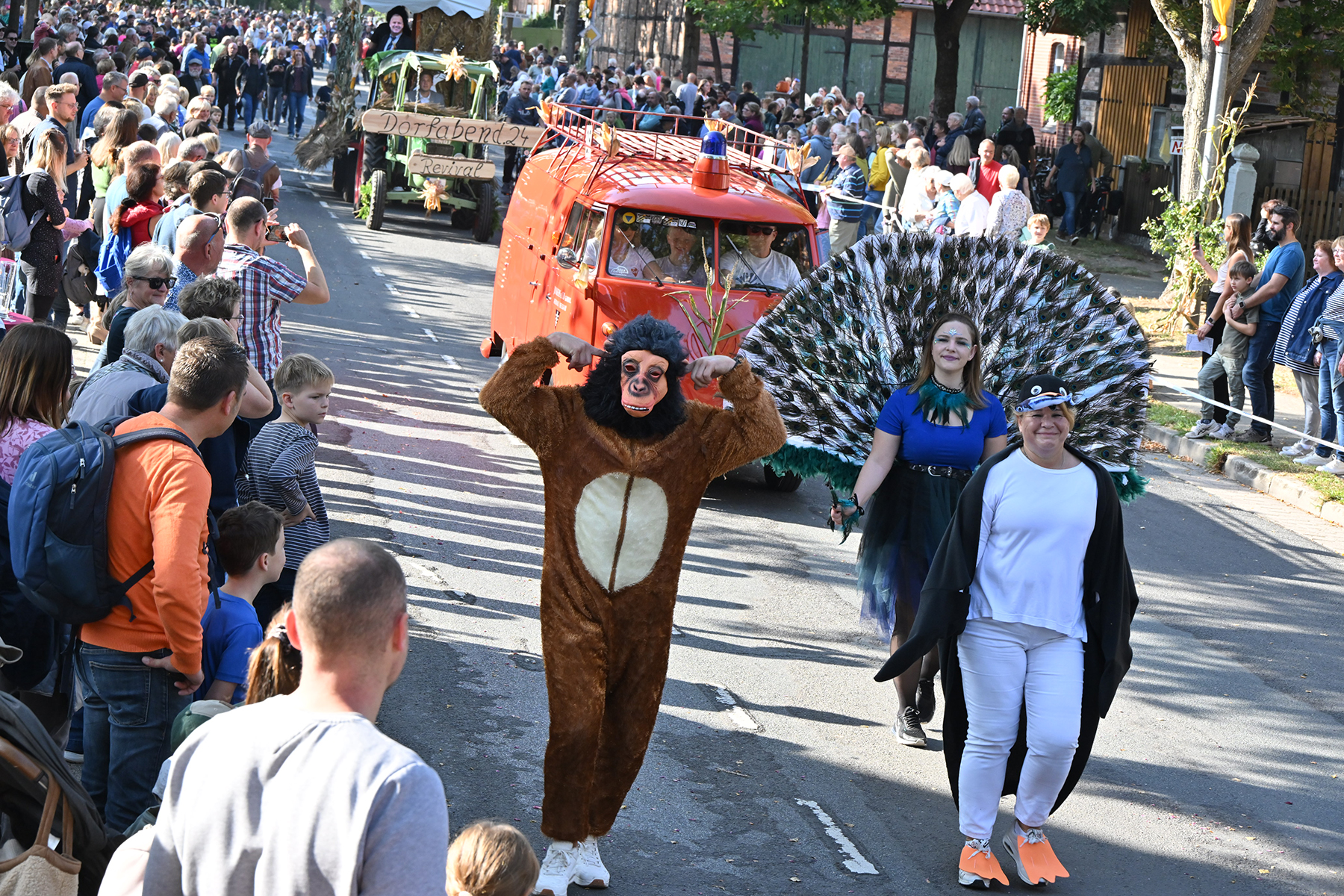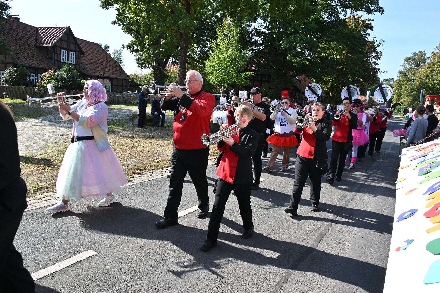 Anschließend setzte sich der Festumzug, angeführt von der Erntekrone, getragen von Dominik Schlumbohm und begleitet von den sechs Kronengirls, auf die zweifache Runde durch den Ort. Die Zuschauer jubelten den Umzugsteilnehmern zu, und für die jüngsten Besucher sprang dabei auch die eine oder andere Süßigkeit heraus.