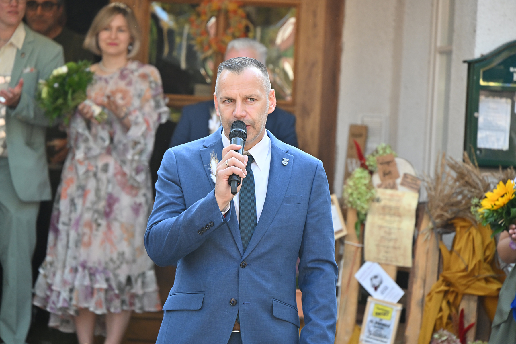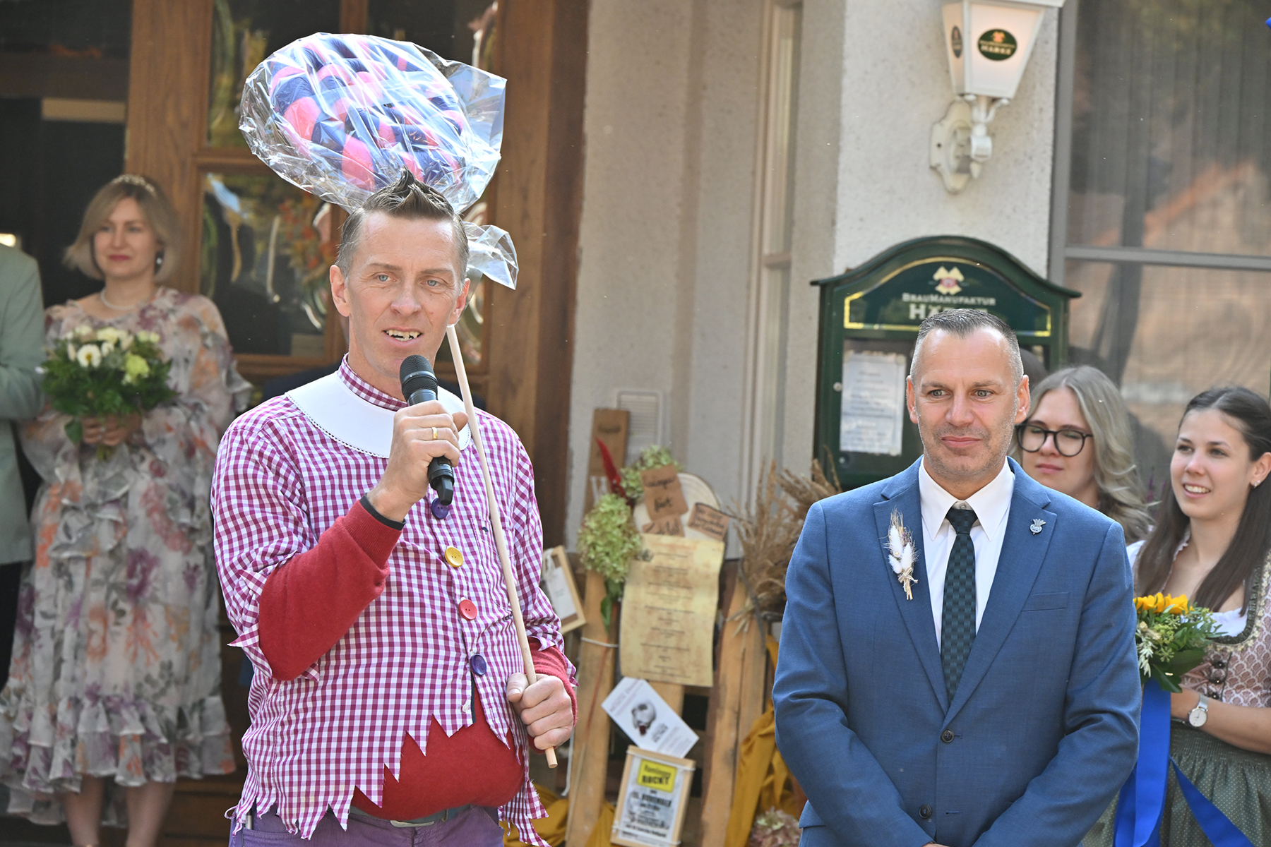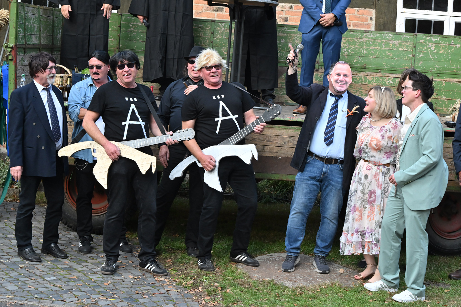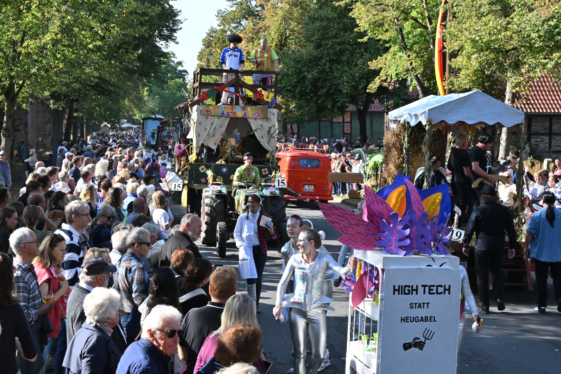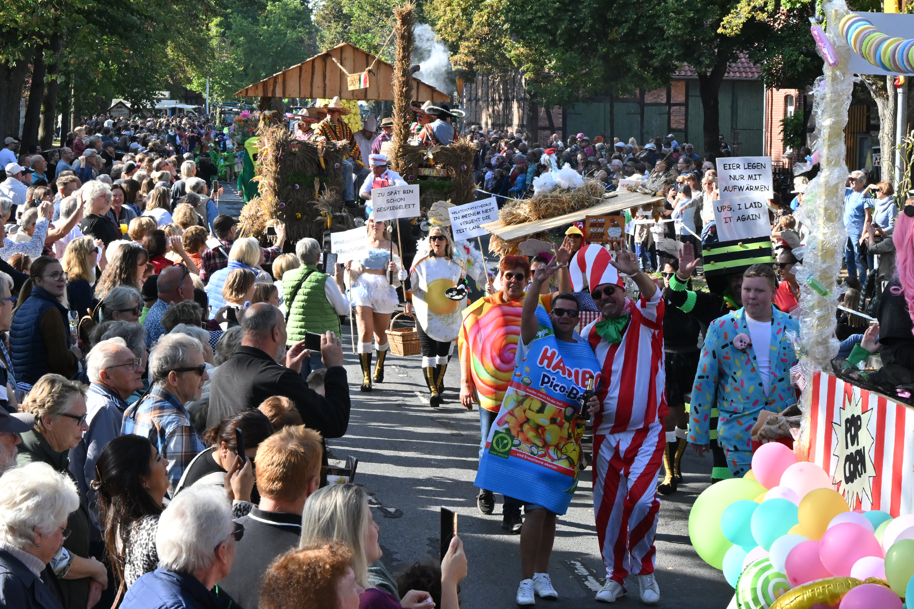 Vor dem Festumzug, dem alle entgegenfieberten, begrüßte Timo Wöhler, Sprecher der Dorfgemeinschaft, die Gäste und insbesondere den Ortsrat um Ortsbürgermeister Wolfram Nolte, den Ältestenrat sowie die ehemaligen Erntekönige. „Wir sind stolz auf diese Gemeinschaft“, betonte Wöhler. Vor allem dankte er den Wagenbauern und Fußgruppen, „die sich immer viel einfallen lassen“, für ihr Engagement. „Es war eine irre Anzahl an Zuschauern.“ Am Umzug nahmen elf festlich geschmückte Wagen und 19 Fußgruppen teil. „Die Dorfgemeinschaft ist wieder stolz auf unsere Wagenbauer und unsere Fußgruppen, die sich erneut viele tolle Ideen haben einfallen lassen. Festlich geschmückte Wagen, bunt gekleidete Gruppen – ich weiß gar nicht, was hier alles rumläuft: Es geht von Tieren über Schneckenkorn, Gemüse und Lollies. Ramlingen ist bunt und das wollen wir hier und heute noch einmal feiern“, so Wöhler.