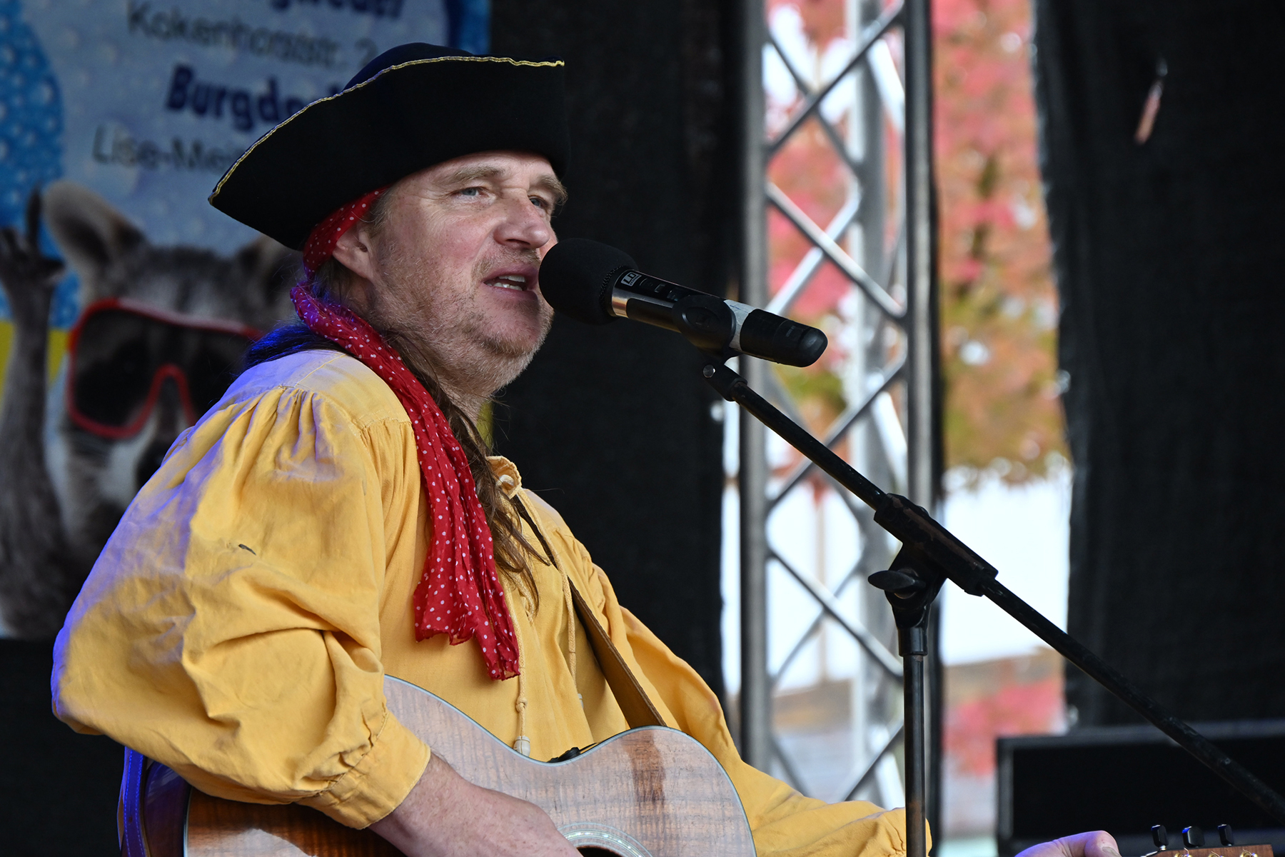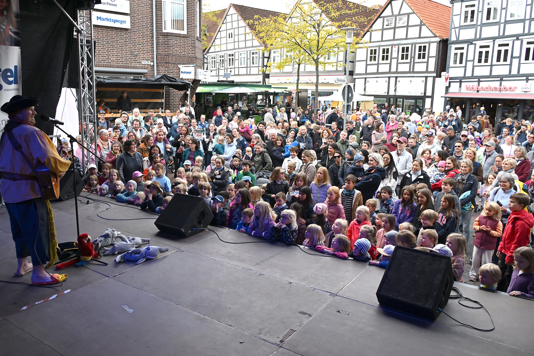 Anschließend waren die jüngsten Besucher vor die Bühne geströmt: Mathias Lück präsentierte Kindermusik zum Mitmachen unter dem Motto „Lieder von Papageien und Piraten“. Da hieß es erstmal, das Publikum einzustimmen und mit einem kräftigen „Ahoi“ zu begrüßen. Anschließend ging „Pirat Matjes“ mit den jungen Zuhörern auf Seefahrt.