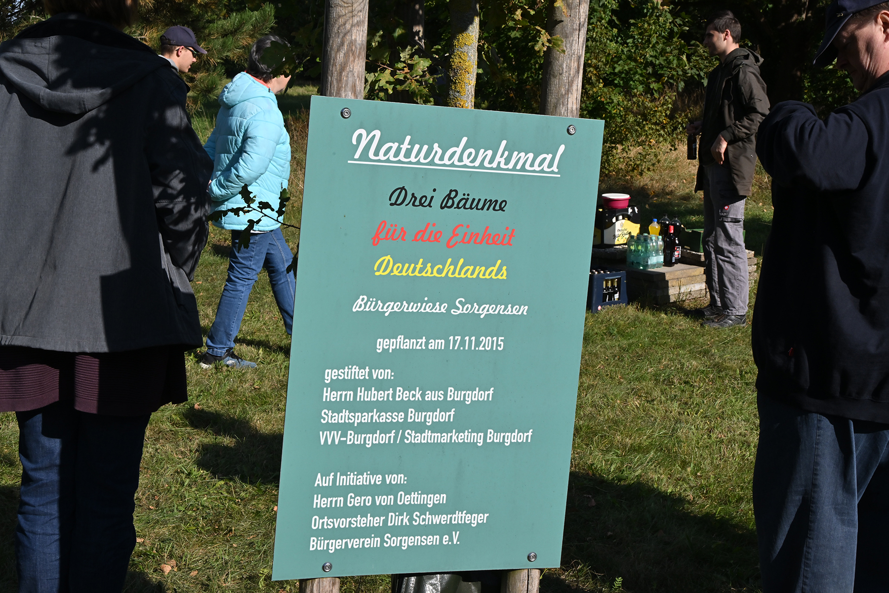 Am Naturdenkmal auf der Bürgerwiese in Sorgensen, in der Mitte zu sehen die Eiche als Symbol für das wiedervereinigte Deutschland, wurde eine Feierstunde zum Tag der Deutschen Einheit mit anschließenden Gesprächen begangen.