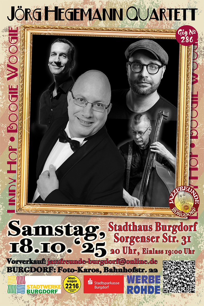 Am Sonnabend, 18. Oktober 2025, glüht der Jazzsalon im Stadthaus Burgdorf. Auf der Bühne performt das Jörg Hegemann Quartett. Das sind Jörg Hegemann (p, Witten), Daniel Paterok (p, Dortmund), Andreas Müller (b, Dortmund) und Oliver Mewes (dm, Leverkusen). Dancefloor angelegt.
