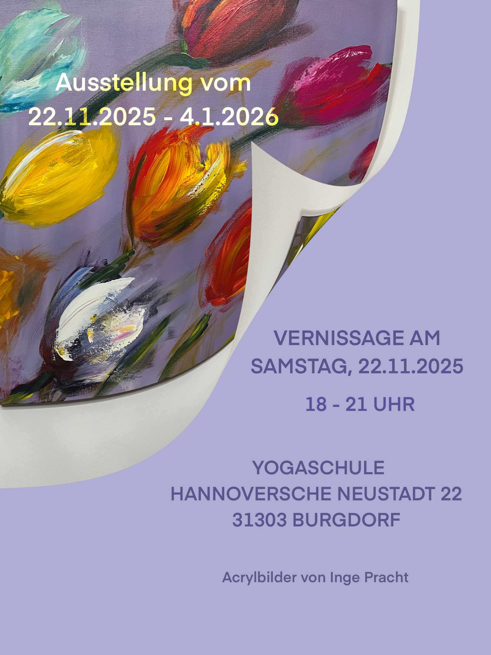 Die Ausstellung verbindet künstlerische Positionen mit der Atmosphäre einer Yogaschule. Besucherinnen und Besucher erwartet ein Abend zwischen stillem Innehalten und lebendigen Gesprächen – offen für alle, unabhängig davon, ob sie Yoga praktizieren oder einfach neugierig auf Kunst und Ambiente sind.