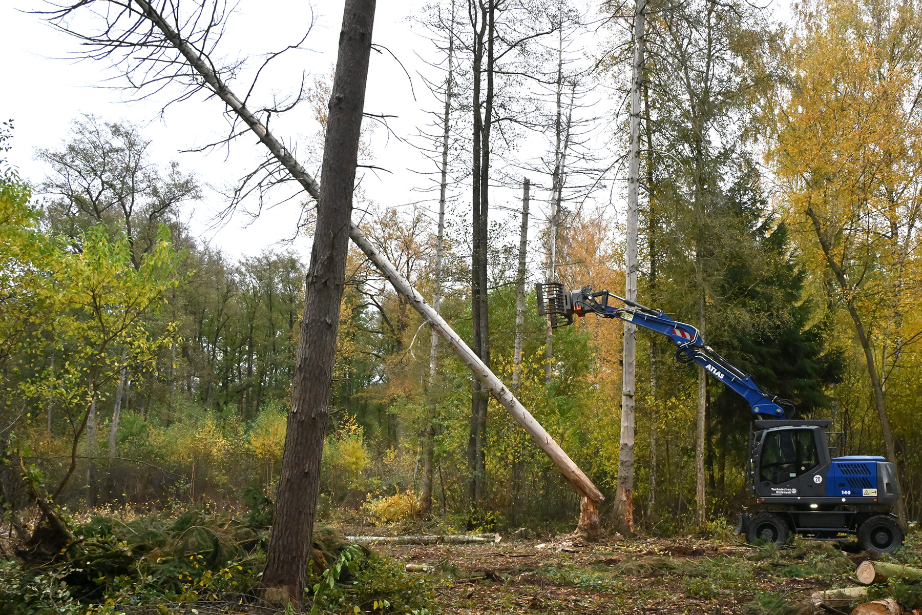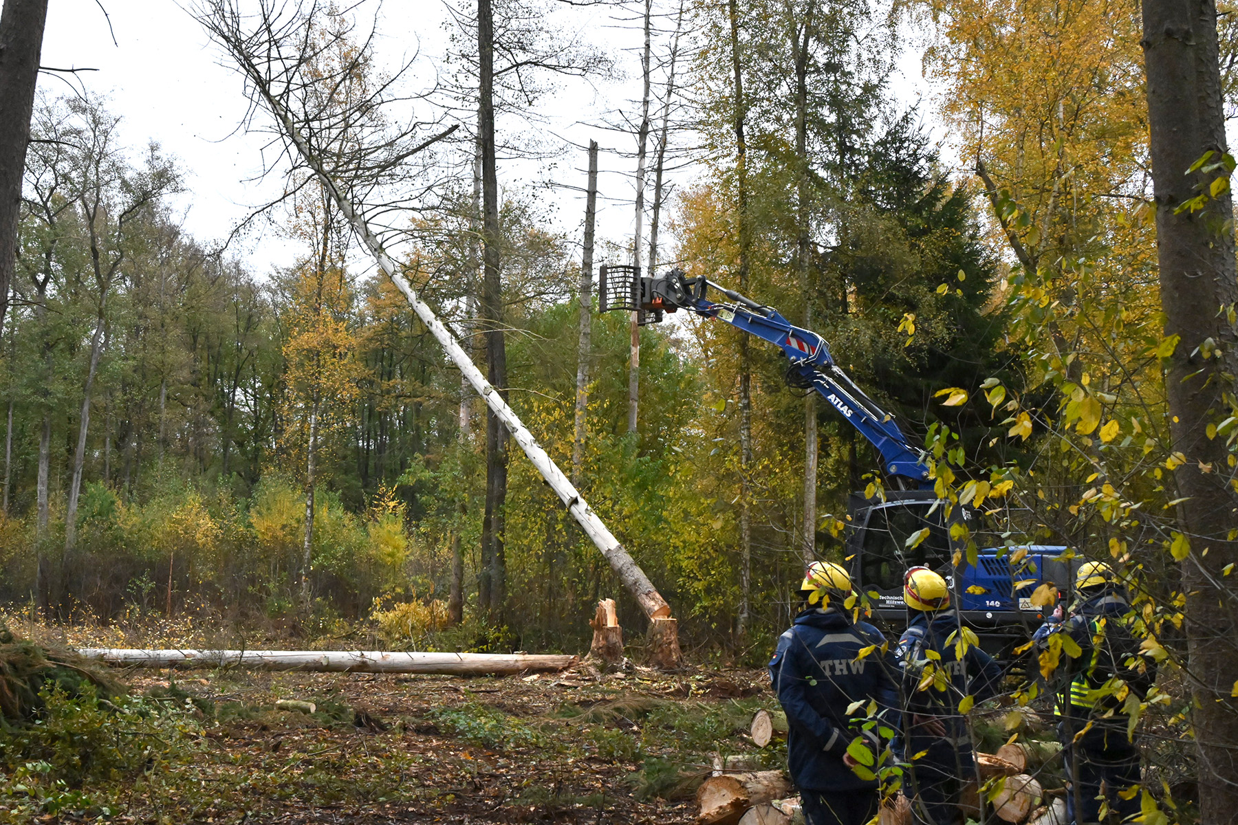 Bäume wurden gefällt, auf Länge gebracht und anschließend abtransportiert. Im Ernstfall entfällt der Transport, so Hennecke. Da bei der Übung jedoch Privatgrund genutzt wurde, um zu üben, wird das Holz zu einem Ablageort transportiert. „Es ist schwierig, ein Übungsgelände zu finden“, betont er. Mit Landwirt Florian Bethmann aus Weferlingsen wurde ein Waldeigentümer gefunden, der die Übung überhaupt erst möglich gemacht hatte. „Es wurde überwiegend Totholz oder vom Borkenkäfer befallene Bäume gefällt, die sowieso entfernt werden mussten. Der Boden wurde zudem gemulcht, sodass nun Platz für eine Neupflanzung ist“, so Bethmann. Als Ortsbrandmeister von Burgdorf interessierte ihn vor Ort ebenso, wie das THW mit den Gerätschaften vorgeht.