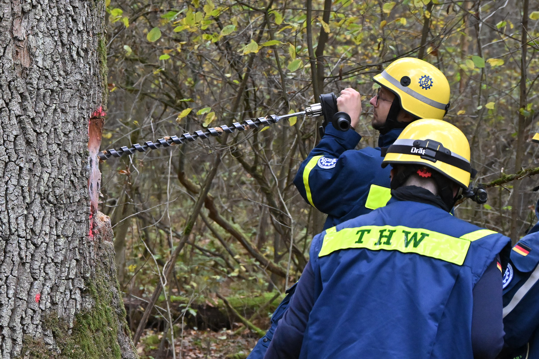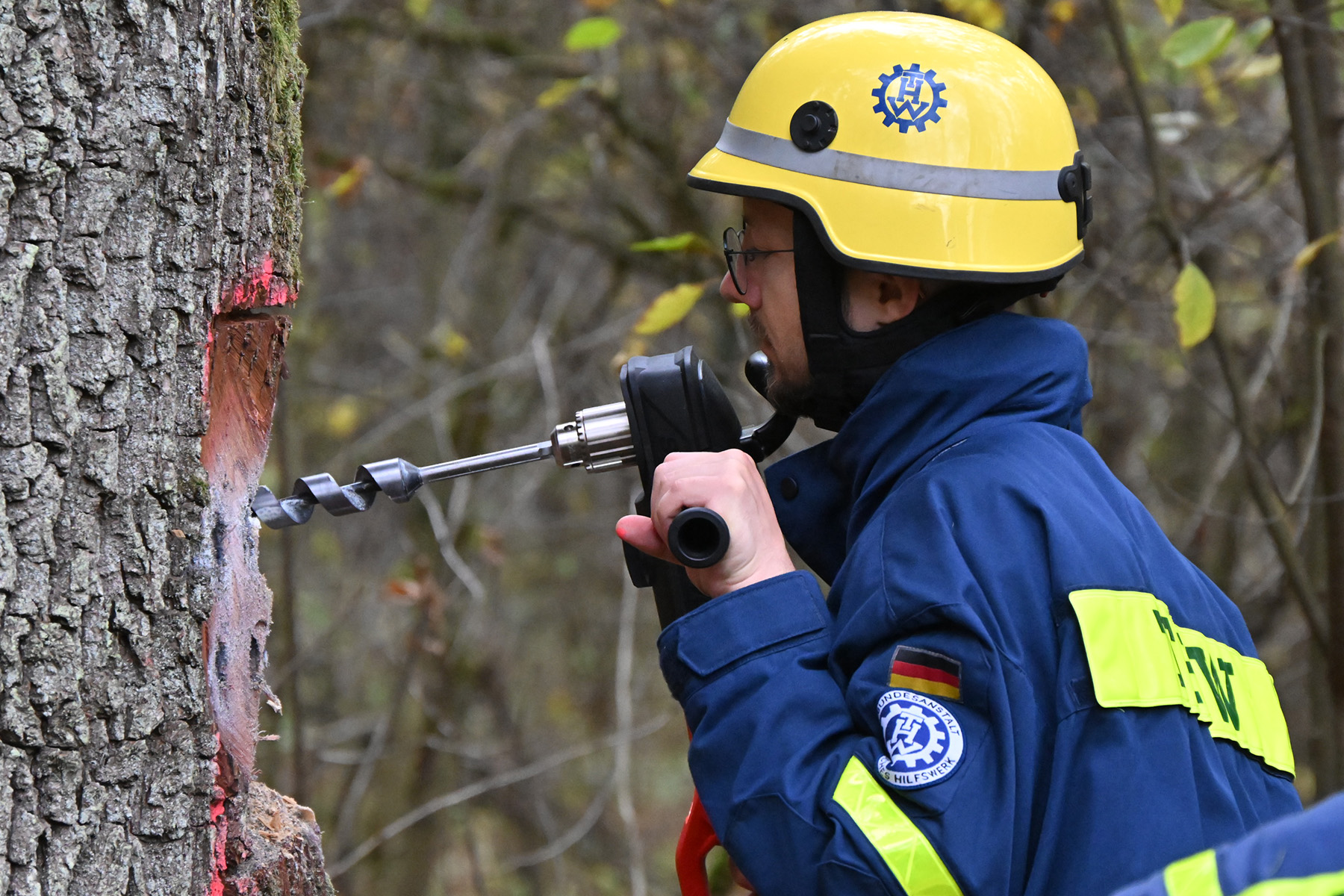 Vor ein großes Problem stellte die THW-Helfer eine rund 25 Meter hohe Eiche mit einem Stammdurchmesser von etwa 110 Zentimetern. Der Baum, der zur Hälfte bereits abgestorben war, sollte durch eine Sprengung gefällt werden. Die Fachgruppe Sprengen des THW-Ortsverbands Braunschweig bereitete am Vormittag die Bohrlöcher vor und präparierte den Baum mit Sprengladungen. Am Nachmittag ertönte dann ein lauter Knall, und die Eiche fiel in die zuvor berechnete Richtung. Auch dieses Vorgehen üben die THW-Helfer nicht jeden Tag. Mit Applaus wurde die gelungene Sprengung begleitet.