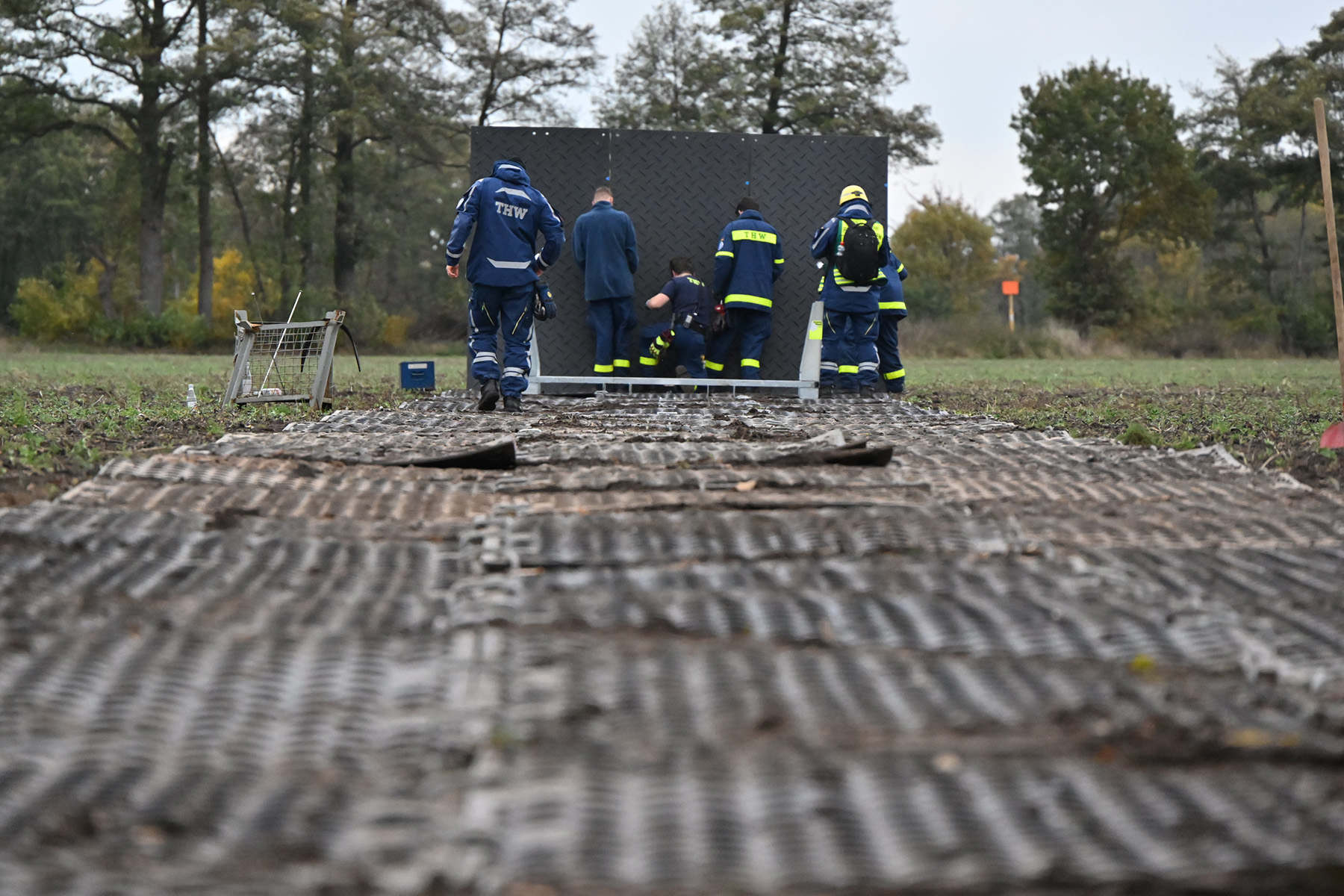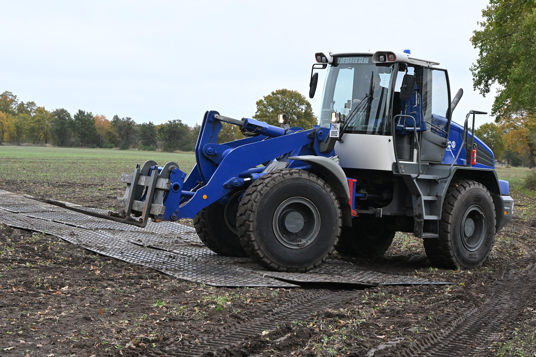 Derweil hatte eine andere Gruppe rund 80 Meter Fahrplatten verlegt – jede 220×120 Zentimeter groß und 40 Kilogramm schwer. Mit einem Radlader wurden die Paletten mit den Platten an den Einsatzort gebracht. Die einzige Einsatzstelle, bei der Muskelkraft überwiegte, wenn die Helfer die Platten in Position bringen und miteinander verbinden.