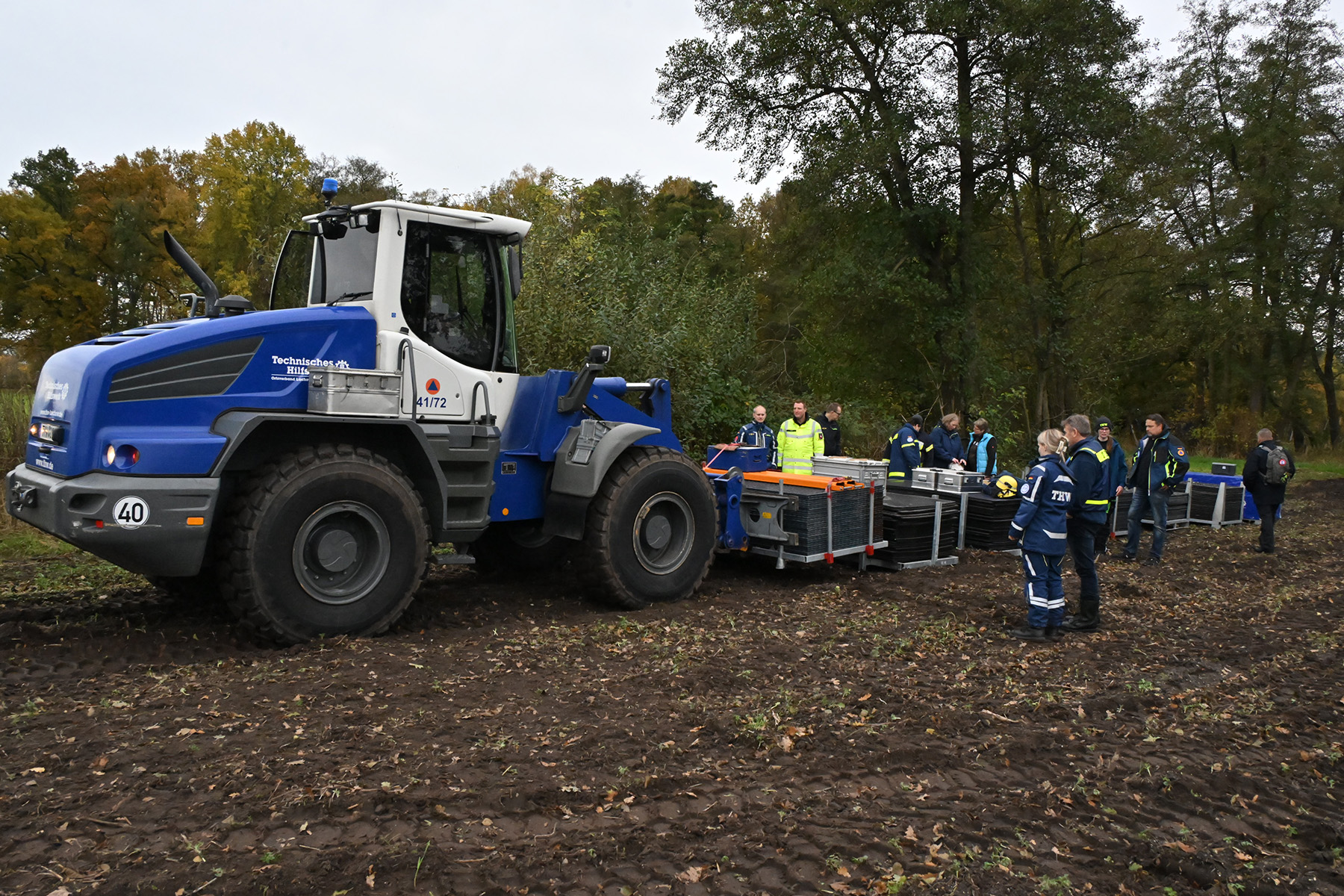 Hintergrund waren zahlreiche Wald- und Vegetationsbrände der vergangenen Jahre. „Die Schlagzahl hat zugenommen“, betont er. Brände in Thüringen und im Harz führt er als Beispiele an. So standen gestern zahlreiche Kipplaster, Radlader und Bagger mit Sortiergreifern im Wald, um die Übungslage mit dem Namen ‚Blauer Biber‘ zu bewältigen. Rund eineinhalb Jahre Vorlauf gehörten zur Vorbereitung. Von der Waldbrandpräventionsstelle der Niedersächsischen Landesforsten wie auch der Standortfeuerwehr der Bundeswehr in Munster gab es wertvolle Tipps, worauf es ankommt. „Wir haben uns intensiv vorbereitet“, so Hennecke weiter. Von den 18 Fachgruppen Räumen im Landesverband kamen 15 zur Übung nach Weferlingsen, so etwa auch aus weiterer Entfernung, wie aus Emden und Clausthal-Zellerfeld.