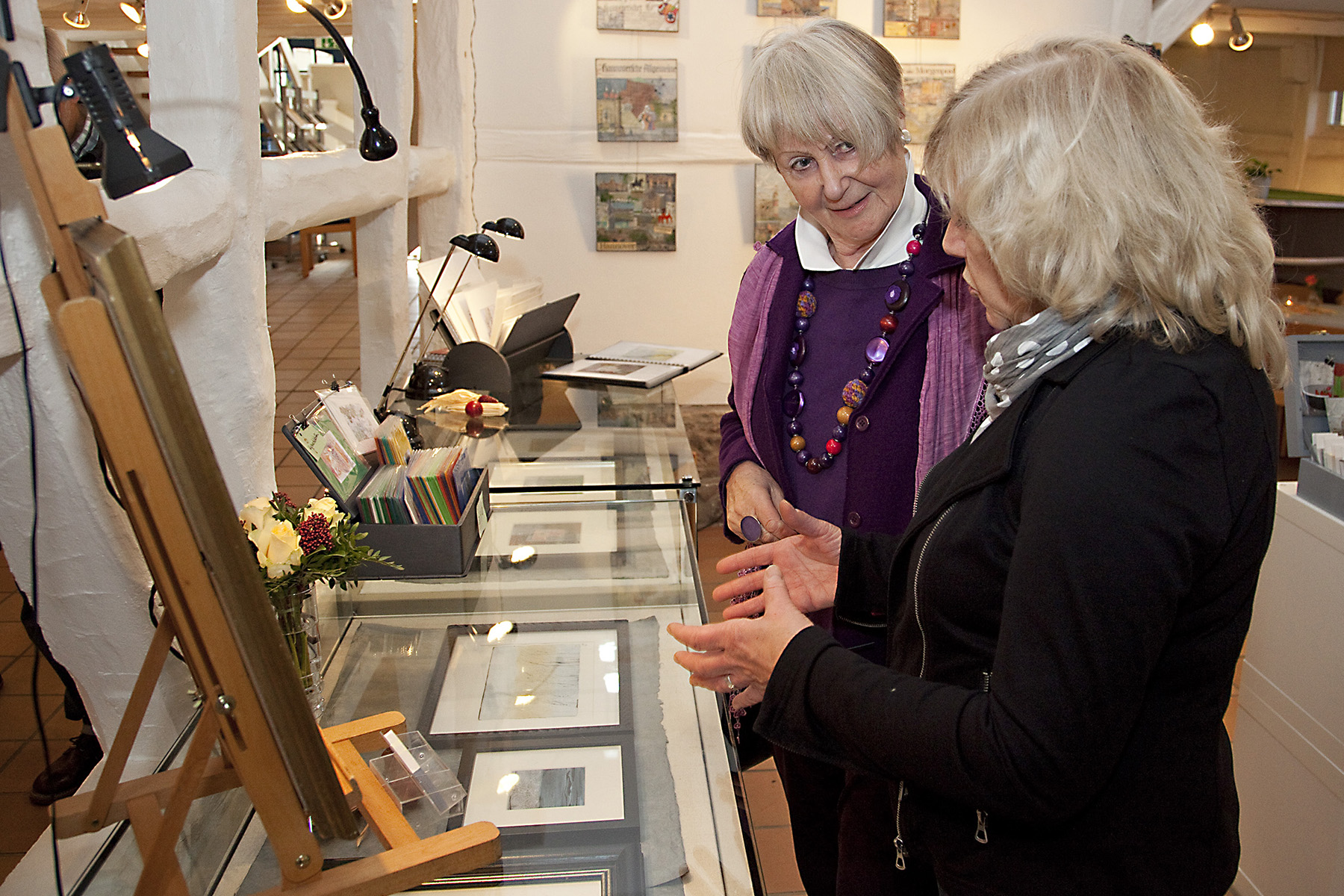 Die Einbecker Malerin Eva Hennecke zeigt eine Auswahl ihrer aktuellen Arbeiten. Dazu gehören eindrucksvolle Cyanotypien – ein historisches fotografisches Verfahren, bei dem durch Sonnenlicht charakteristische tiefblaue Bilder entstehen – sowie fein ausgearbeitete Zeichnungen, die ihre besondere Handschrift tragen. Maren Triebler und Silke Jüngst beteiligen sich mit fantasievollen, individuell gestalteten Kreationen aus Silber und Gold. Mit aus Filz gefertigten Taschen, Kissen und weiteren textilen Unikaten ist Silke Schnau vertreten. Judith Becker bietet handliche Gefäße aus Keramik für den Alltag, während Sabine Martin Kleinserien und Unikate aus Keramik und Porzellan präsentiert. Das Angebot komplettieren die kunstvollen, handgefertigten Glasobjekte von Inka Dybus.