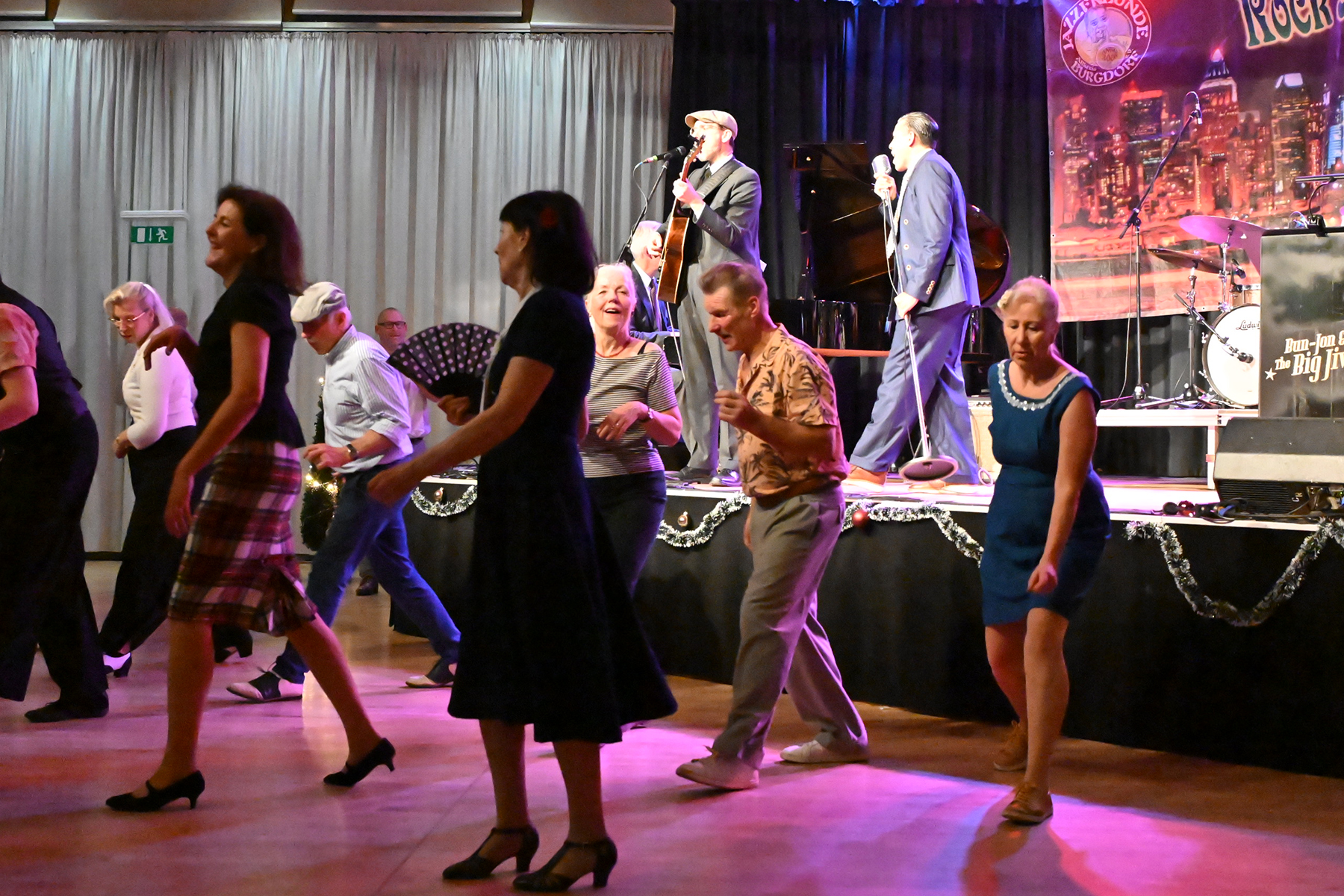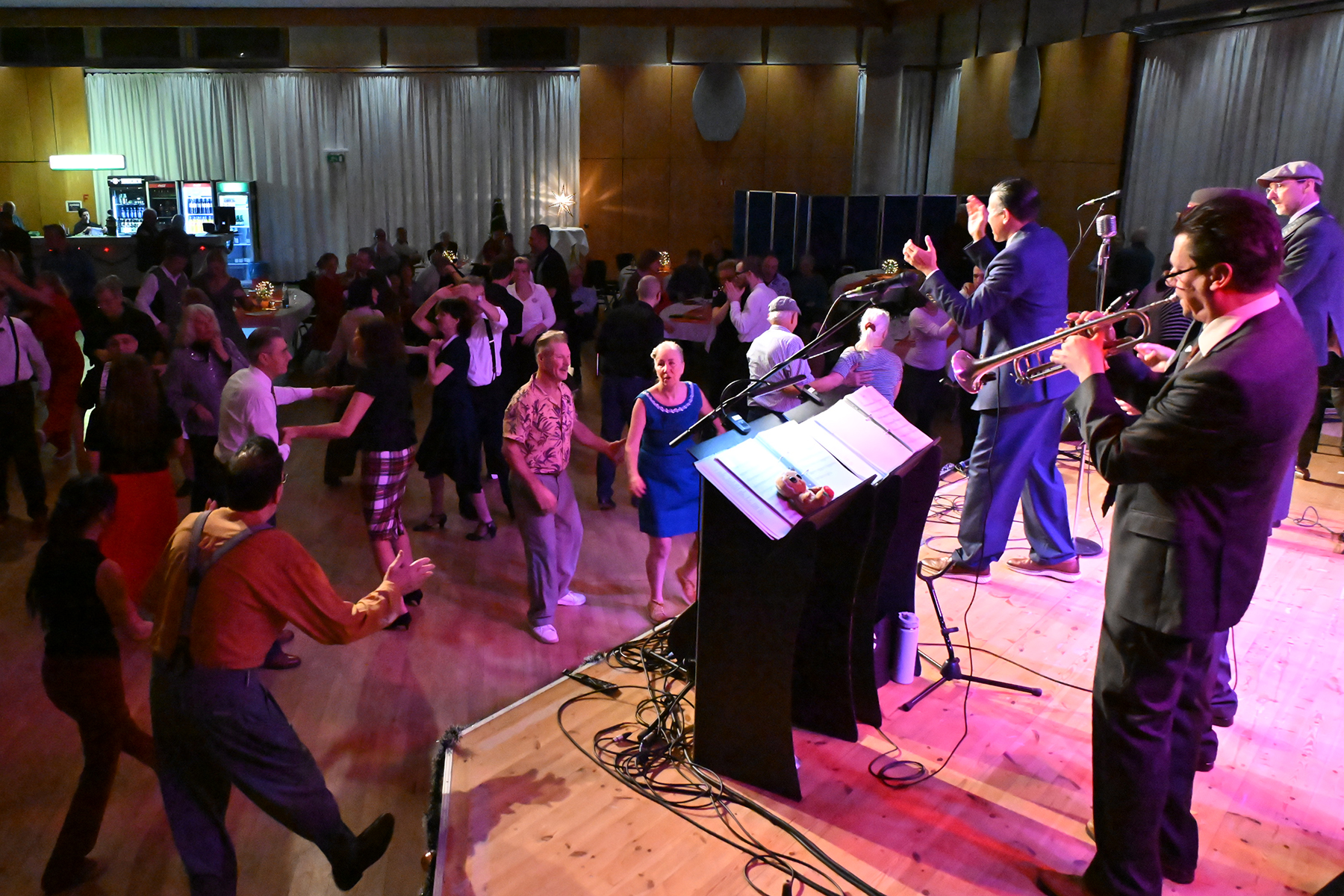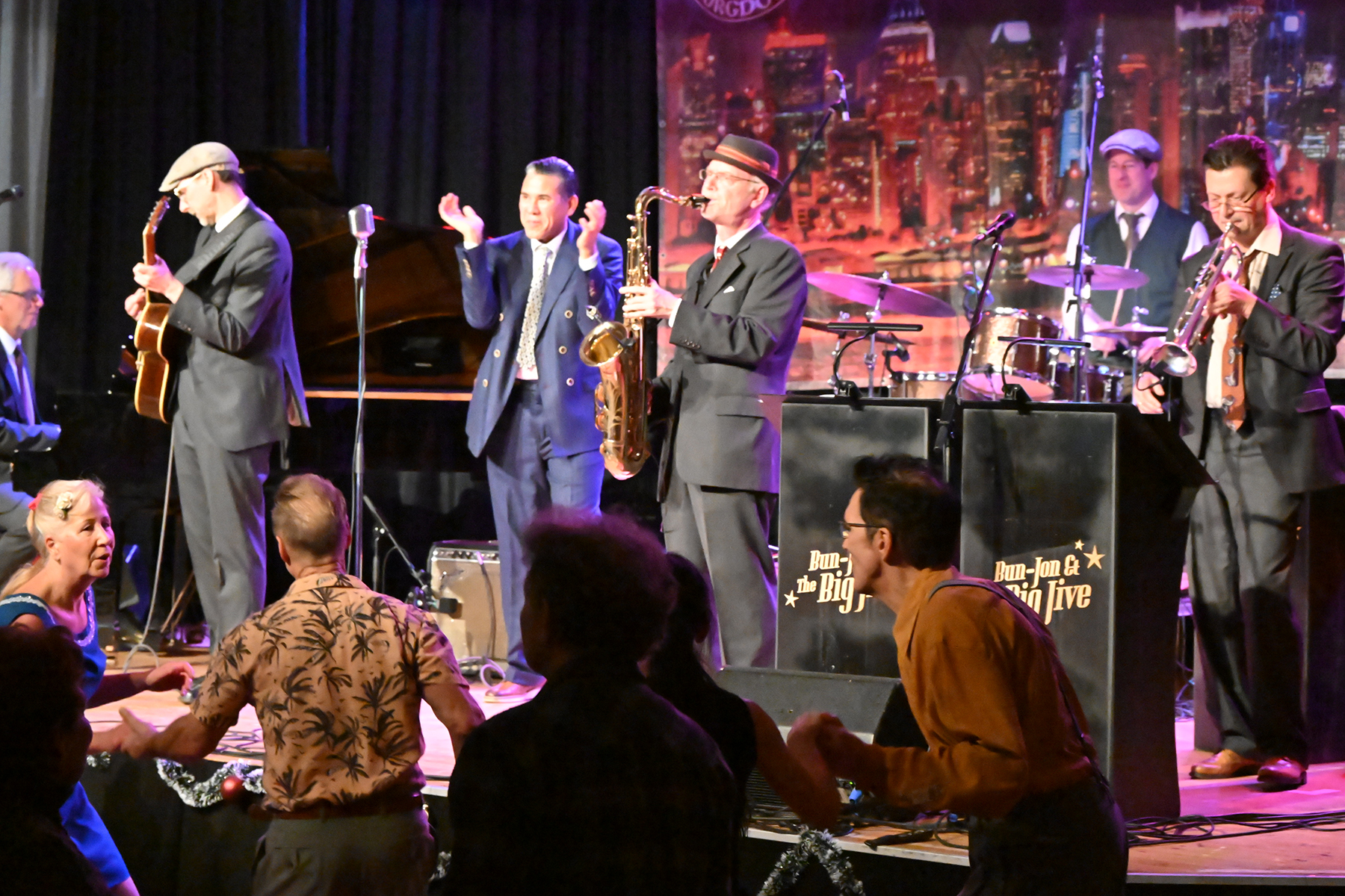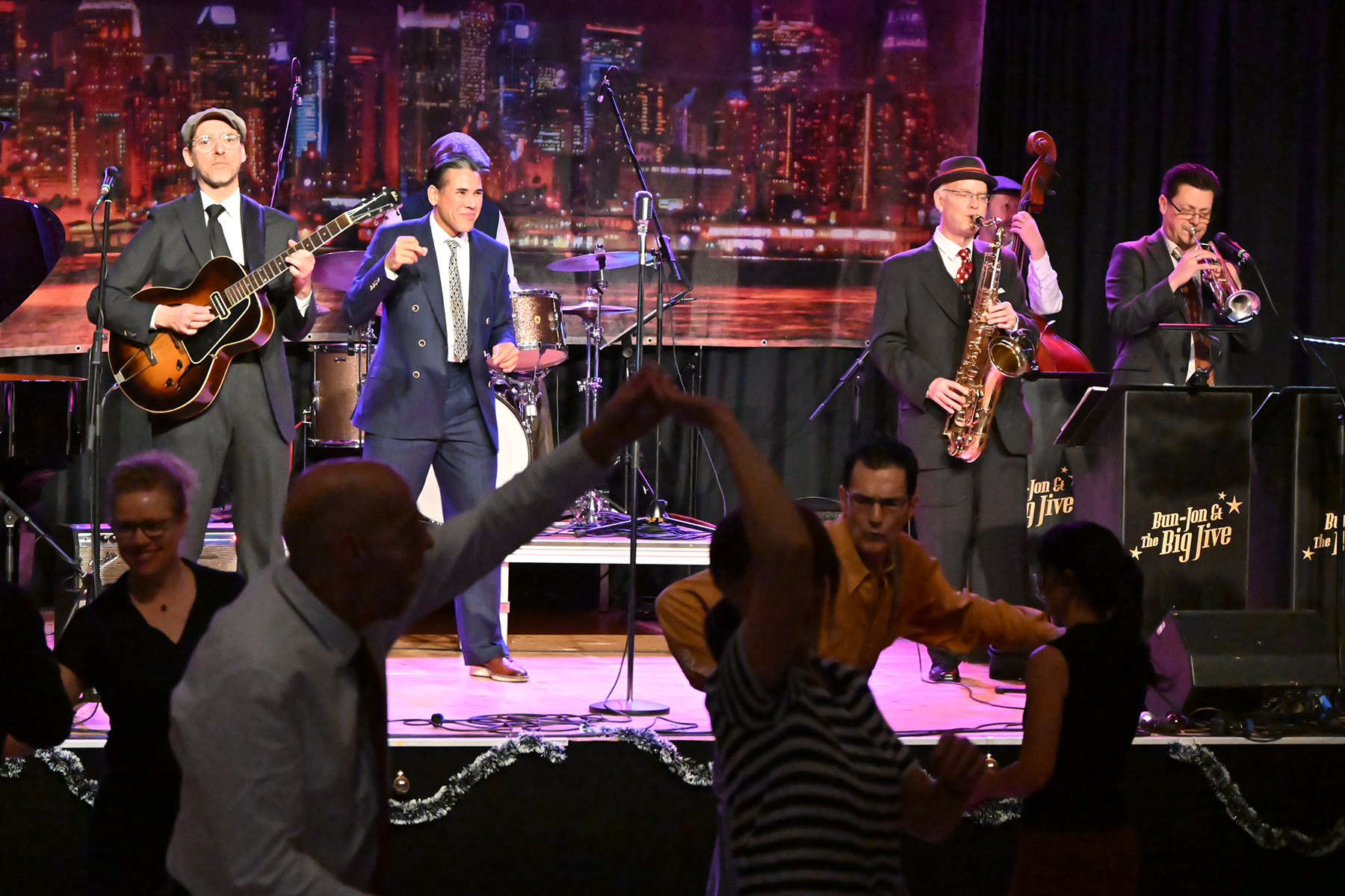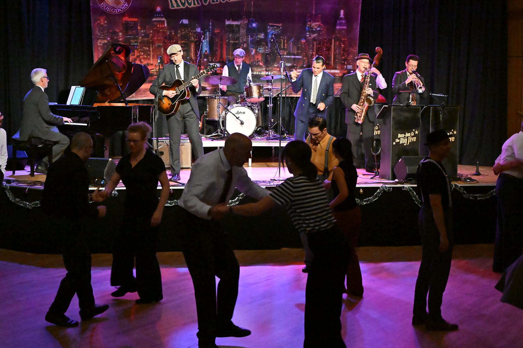 Bun-Jon & The Big Jive spielt Swing, Jump und Jive, also vor allem schwungvolle US-Tanzmusik im Stil der 1930er und 1940er Jahre, mit Titeln unter anderem in der Tradition von Louis Jordan, Nat King Cole und Ray Charles. Im Programm fanden sich auch Stücke in Anlehnung an Louis Prima, der am heutigen Sonntag, 7. Dezember, seinen 115. Geburtstag gehabt hätte. Entsprechend erschien auch das Publikum: Viele der Tänzer hatten sich stilvoll an der Mode jener Zeit orientiert, was das Gesamtbild auf der Tanzfläche zusätzlich prägte.