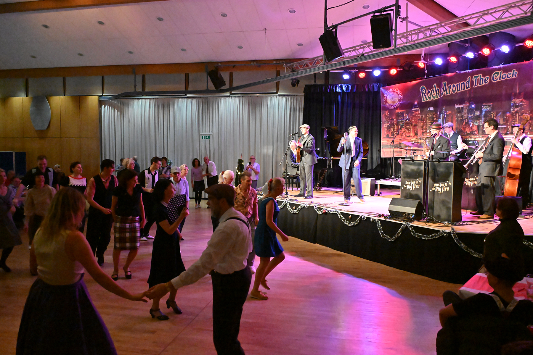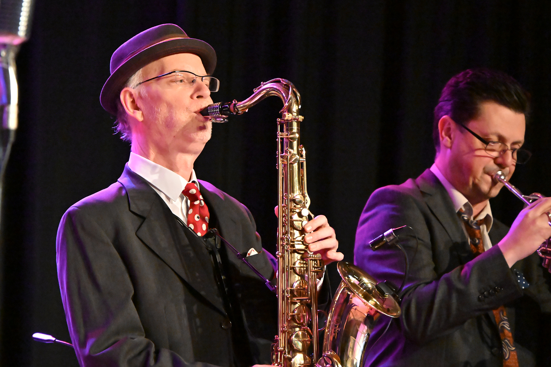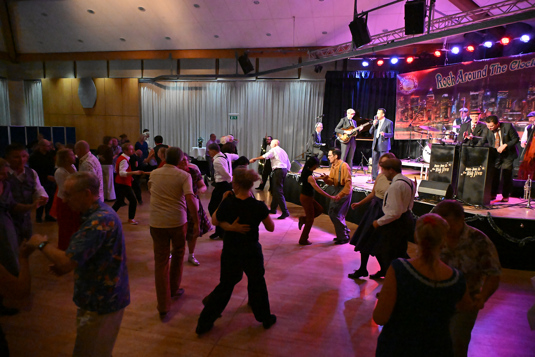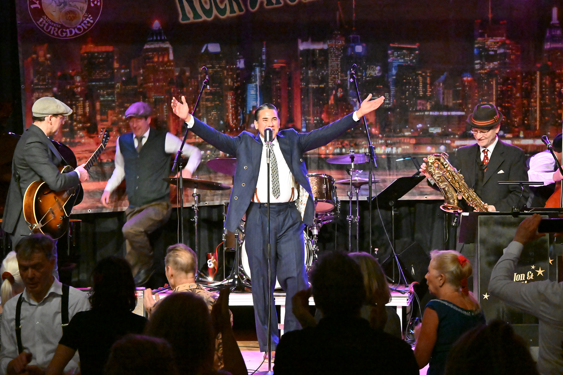 Bun-Jon & The Big Jive spielt Swing, Jump und Jive, also vor allem schwungvolle US-Tanzmusik im Stil der 1930er und 1940er Jahre, mit Titeln unter anderem in der Tradition von Louis Jordan, Nat King Cole und Ray Charles. Im Programm fanden sich auch Stücke in Anlehnung an Louis Prima, der am heutigen Sonntag, 7. Dezember, seinen 115. Geburtstag gehabt hätte. Entsprechend erschien auch das Publikum: Viele der Tänzer hatten sich stilvoll an der Mode jener Zeit orientiert, was das Gesamtbild auf der Tanzfläche zusätzlich prägte.