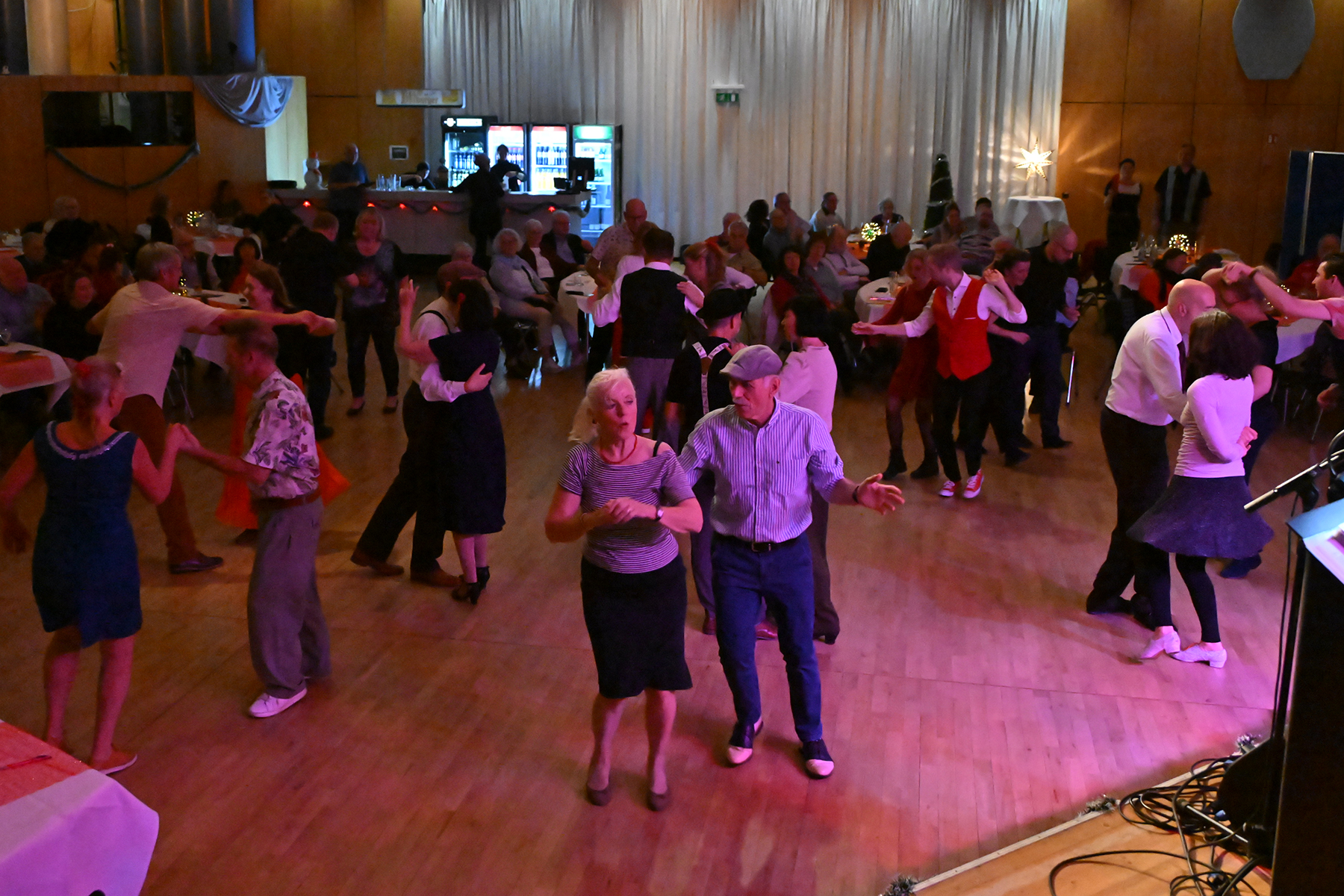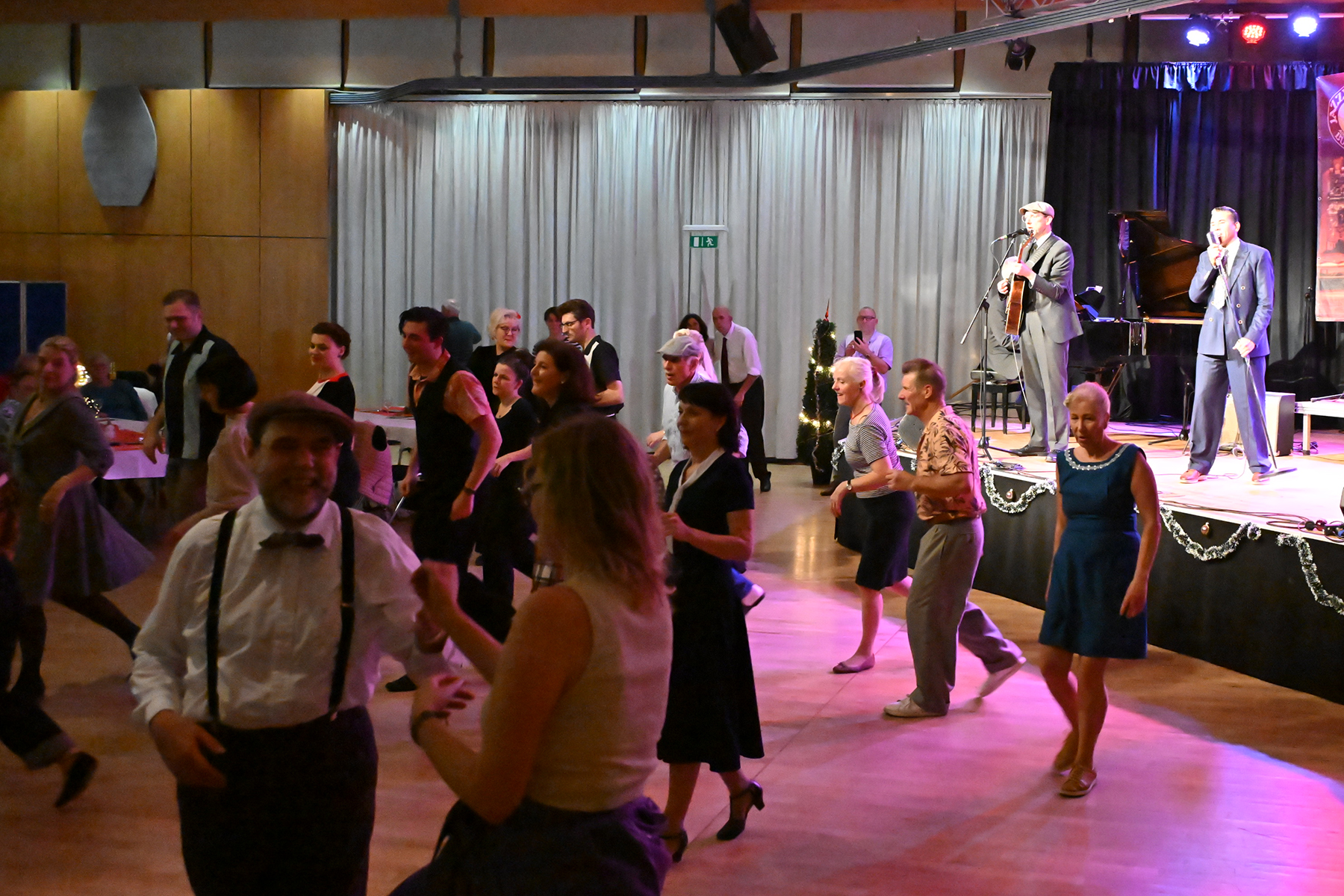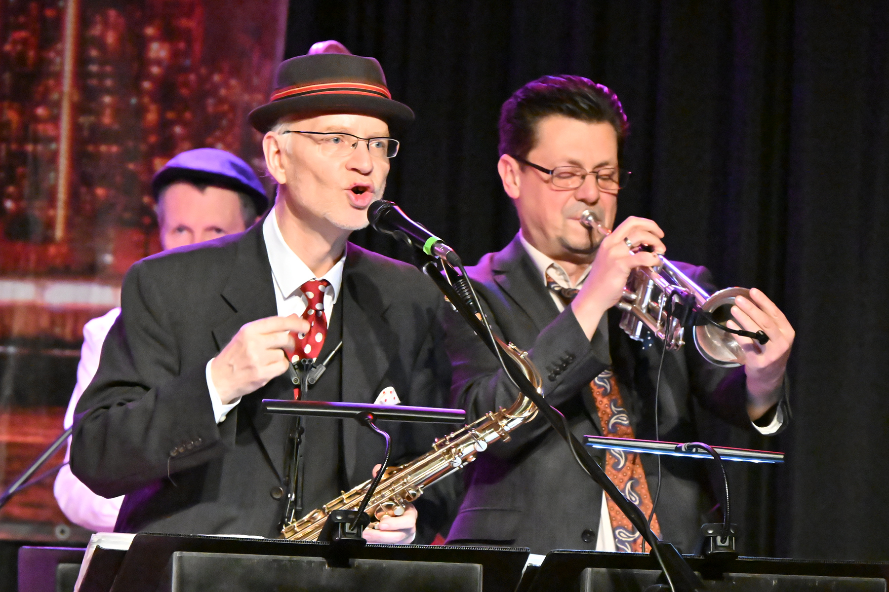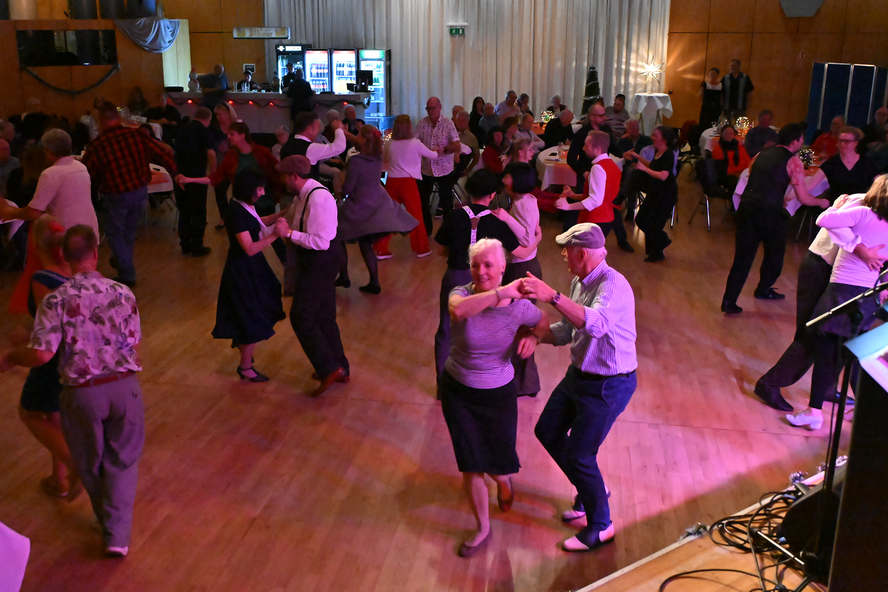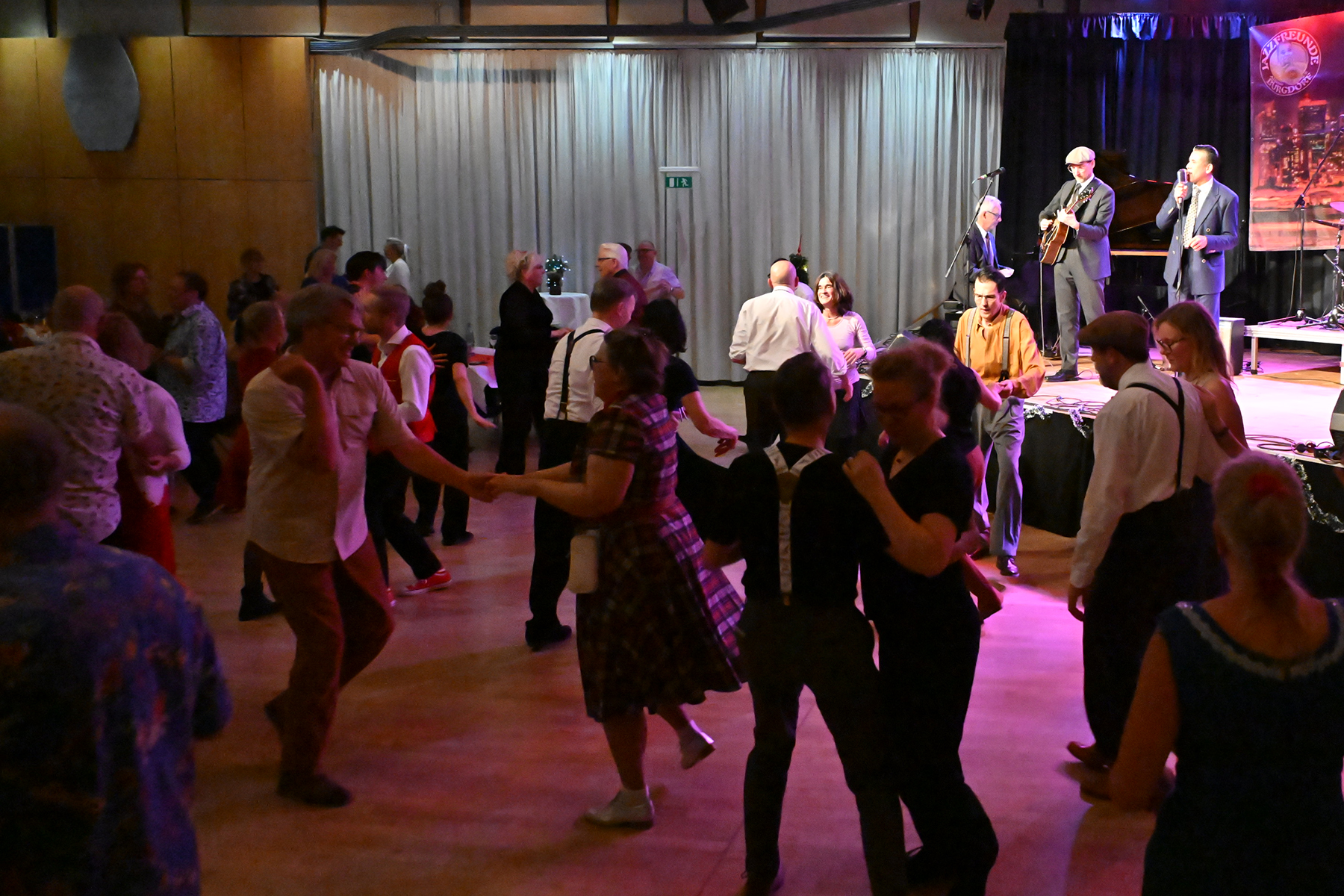 Bun-Jon & The Big Jive spielt Swing, Jump und Jive, also vor allem schwungvolle US-Tanzmusik im Stil der 1930er und 1940er Jahre, mit Titeln unter anderem in der Tradition von Louis Jordan, Nat King Cole und Ray Charles. Im Programm fanden sich auch Stücke in Anlehnung an Louis Prima, der am heutigen Sonntag, 7. Dezember, seinen 115. Geburtstag gehabt hätte. Entsprechend erschien auch das Publikum: Viele der Tänzer hatten sich stilvoll an der Mode jener Zeit orientiert, was das Gesamtbild auf der Tanzfläche zusätzlich prägte.