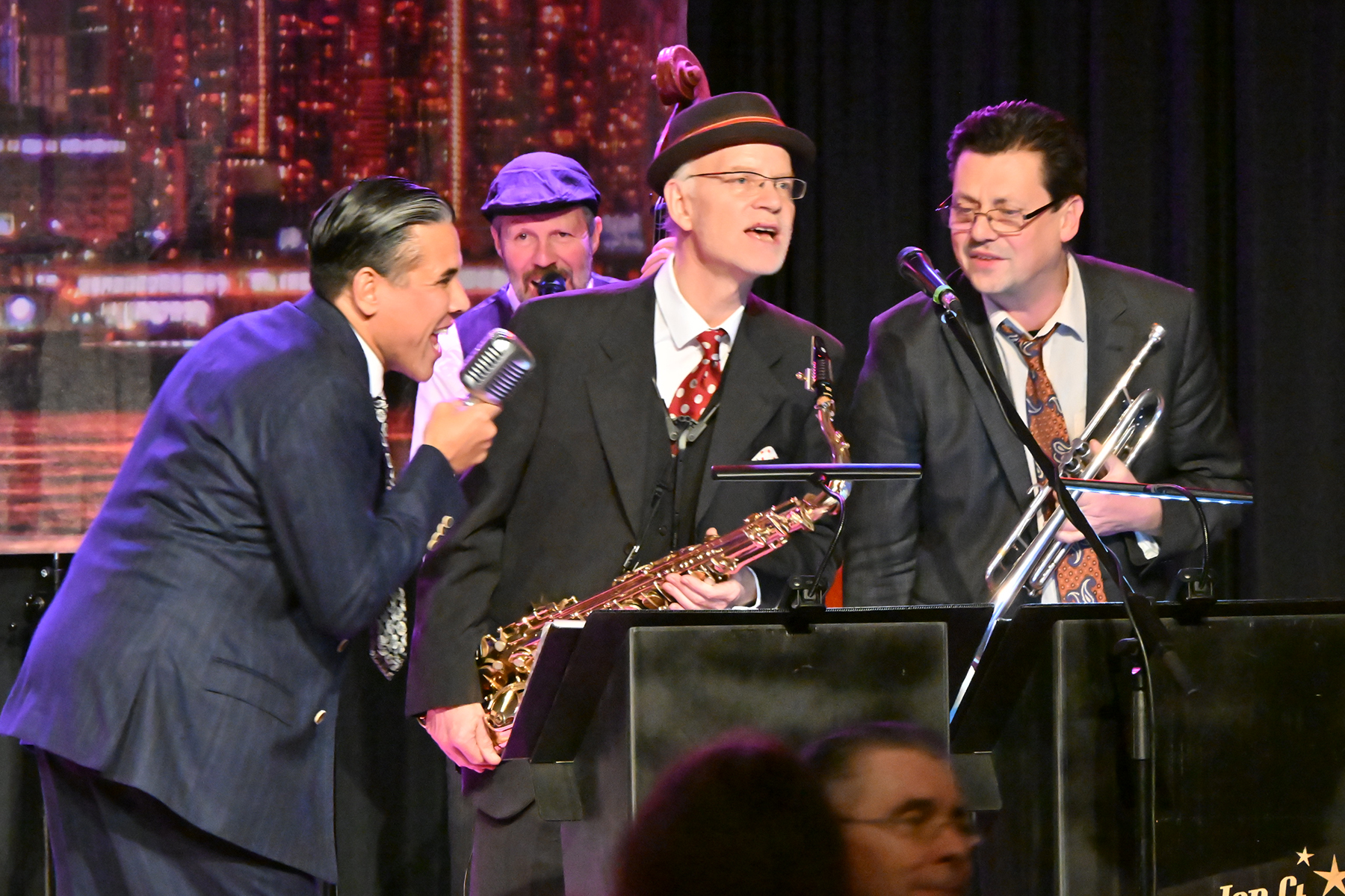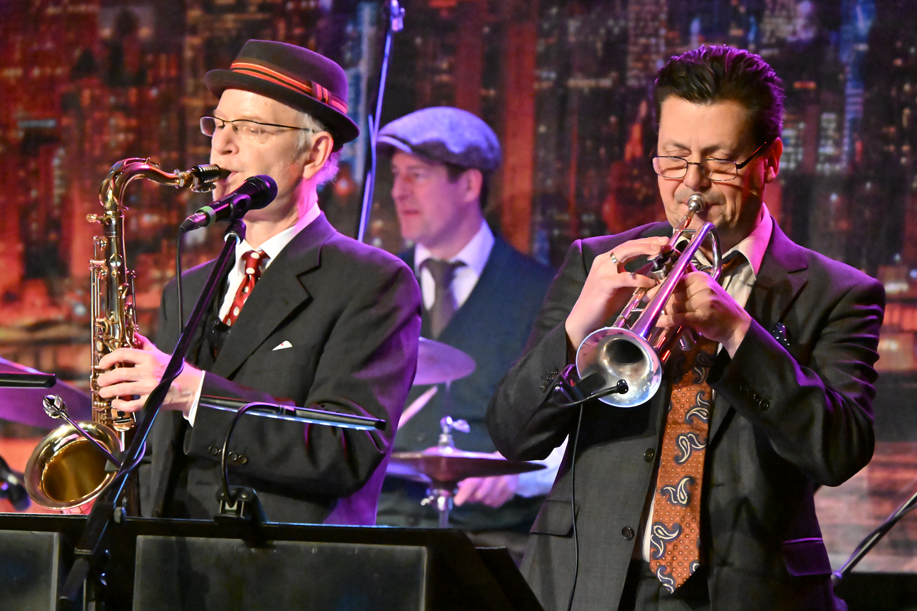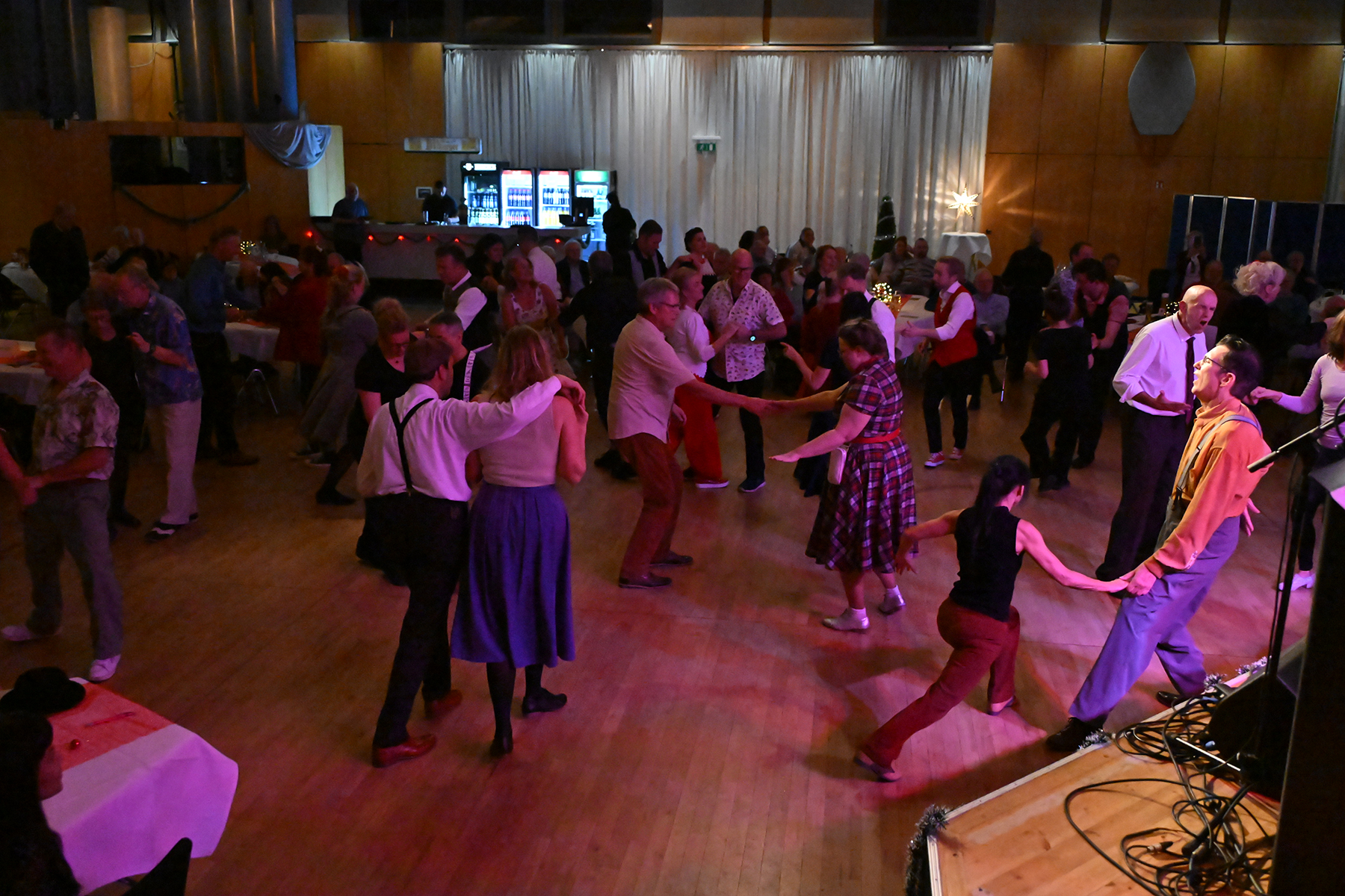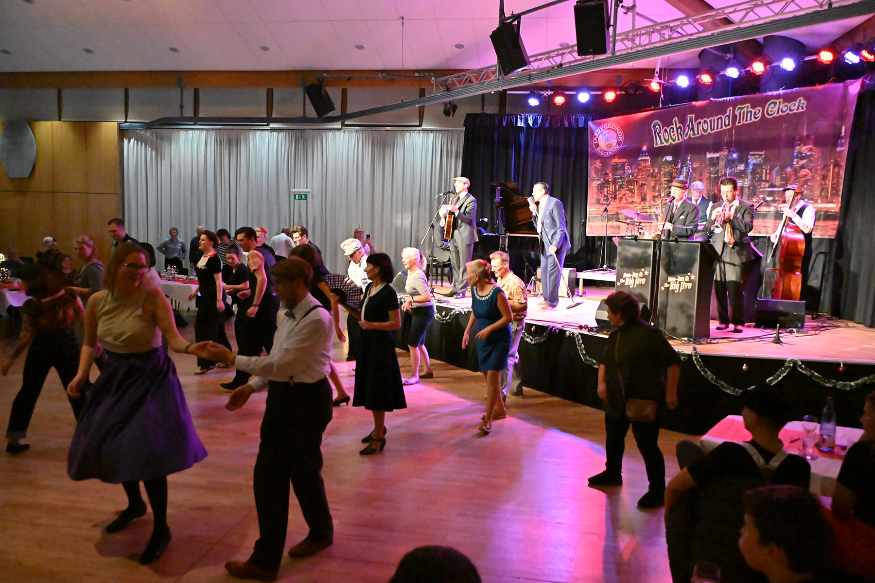 Bun-Jon & The Big Jive spielt Swing, Jump und Jive, also vor allem schwungvolle US-Tanzmusik im Stil der 1930er und 1940er Jahre, mit Titeln unter anderem in der Tradition von Louis Jordan, Nat King Cole und Ray Charles. Im Programm fanden sich auch Stücke in Anlehnung an Louis Prima, der am heutigen Sonntag, 7. Dezember, seinen 115. Geburtstag gehabt hätte. Entsprechend erschien auch das Publikum: Viele der Tänzer hatten sich stilvoll an der Mode jener Zeit orientiert, was das Gesamtbild auf der Tanzfläche zusätzlich prägte.