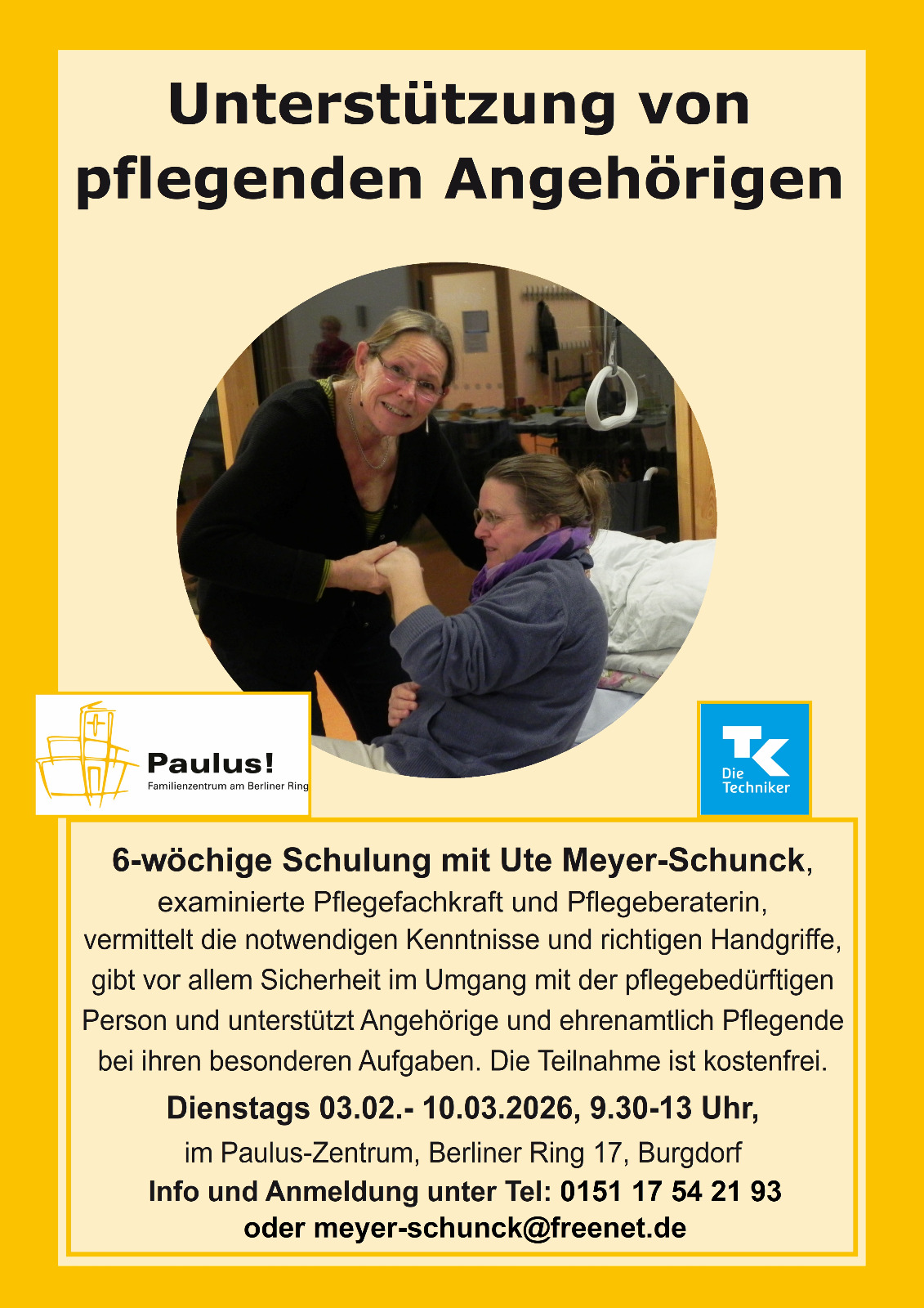 Pflegebedürftigkeit kann jeden treffen, plötzlich nach einem Unfall oder schleichend durch Krankheit oder Alter. Viele Menschen wünschen sich, in den eigenen vier Wänden versorgt zu werden. Damit häusliche Pflege gelingt, brauchen Angehörige und ehrenamtliche Pflegepersonen Wissen, Sicherheit und Unterstützung. Unter dem Titel „Unterstützung von pflegenden Angehörigen und ehrenamtlichen Pflegepersonen im Alltag“ bietet das Paulus-Familienzentrum ab Dienstag, 3. Februar 2026, einen sechsteiligen Pflegekurs an. Die Treffen finden jeweils dienstags von 9:30 bis 13 Uhr statt. Kursleiterin ist Ute Meyer-Schunck, examinierte Pflegefachkraft und Pflegeberaterin mit langjähriger Erfahrung in der häuslichen Pflege.