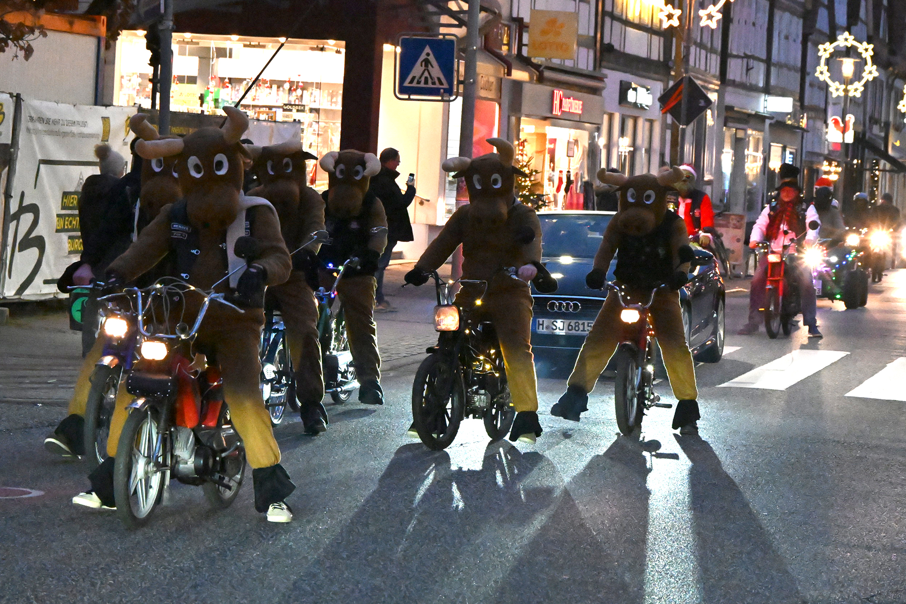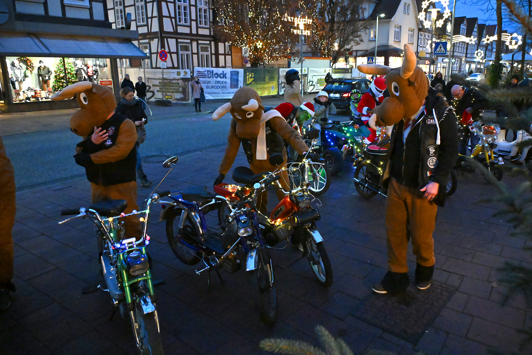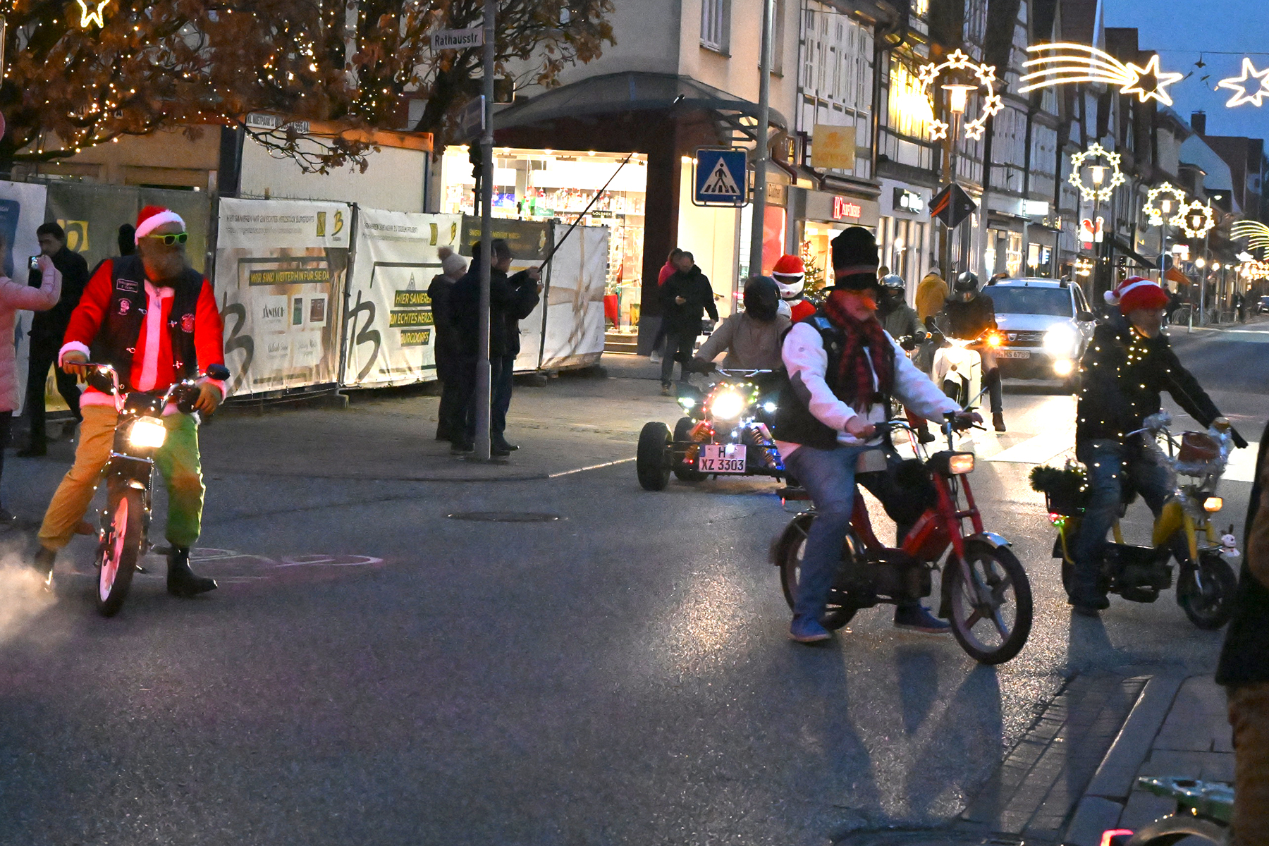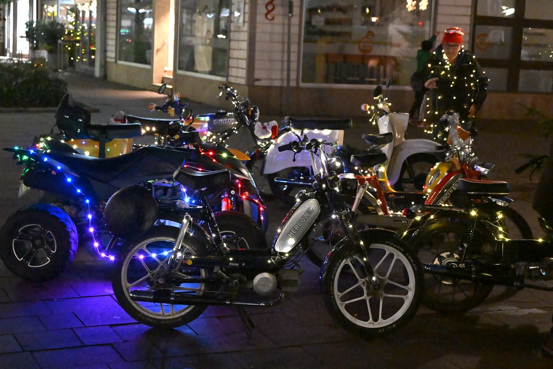 Nach der Premiere im vergangenen Jahr sind die Mitglieder des Mofaclubs „Zündaussetzer“ zu einer kleinen vorweihnachtlichen Ausfahrt zusammengekommen. In bunten Verkleidungen und mit Lichtern an ihren Zweirädern sorgten sie erneut für staunende Blicke in der Burgdorfer Innenstadt.