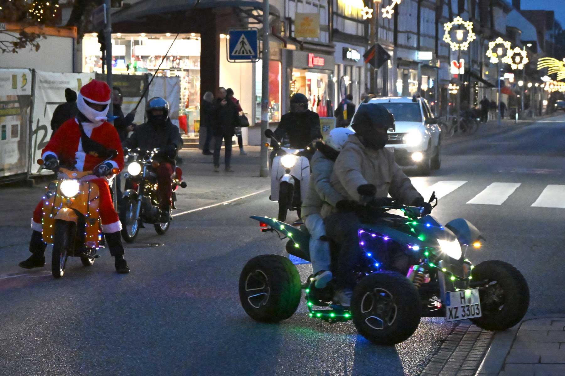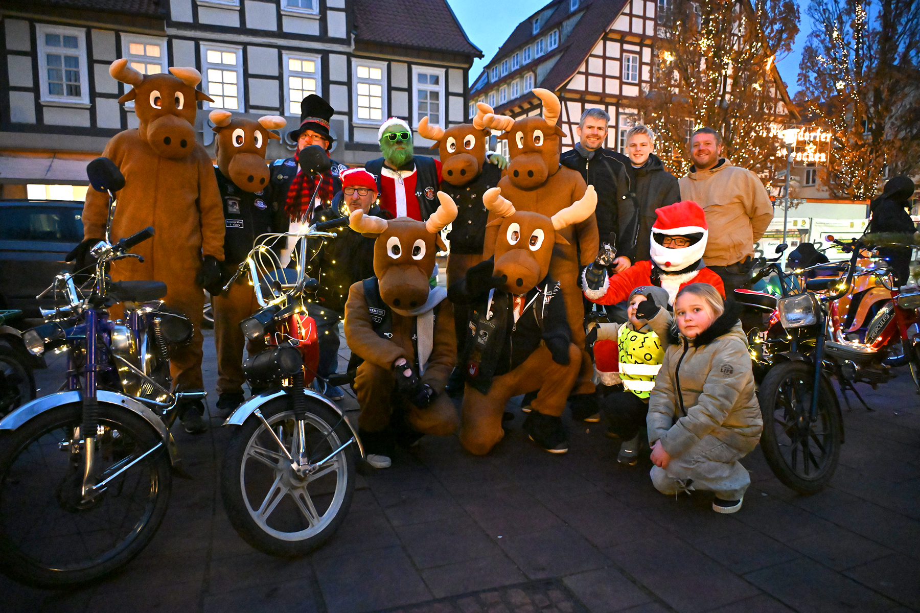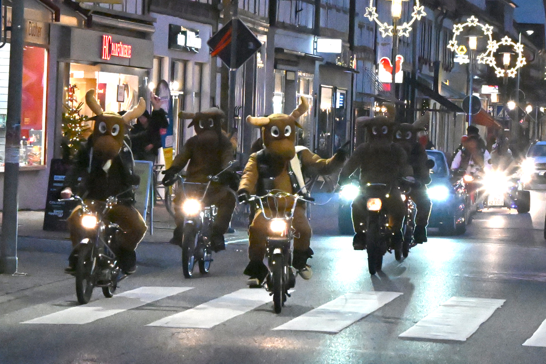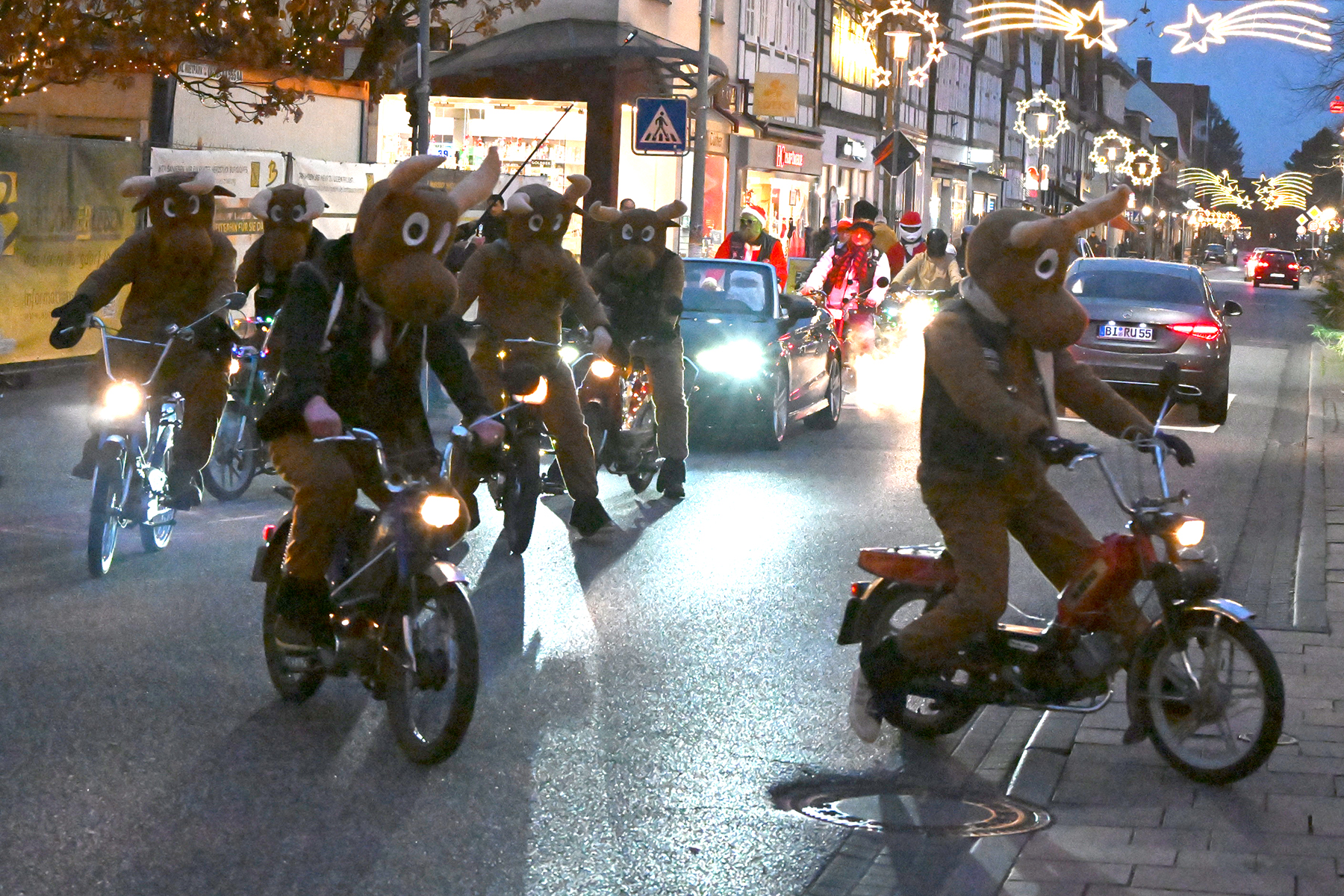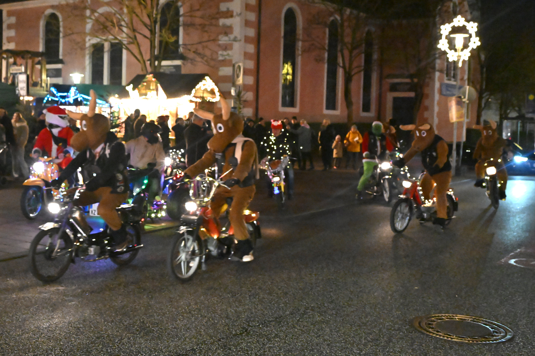 Nach der Premiere im vergangenen Jahr sind die Mitglieder des Mofaclubs „Zündaussetzer“ zu einer kleinen vorweihnachtlichen Ausfahrt zusammengekommen. In bunten Verkleidungen und mit Lichtern an ihren Zweirädern sorgten sie erneut für staunende Blicke in der Burgdorfer Innenstadt.