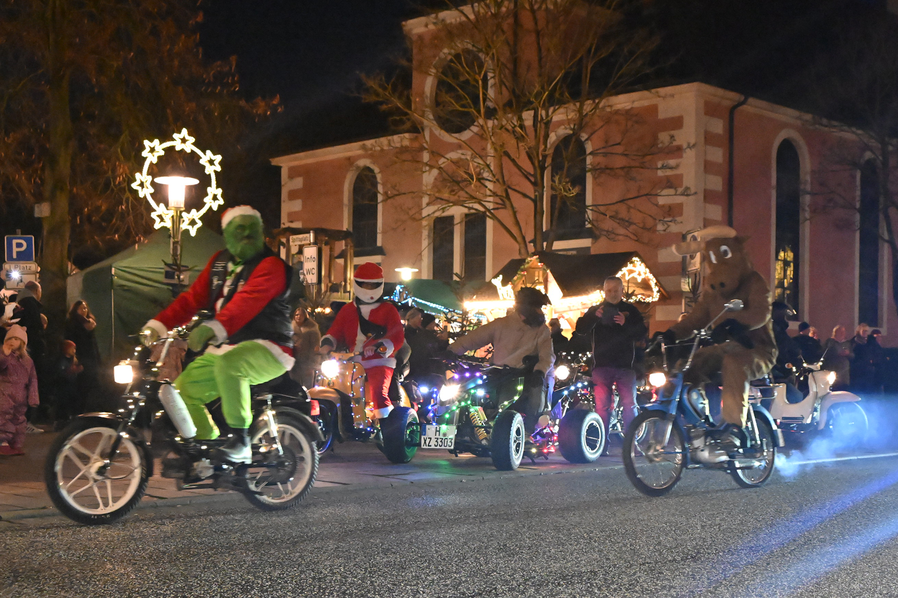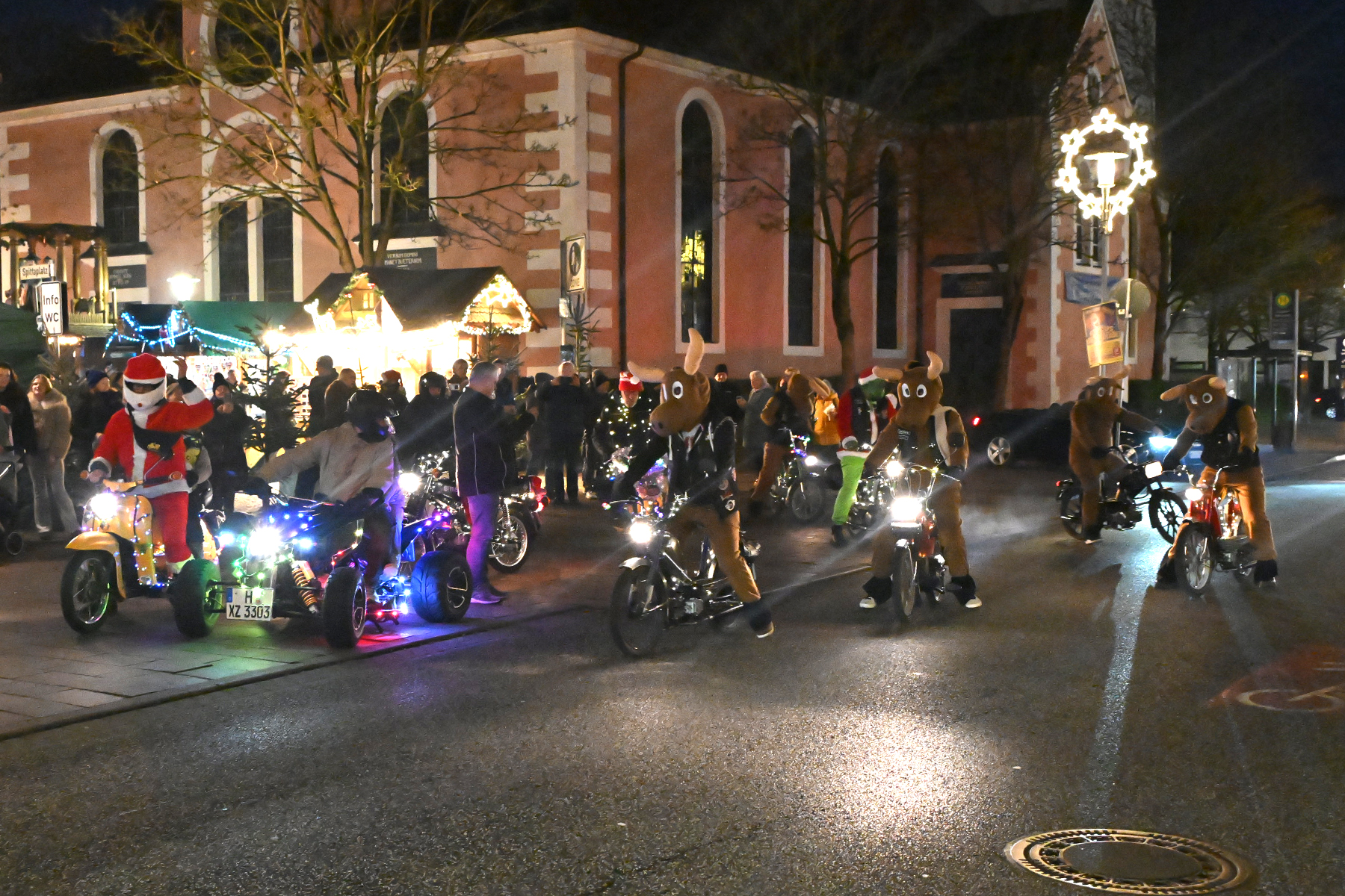 Am gestrigen Sonnabend, 20. Dezember, warteten nach Einbruch der Dunkelheit bereits dutzende Zuschauer in der Burgdorfer Marktstraße. Sie wussten, dass die „Zündaussetzer“ wie im Vorjahr wieder mit Lichterketten geschmückt und in Verkleidungen durch die Stadt fahren würden. Mit dabei waren erneut der Weihnachtsmann, der Grinch, Knecht Ruprecht sowie zahlreiche als Rentiere verkleidete Fahrer. Die Fahrt führte zunächst durch die Innenstadt und anschließend weiter zum Weihnachtsmarkt auf dem Spittaplatz, wo einige Zuschauer die Gelegenheit nutzten, Fotos zu machen.