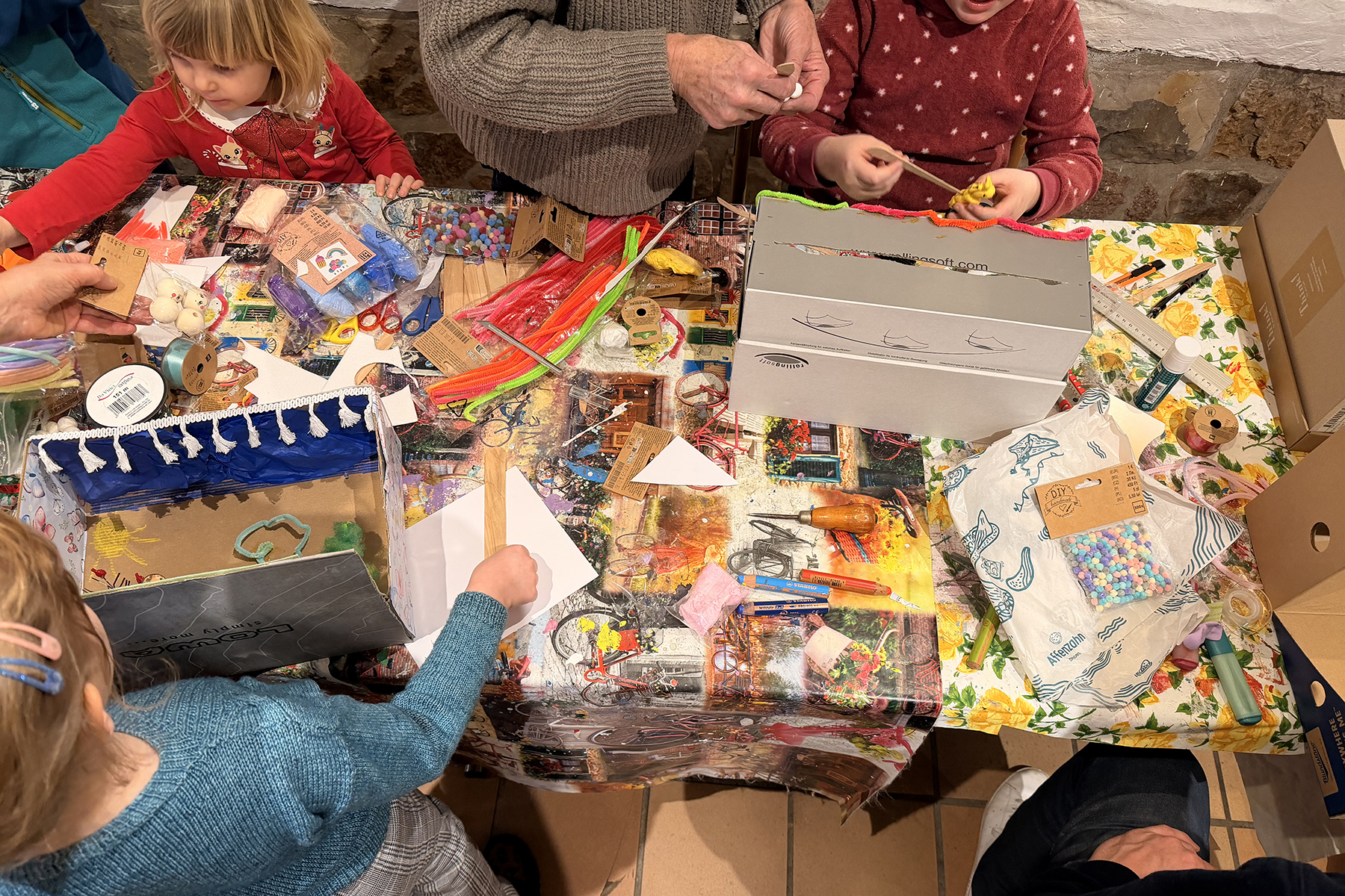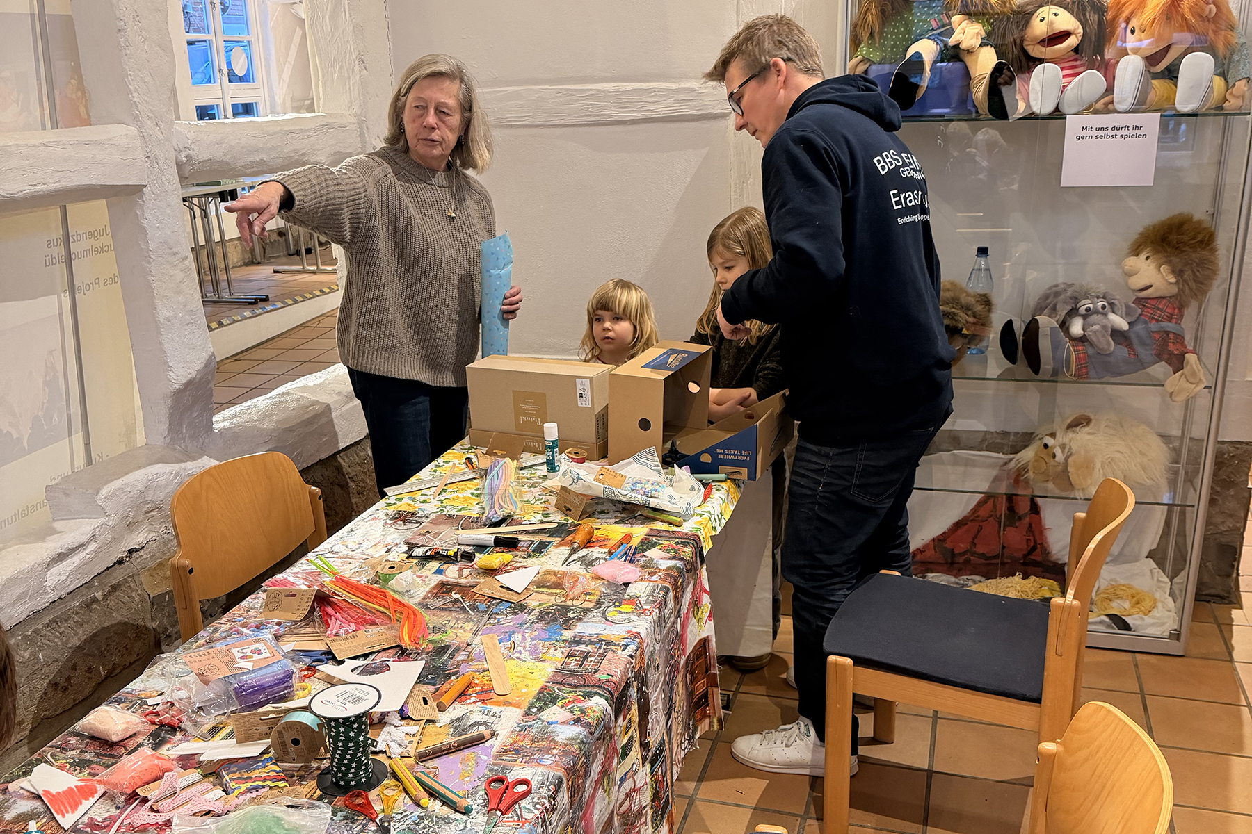 Besonders gefragt war gleich zu Beginn die erste Mitmachaktion, das „Schuhkarton-Theater“. Mit viel Fantasie verwandelten die jungen Besucher einfache Kartons in kleine Bühnen und ließen eigene Mini-Theaterwelten entstehen. Der große Andrang zeigte schnell: Kreatives Mitmachen ist bei dieser Ausstellung ausdrücklich erwünscht – und wird begeistert angenommen.