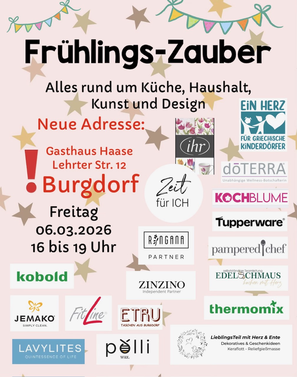 Am Freitag, 6. März 2026, lädt die Weststadt in Burgdorf zu einer kleinen Haushaltsmesse unter dem Titel „Frühlingszauber“ ein. Die Veranstaltung findet von 16 bis 19 Uhr im Gasthaus Haase an der Lehrter Straße 12 statt und ist als offener Nachmittag zum Stöbern, Shoppen und Austauschen angelegt.