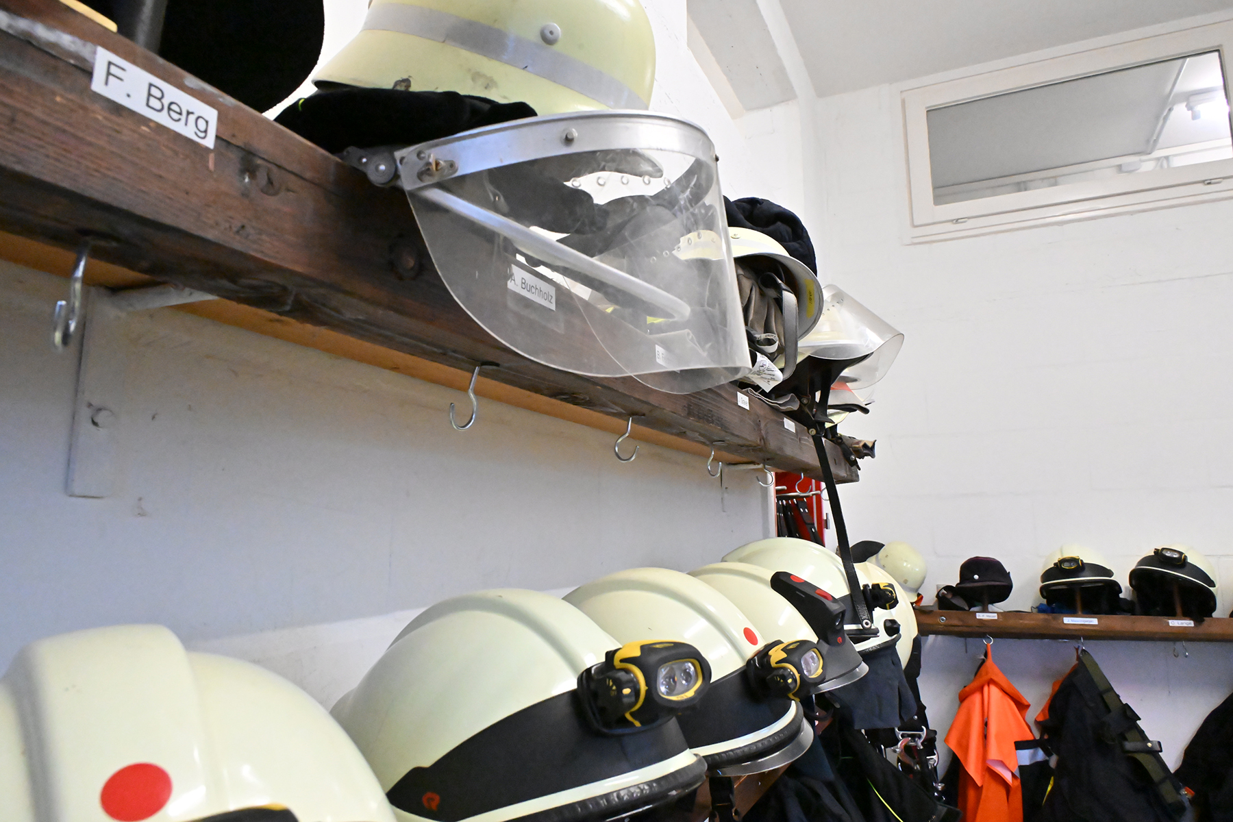 „Die Helme sind schon in zwei Ebenen gelagert“, so Arne Asseburg. Für die Kleidung ist für die ehrenamtlichen Einsatzkräfte dann nicht genügend Platz, auch wenn mittlerweile mitten im Raum auch noch ein Umkleide-Gestell steht, wie man es aus Turnhallen kennt.