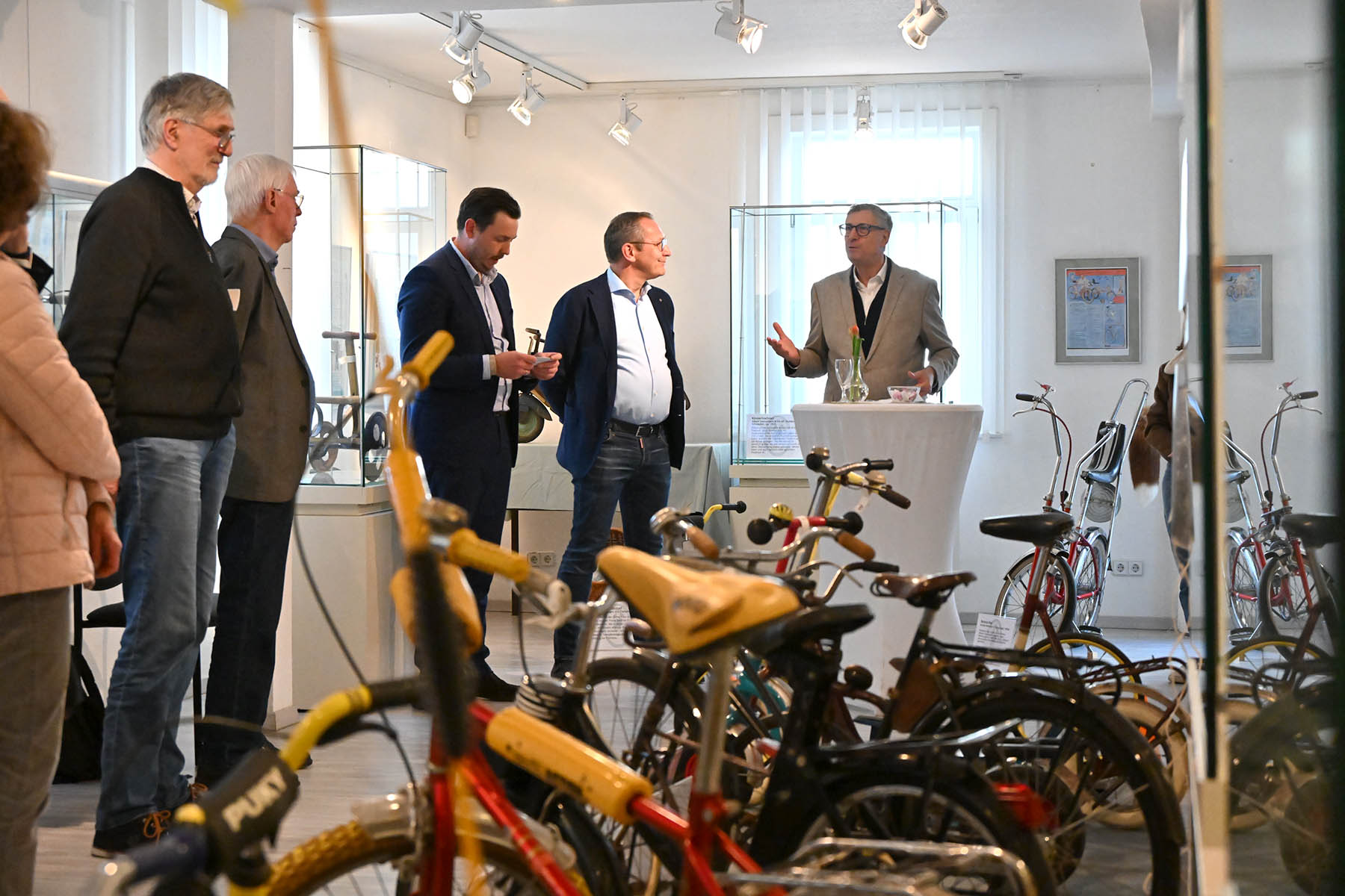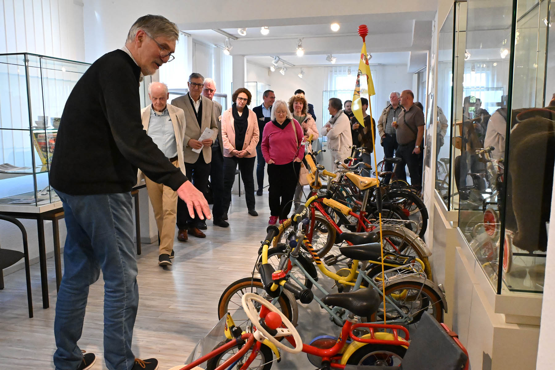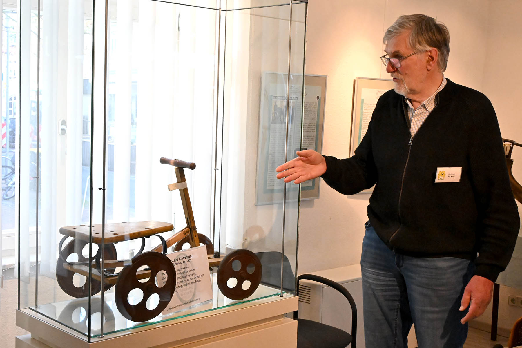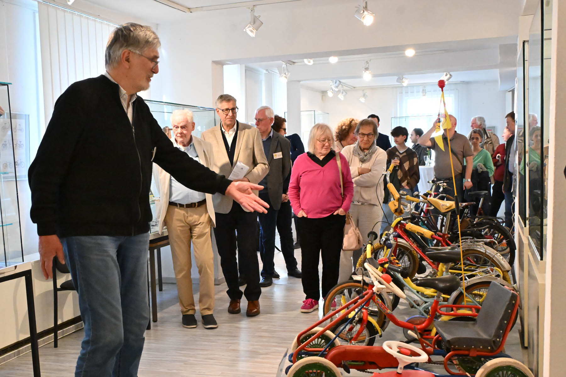 Gerhard Rickert führte anschließend in die Ausstellung ein und gab einen ersten Einblick in die Geschichte der Exponate. Das bemerkenswerte Hochrad, das vermutlich aus dem 19. Jahrhundert stammt, wurde im Heimatmuseum Linderte entdeckt und konnte von dort ausgeliehen werden. Über die Anfänge des Kinderfahrrads herrsche bis heute Ungewissheit – in der Literatur gilt das „Peugeot Enfant“ von 1904 als erstes Kinderfahrrad, doch die Unterlagen der Radfahrgalerie enthalten ein Foto aus München, das einen Jungen auf einem Kinderrad von 1895 zeigt. Rickert ließ dabei auch eine persönliche Bemerkung fallen: „Wir hätten auch das Stadtmuseum voll bekommen.“