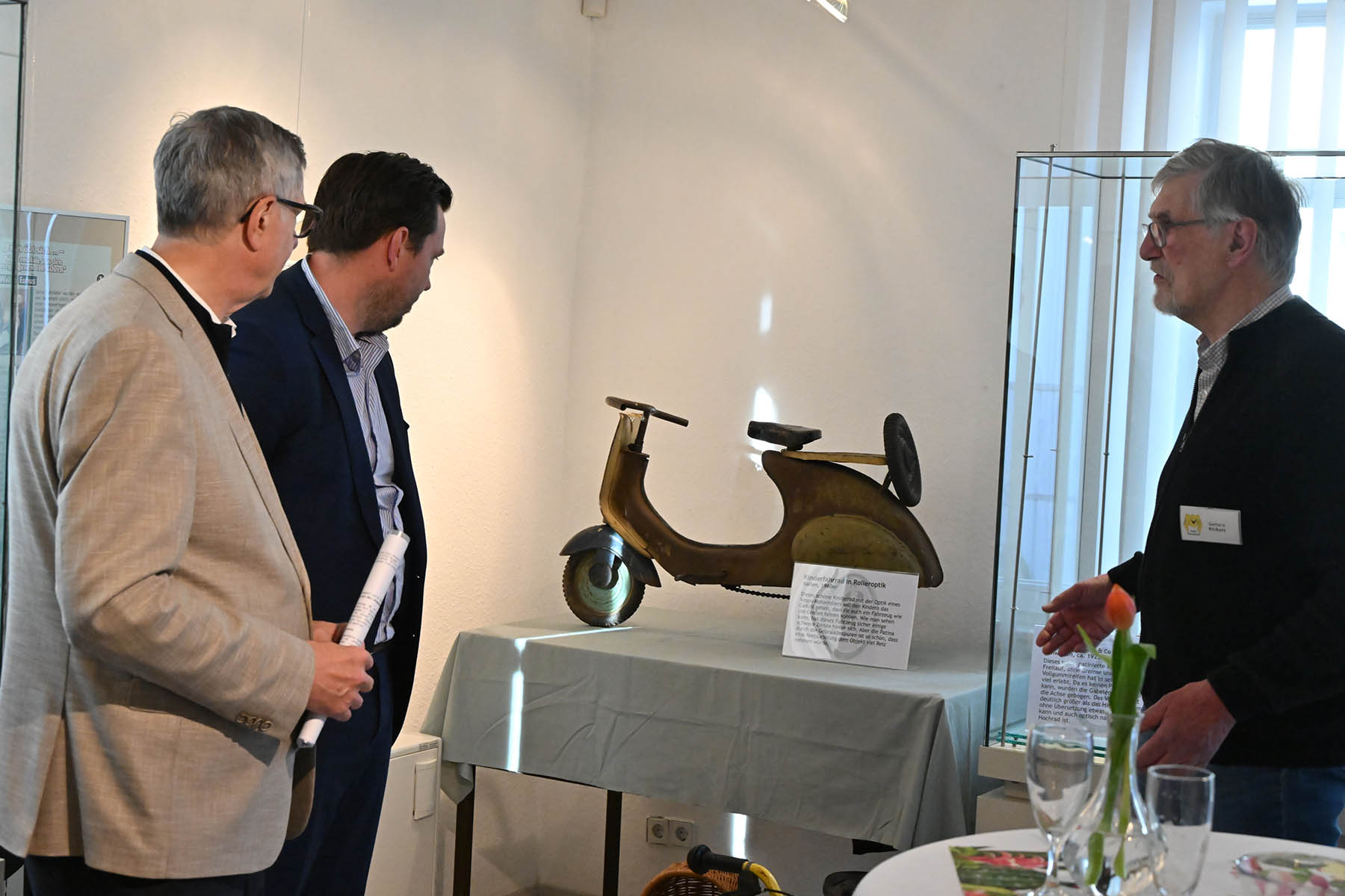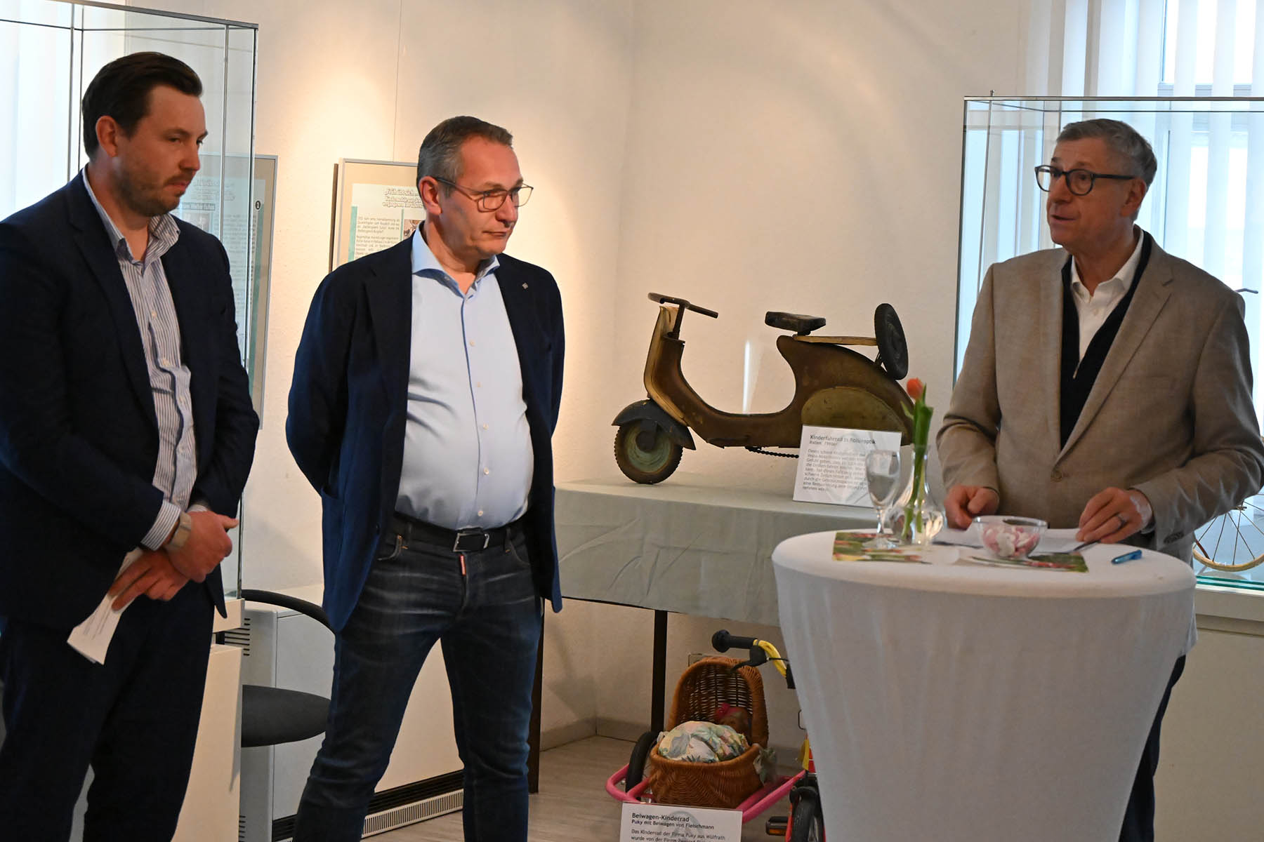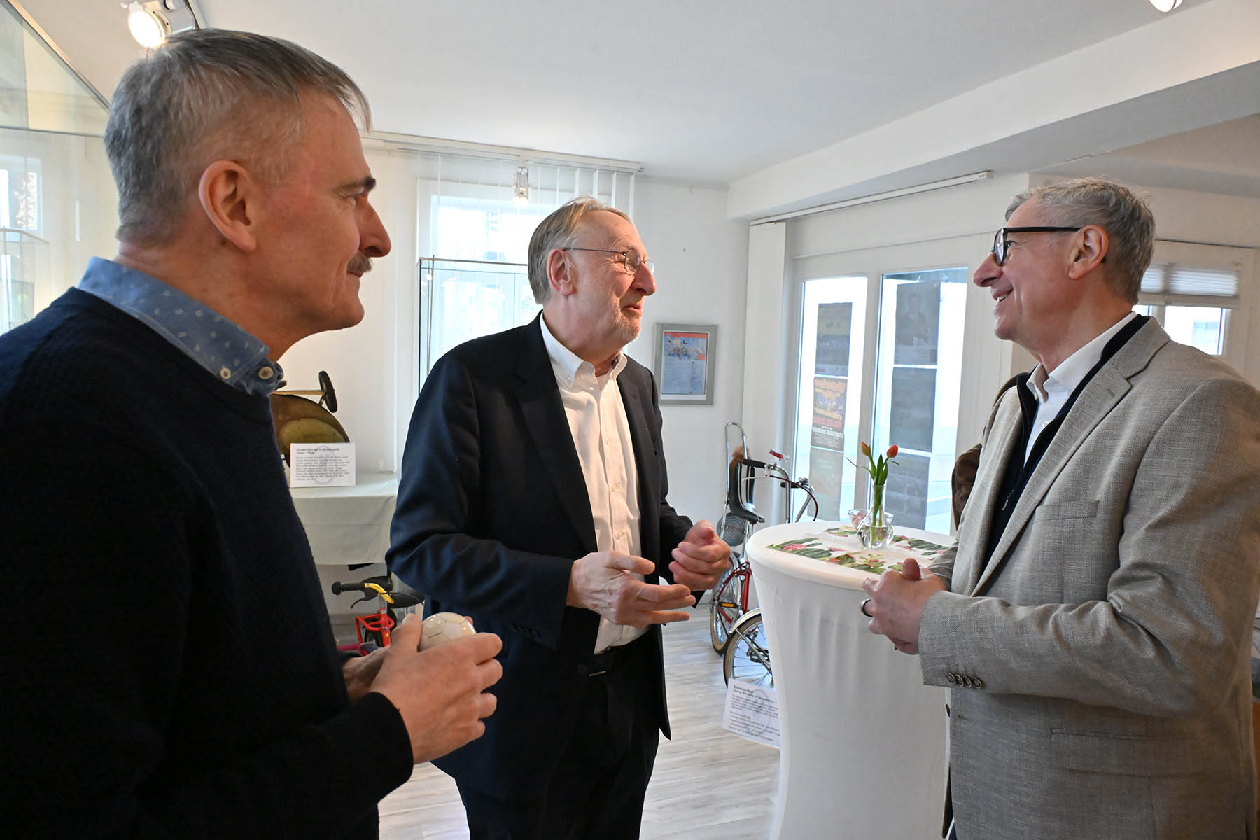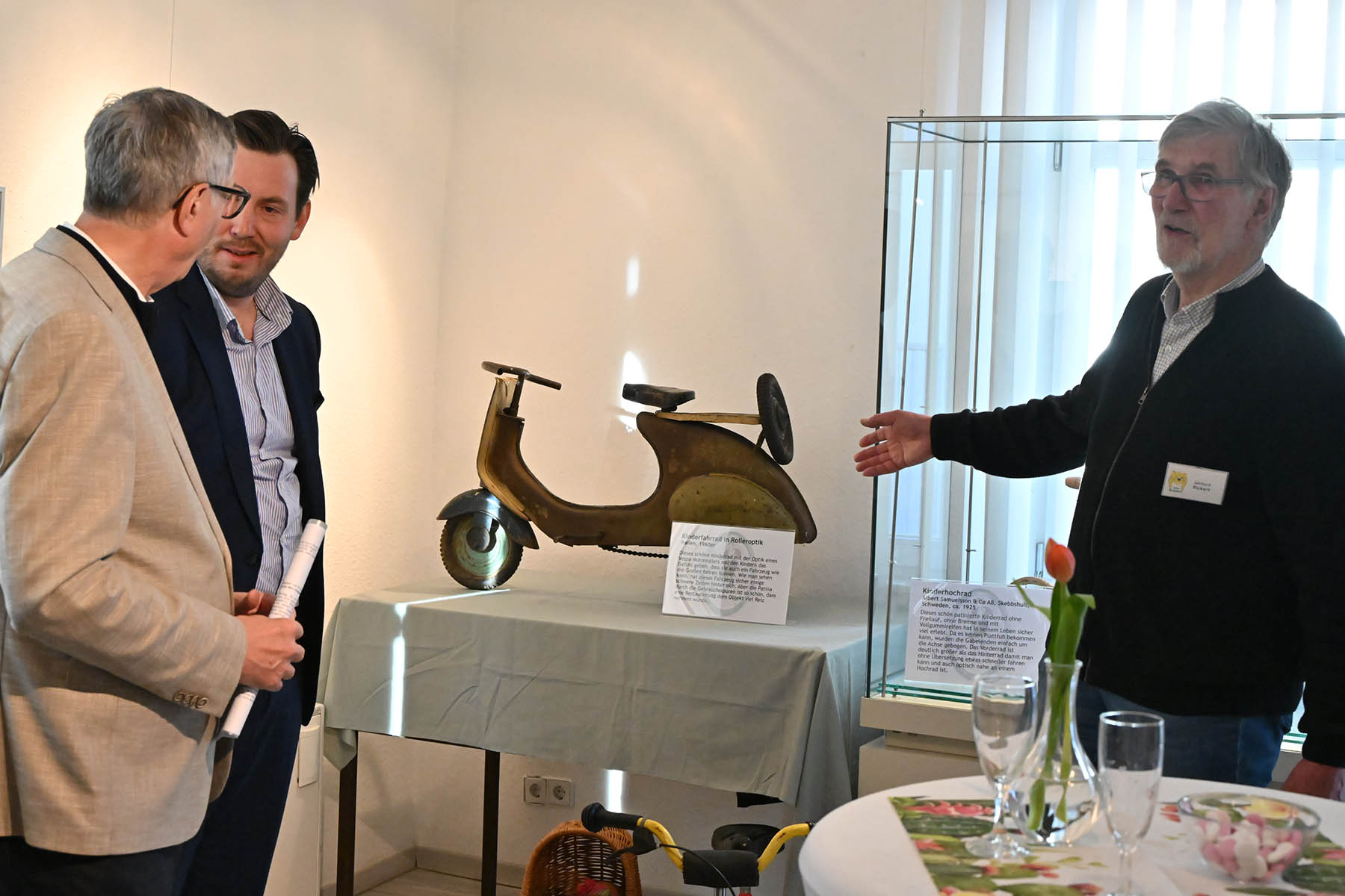 Gerhard Rickert führte anschließend in die Ausstellung ein und gab einen ersten Einblick in die Geschichte der Exponate. Das bemerkenswerte Hochrad, das vermutlich aus dem 19. Jahrhundert stammt, wurde im Heimatmuseum Linderte entdeckt und konnte von dort ausgeliehen werden. Über die Anfänge des Kinderfahrrads herrsche bis heute Ungewissheit – in der Literatur gilt das „Peugeot Enfant“ von 1904 als erstes Kinderfahrrad, doch die Unterlagen der Radfahrgalerie enthalten ein Foto aus München, das einen Jungen auf einem Kinderrad von 1895 zeigt. Rickert ließ dabei auch eine persönliche Bemerkung fallen: „Wir hätten auch das Stadtmuseum voll bekommen.“