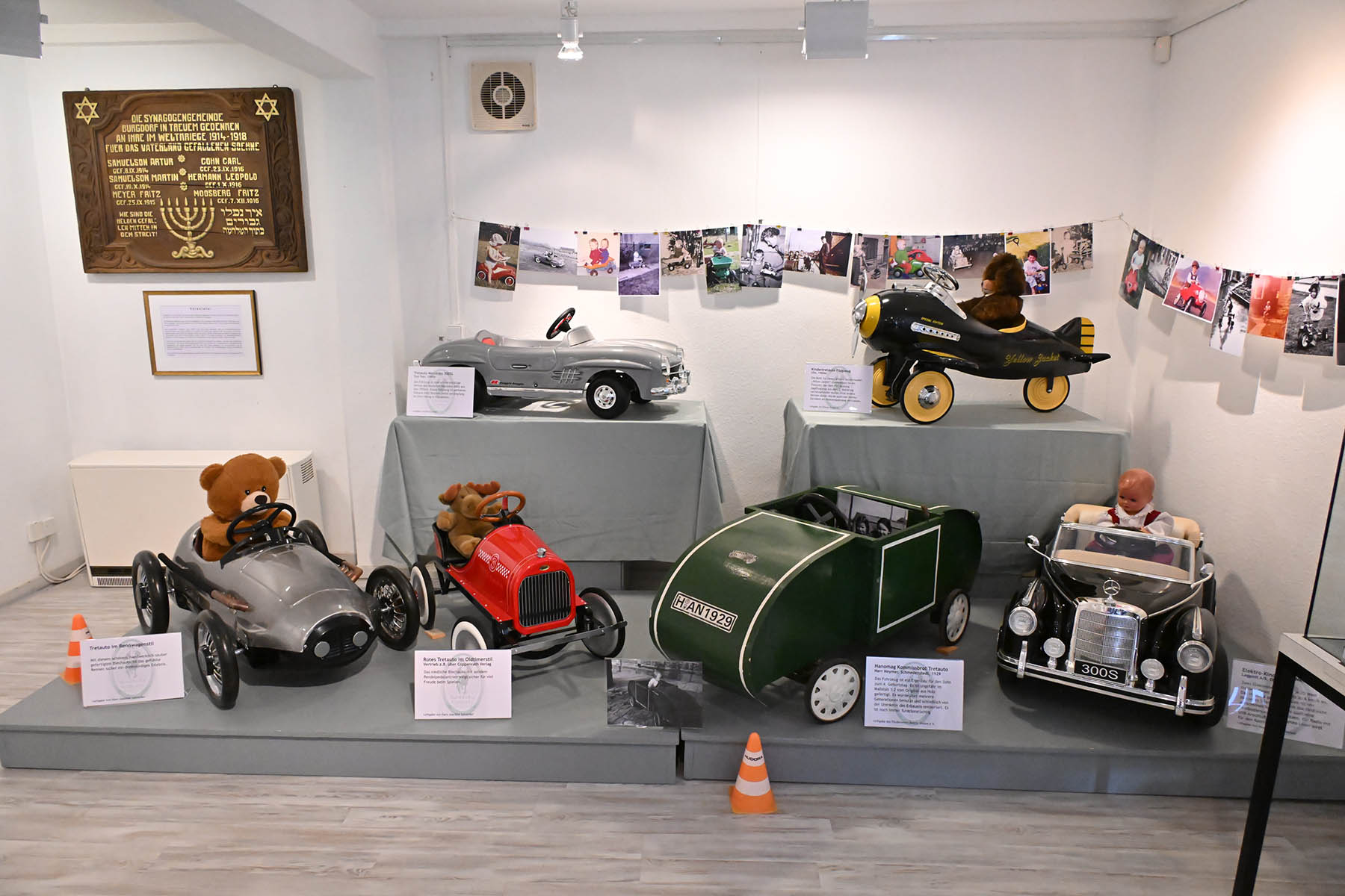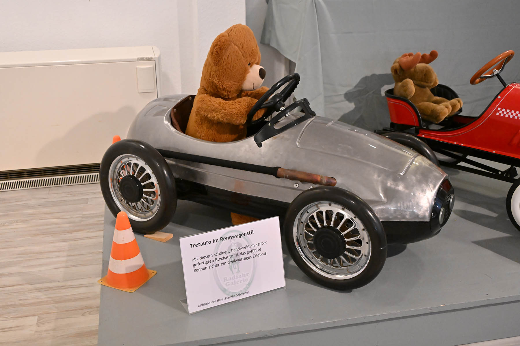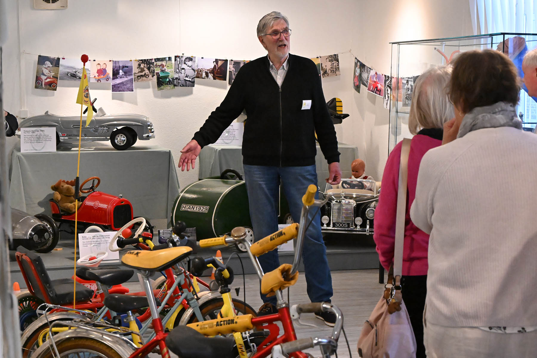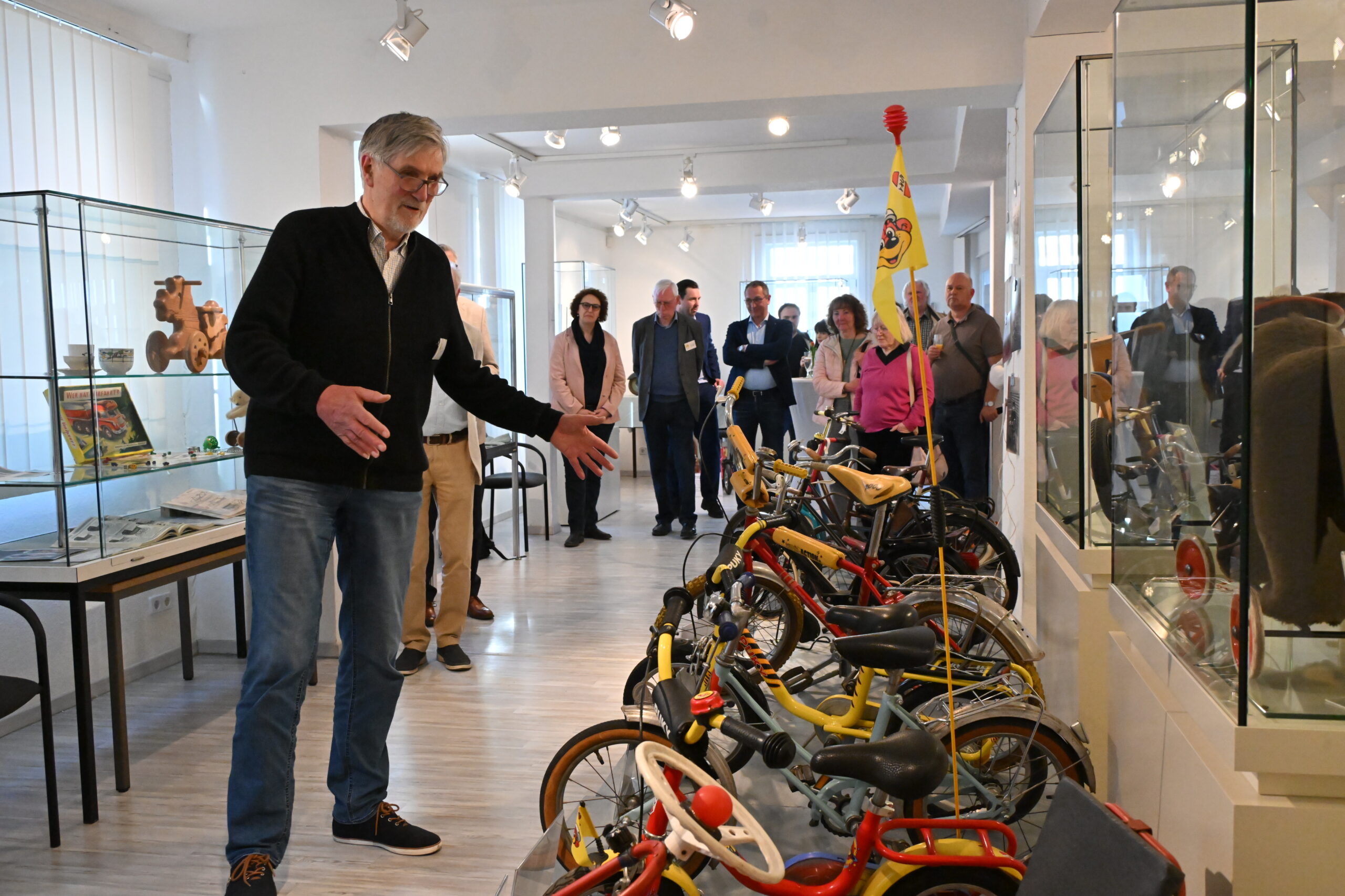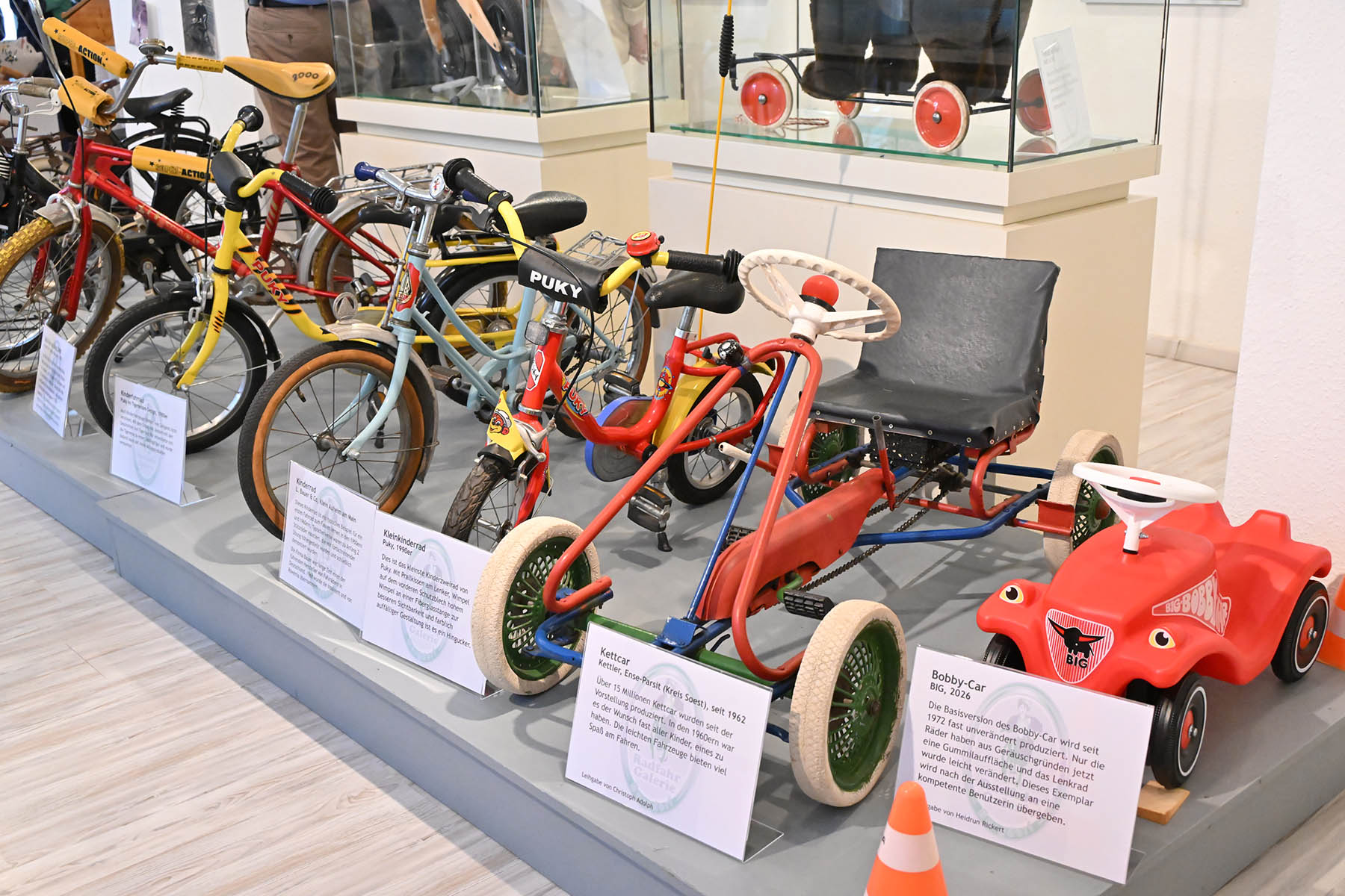 Was den Reiz der Ausstellung ausmache, brachte er so auf den Punkt: Viele Exponate tragen sichtbare Spuren ihrer Nutzung. „Da fragt man sich, wer es mal gefahren ist und was das Rad erlebt hat – das macht den Charme aus.“ Pollehn hob auch die seltenen Stücke hervor: ein Hochrad aus dem Jahr 1895, ein Kinderauto aus dem Jahr 1929 sowie ein Elektro-Kinderauto im Stil eines Mercedes-Benz-Oldtimers – mit Radio. Die Bandbreite reiche von internationaler Vielfalt bis zu Fahrzeugen aus der DDR, von einem amerikanischen Tretauto in Flugzeugoptik bis zu modernen Elektrorollern. „Es wird durch die Ausstellung die Entwicklung deutlich – das ist eine Riesenentwicklung gewesen.“